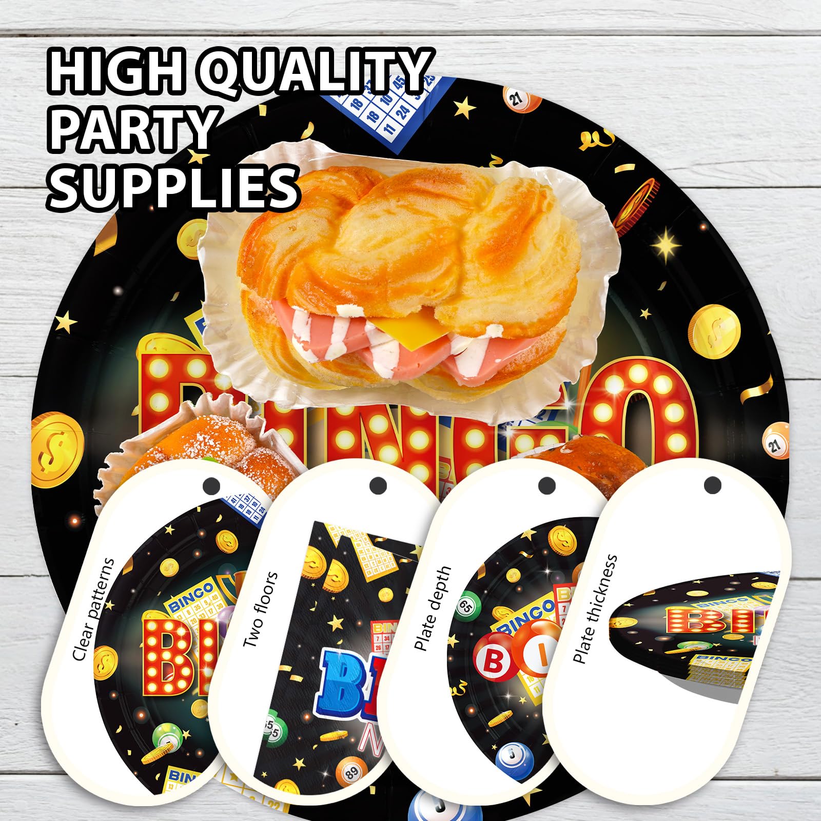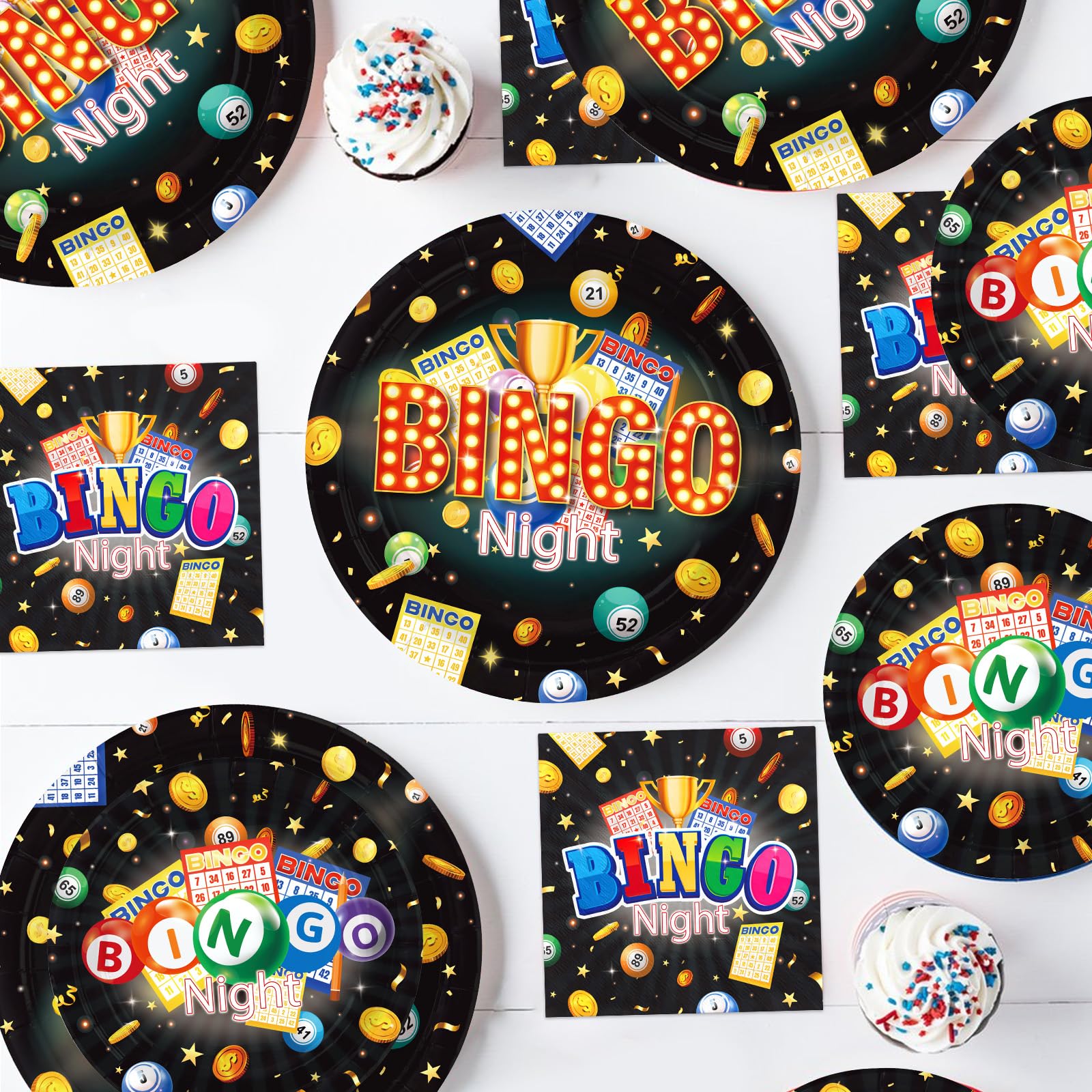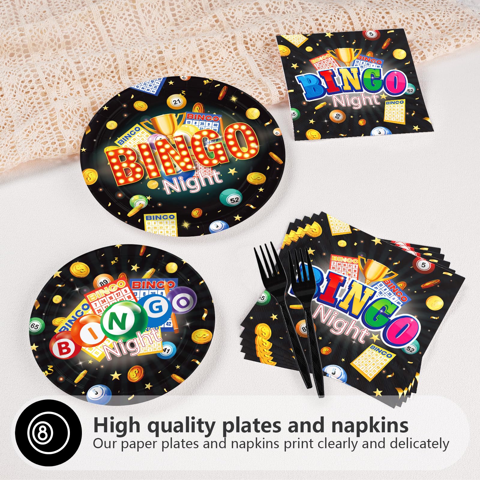 Complete 96-Piece Entertainment Set: Host hassle-free gatherings with this all-inclusive bingo night kit! Includes 24 premium black paper plates (9-inch), 24 bingo dessert paper plates (7-inch), 24 napkins (6.5-inch), and 24 durable plastic forks. The generous quantity supports medium to large groups, ensuring every guest has plates, utensils, and napkins. Neutral black bases allow vibrant food displays while maintaining a sophisticated atmosphere—perfect for bingo halls, pubs, or home game nights