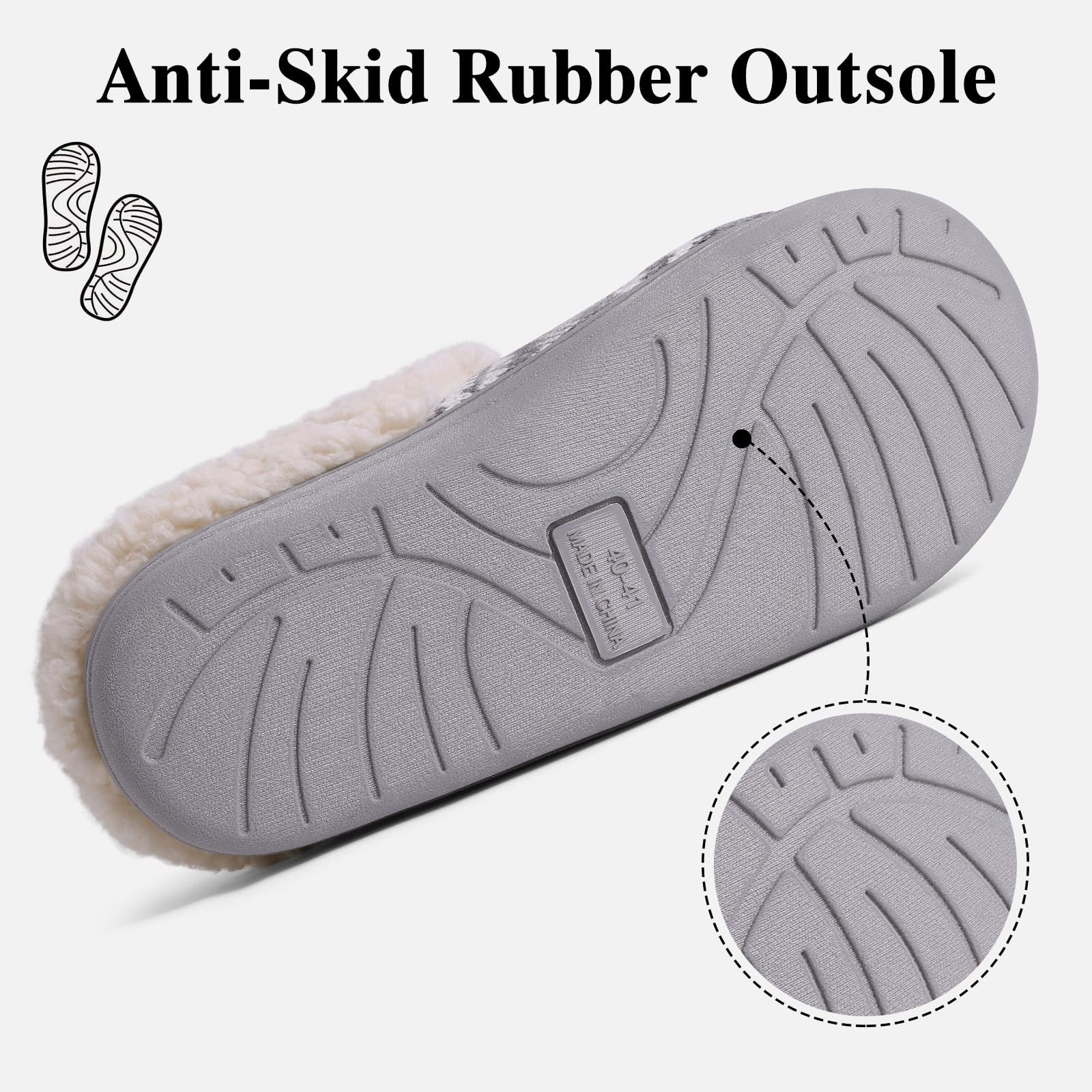 𝐈𝐧𝐝𝐨𝐨𝐫 & 𝐎𝐮𝐭𝐝𝐨𝐨𝐫: Durable waterproof rubber soles make these womens slippers great for indoor and outdoor use. Anti-skid texture in the bottom and no-slip fluffy lining gives you safe and secure footing.