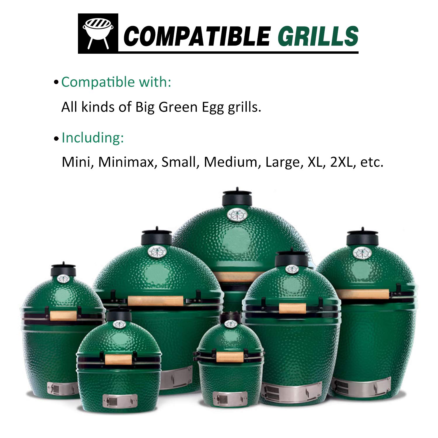 This temperature gauge, dedicated for charcoal grills, fits and can be easily installed on all sizes of Big Green Egg grills, including Mini, Mini-max, Small, Medium, Large, XL and 2XL, etc.