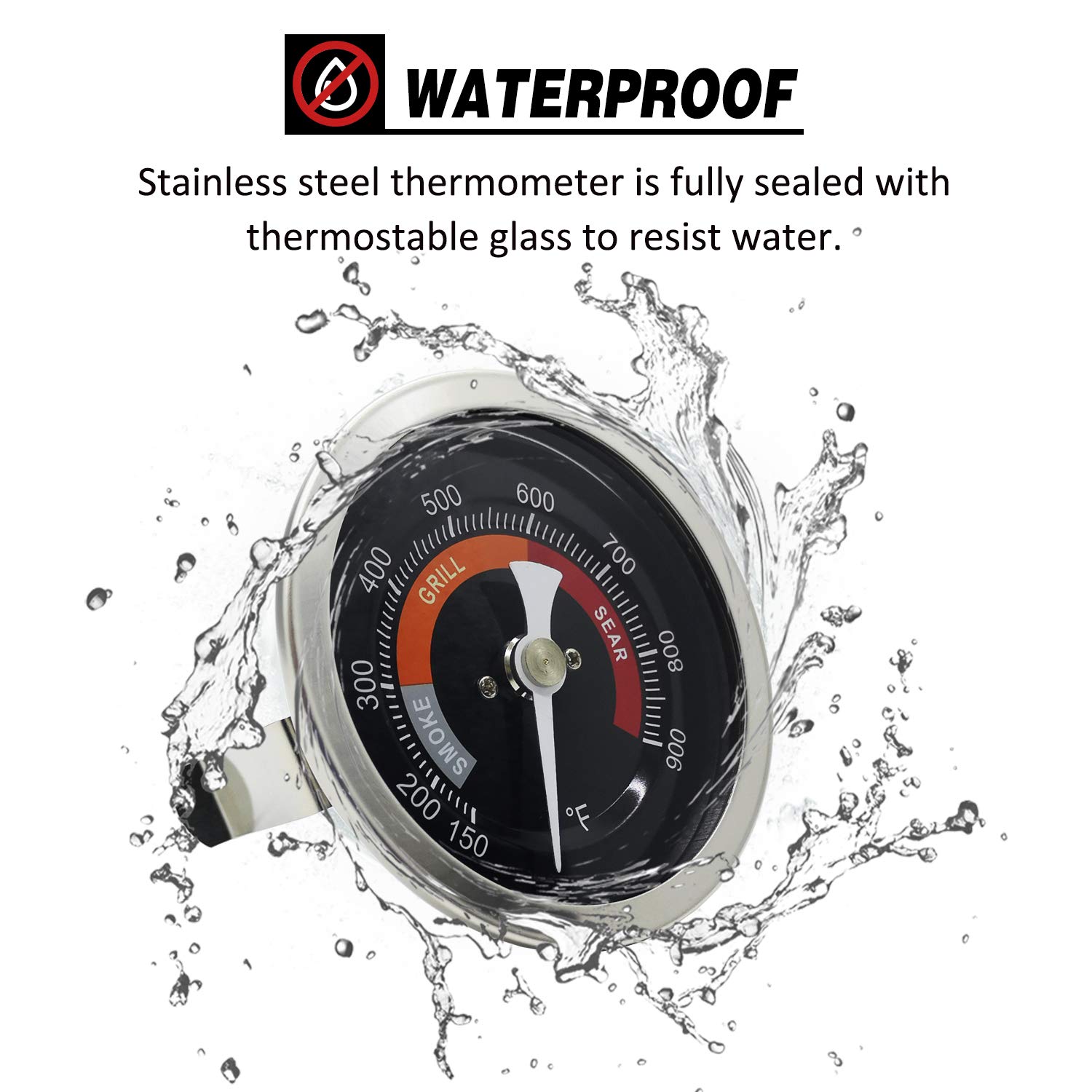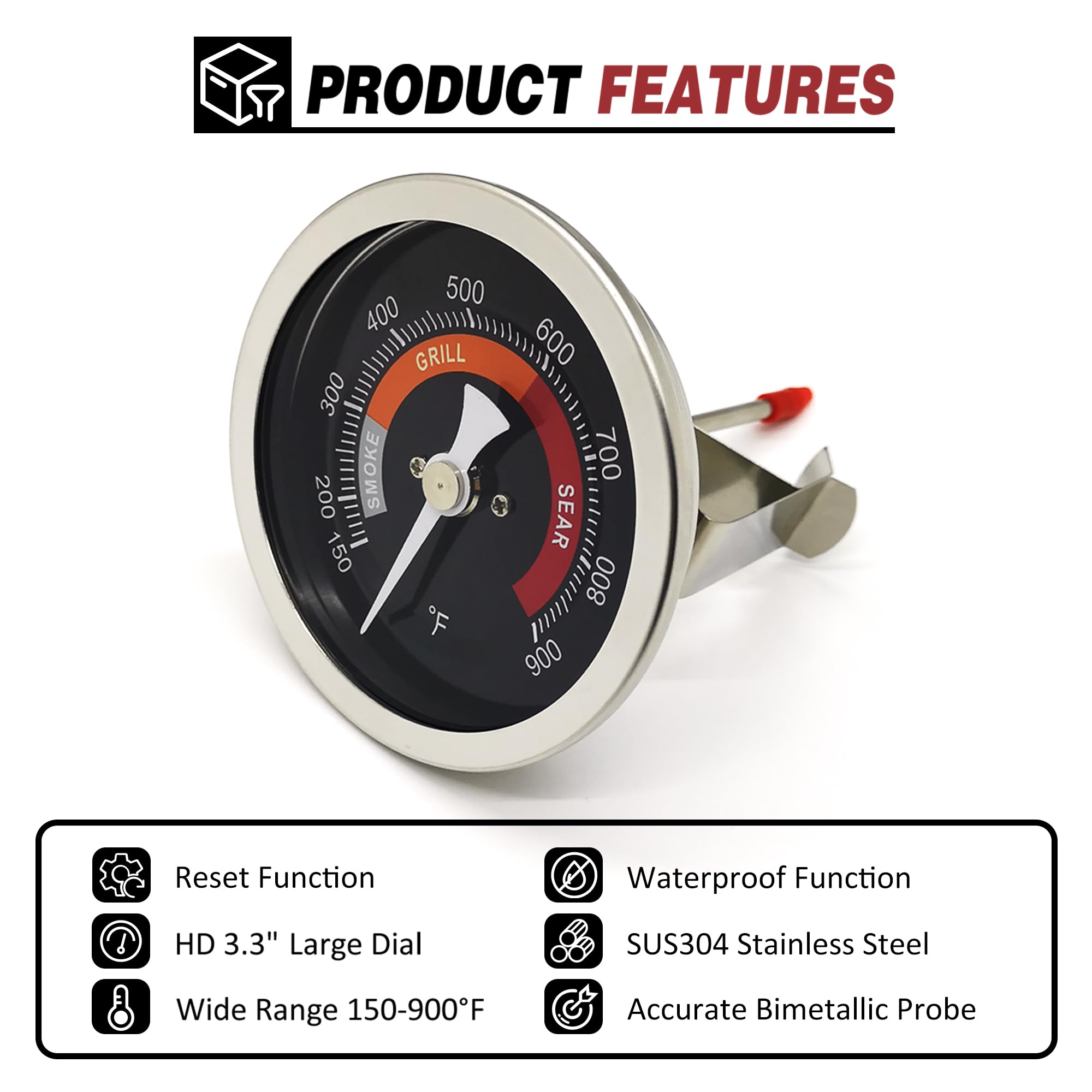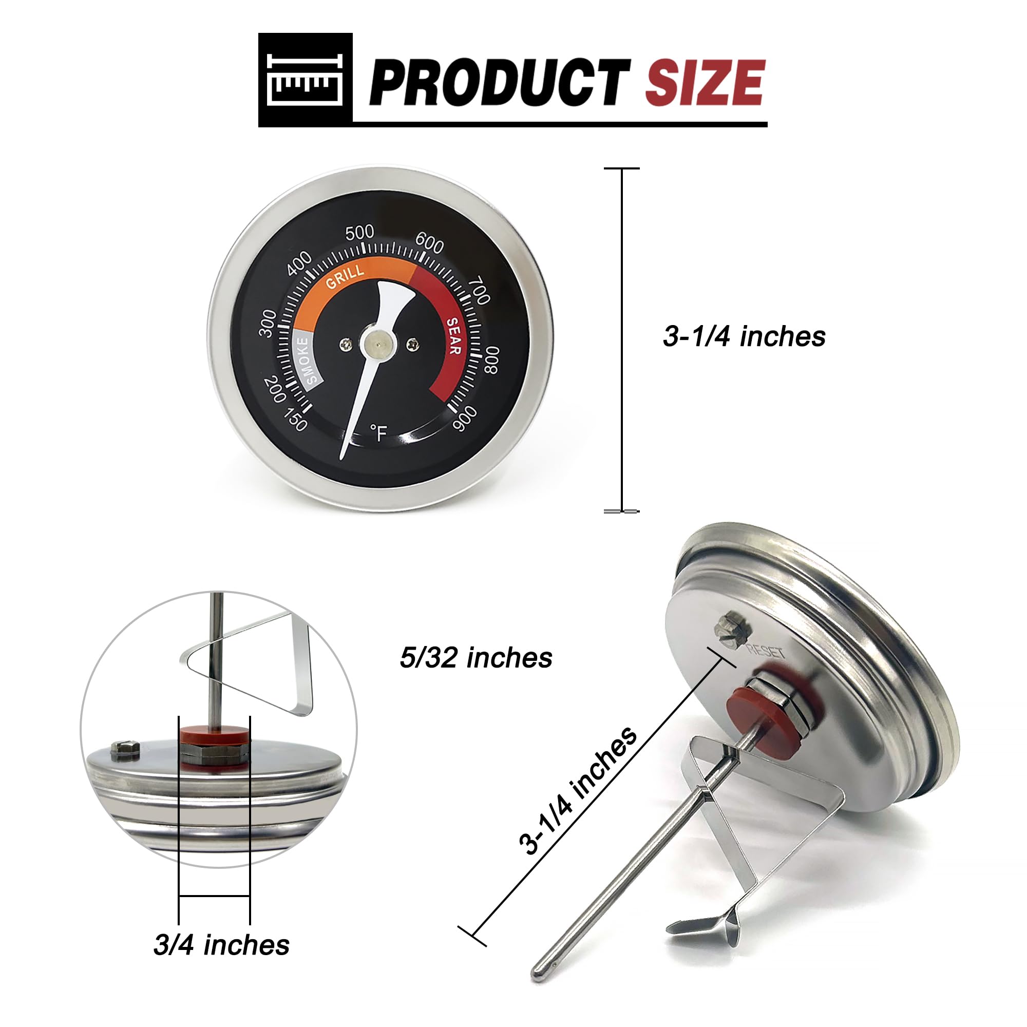 Superior replacement thermometer for all kinds of Big Green Egg grills, such as Mini, Minimax, Small, Medium, Large, XL, 2XL and so on. Package: -Installation Instructions x1 -Temperature Gauge x1 -Mounting Clip x1 -Silicone Gasket x1 Product Size: The diameter of the gauge dial is 3.3 inches. The diameter of the probe is 5/32 inch. The length of the probe is 3-1/4 inches. Features: -Accurate Measurement: Dedicated internal bimetallic design and the extended 3-1/4 inches long probe ensure the thermometer accurately reacts the temperature inside the grill. -Easy & Clear Reading: Its HD 3.3 inches large dial can make you read the temp markings in a glance from a normal distance. -Wider Measurement Range: It can measure from 150℉ to 900℉, wider range than the old original one. -Simple Installation: It will take a snap to remove the old thermometer from and install this new one on your grill. -Waterproof: It is hermetically sealed to resist the inflow of water. -Better Durability: Constructed with durable stainless steel and thermostable glass, this thermometer will work well for your EGG in its long-life service. If you have questions or problems about the item, please feel free to contact us at any time. We are always here to help you out!