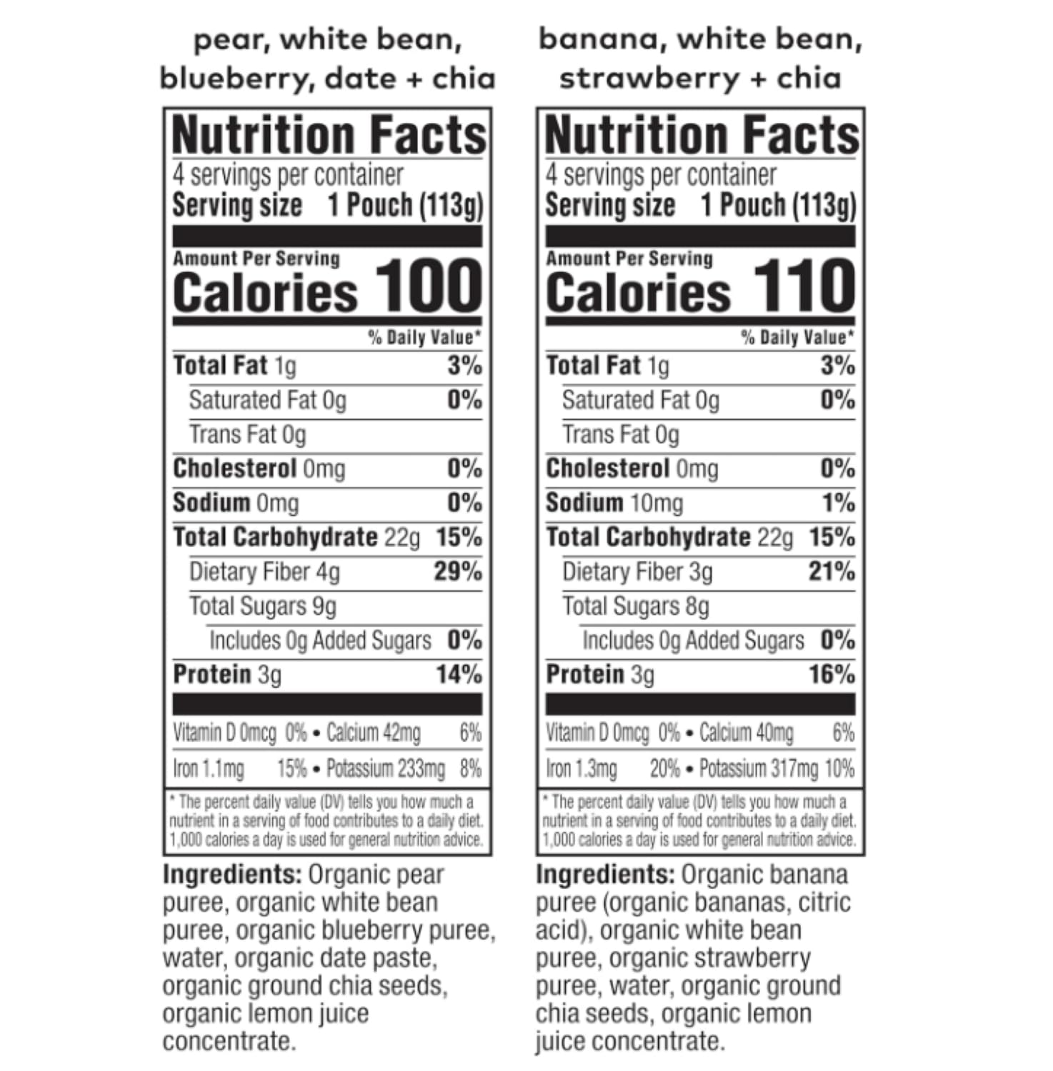 MADE WITH NATURAL FLAVORS: Pear, White Bean, Blueberry, Date, and Chia and Banana, White Bean, Strawberry, and Chia blends made with organic purees
