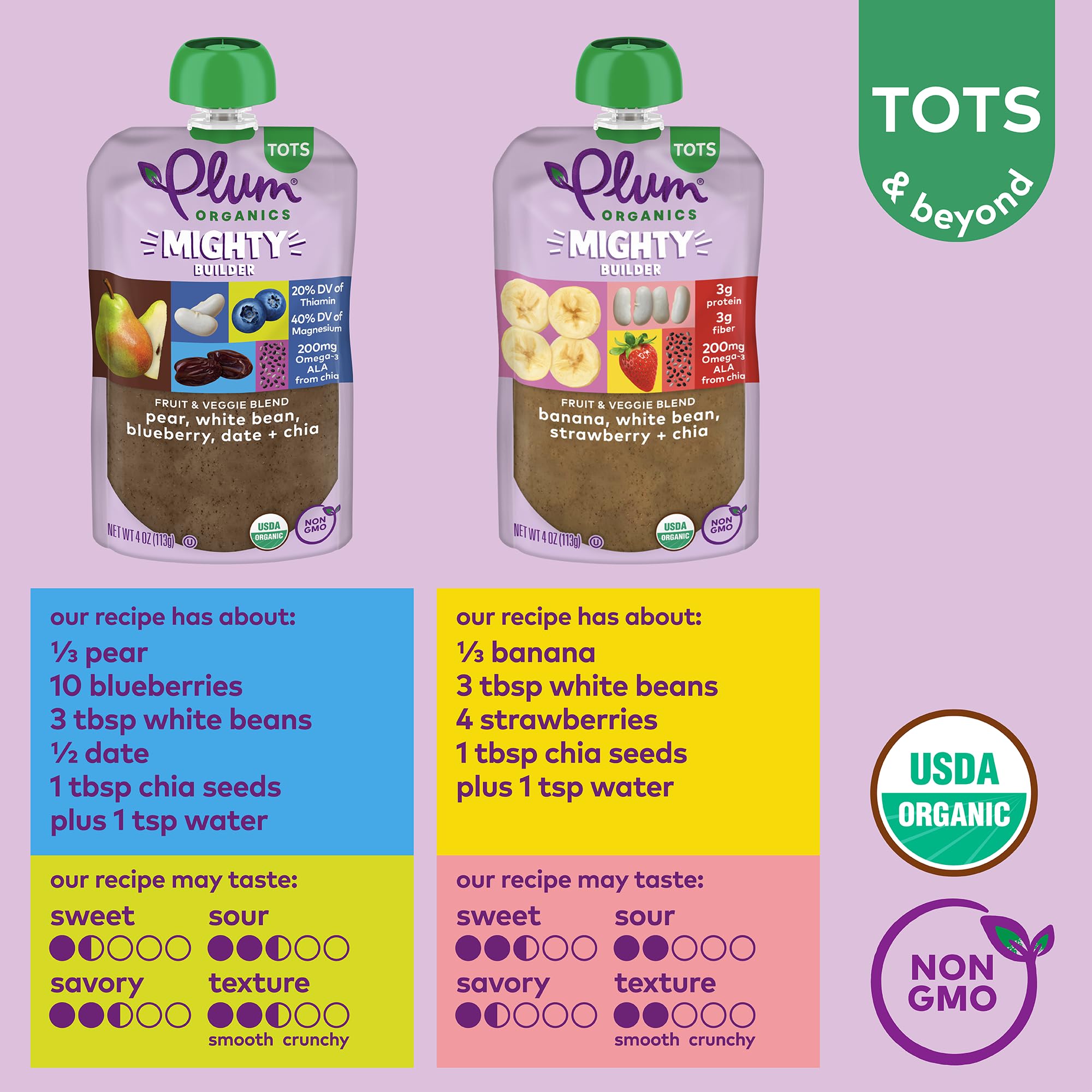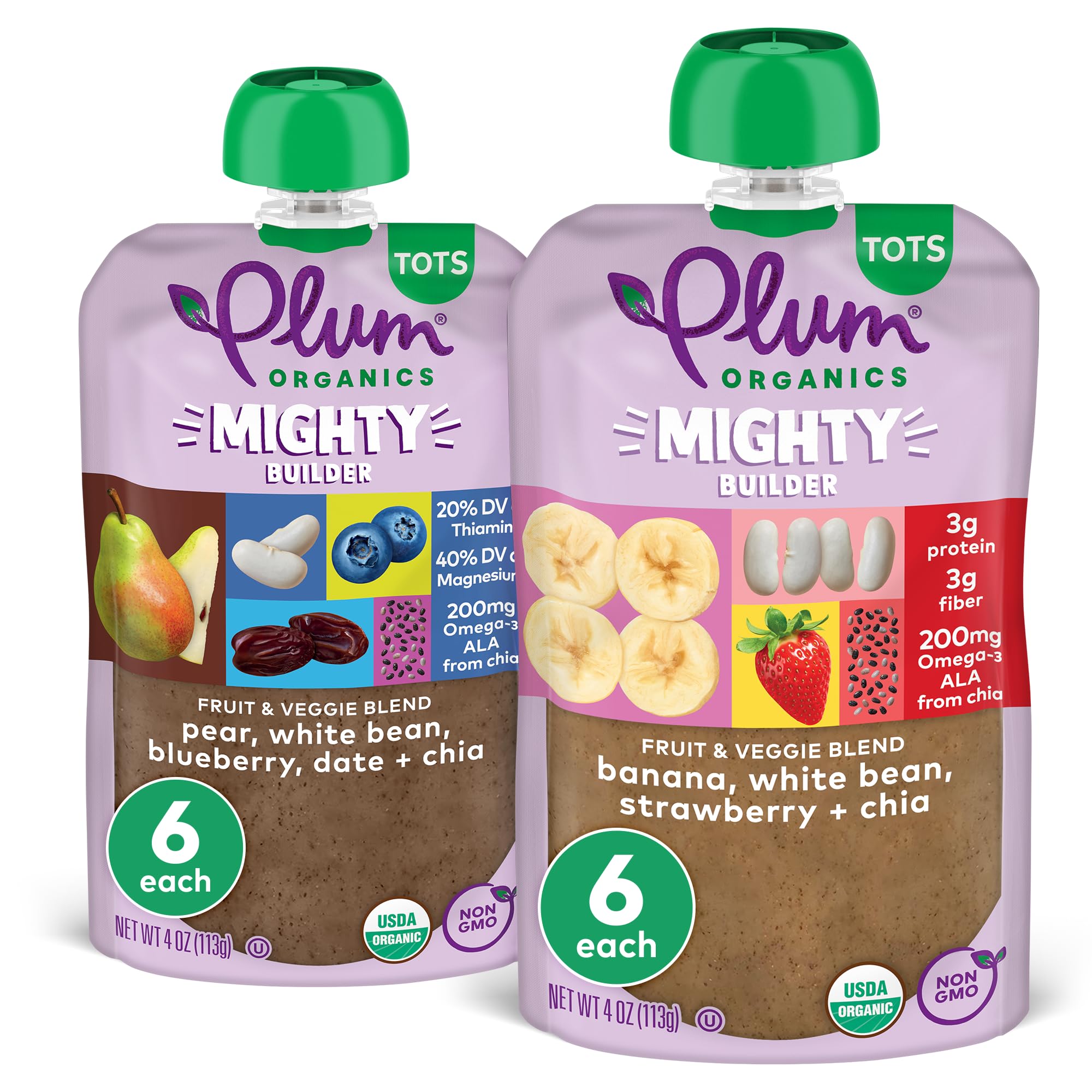 Mighty Blends for a Mighty Toddler. Plum Organics Mighty Builder Blends are filled with organic fruits, veggies, and seeds for the perfect snack to fuel your active toddler. Our Pear, White Bean, Blueberry, Date, and Chia blend and Banana, White Bean, Strawberry, and Chia blend are each made with non-GMO, organic ingredients for an organic toddler food that your toddler will love. Our Plum Organics pouches are naturally preserved, unsalted, unsweetened, and kosher parve. And since our baby food pouches are convenient, portable, and resealable, you can customize portion sizes, whether you're at home or you need a simple snack on-the-go.