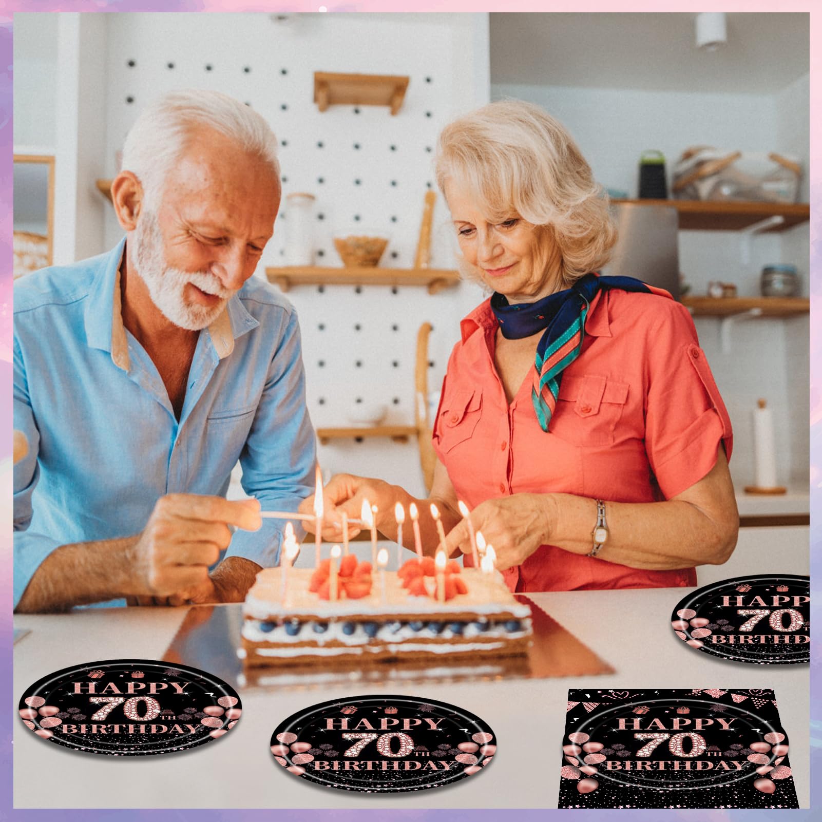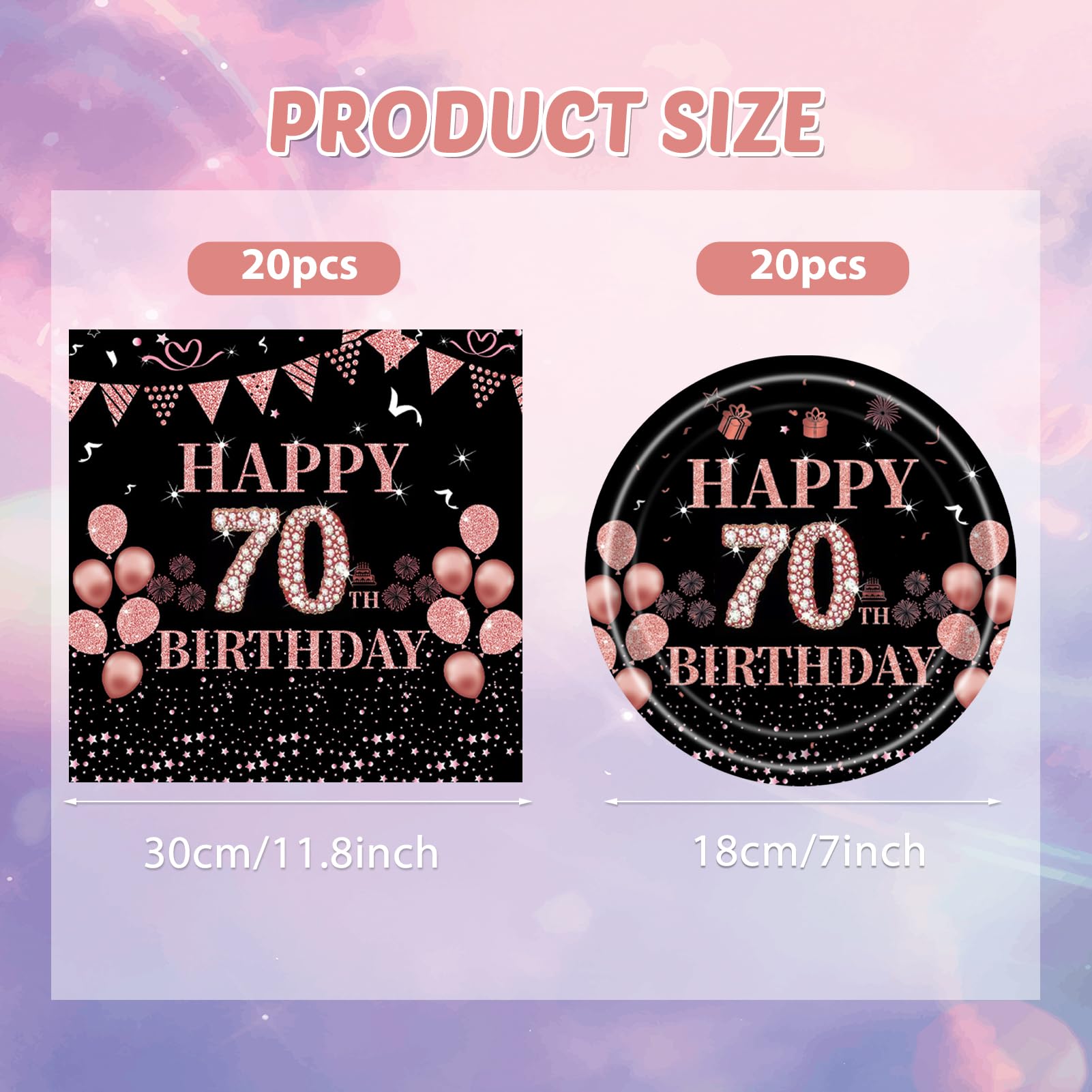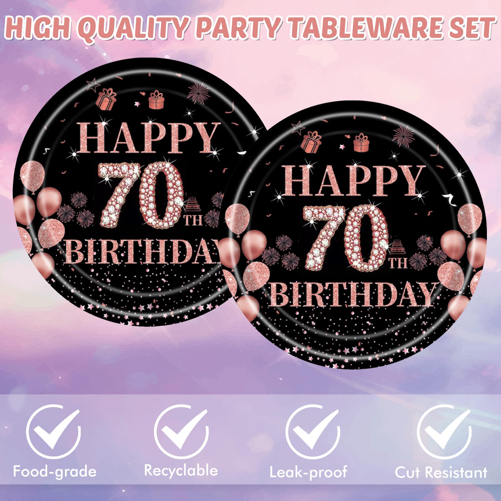 About us KHAIVI is a supplier specialized in party decorations. We offer a wide range of party decorations. We are constantly working on new designs to meet your individual party decorating needs. If you have a requirement for birthday decoration, please make sure you let us know so that we can serve you better. 70th Birthday Decorations for Women Just Enjoy Your Party,The rose gold 70th birthday decorations create a gorgeous and elegant birthday party for you to celebrate her 70th birthday, add joyful atmosphere to the birthday party and make it an unforgettable moment for her, yourself and your family. When the party is over, you can spend more time with family or friends and save clean up time by throwing the plates and napkins party supplies out. Decorate with our boutique 70 birthday disposable dinnerware set, enjoy a high grade, custom-made assortment of ornaments to light up your special day! Package Include: 20 7" paper dessert plates; 20 paper Napkins; Attention 1.This product is not edible, and do not use in the oven or microwave oven. 2.Manual measurement, please allow slight errors on size. 3.The color may exist a slight difference due to different screen displays.