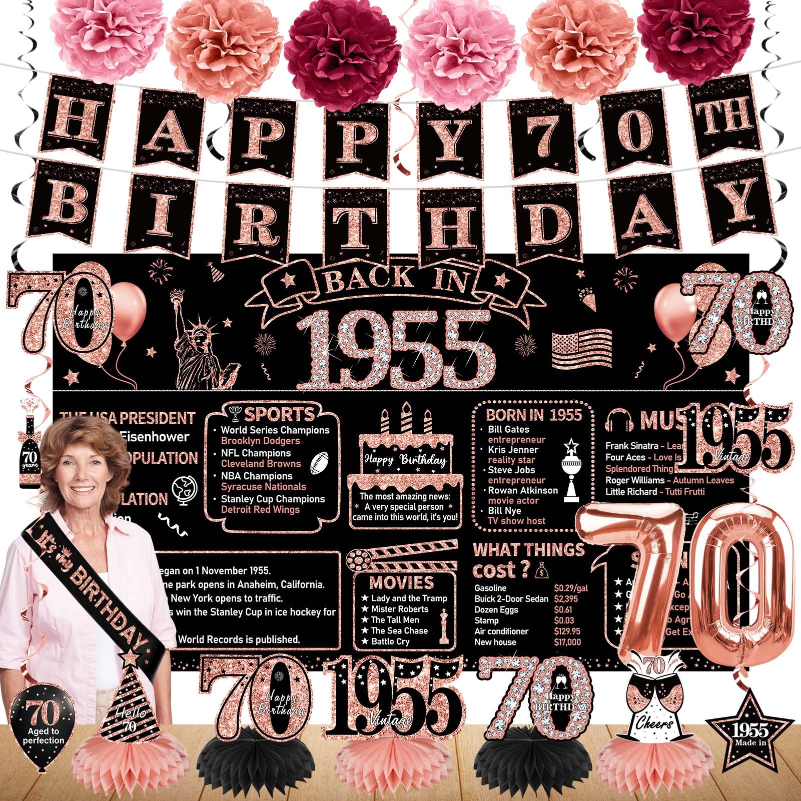 【Viintage 1955 Birthday Decorations for Women】: With elegant rose gold design,big font "Happy 70th Birthday", with black background, and adding cake, balloons, rose gold pink diamonds ,ribbons and other rich birthday elements,The design is very beautiful and novel,for your Add a rich ambience to the party and impress your family and friends.
