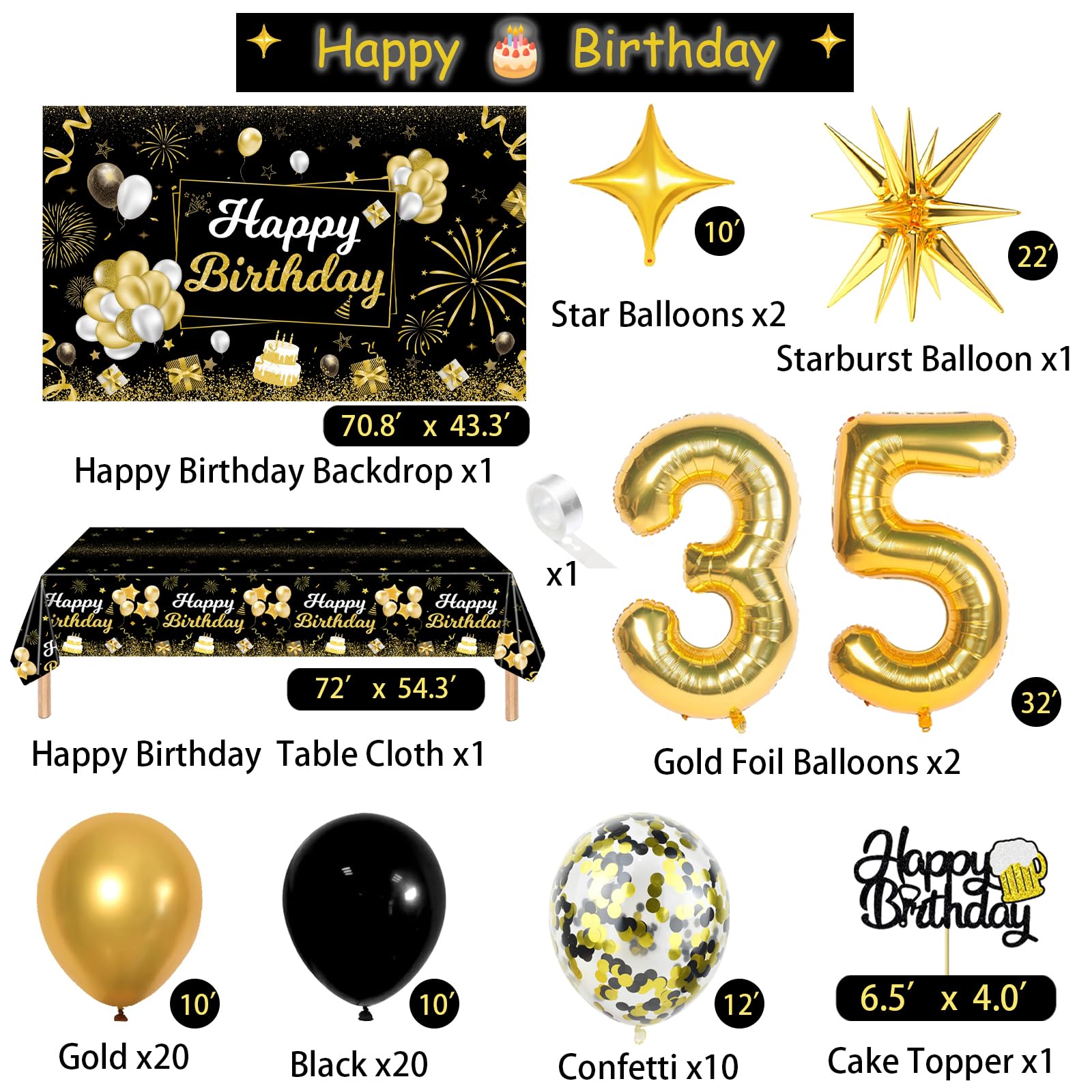 What You Will Receive: 35th Birthday Decorations include 70.8x43.3in ‘happy birthday’ backdrop *1pcs, 72x54.3in tablecloth *1pcs, 32in number *2pcs, 6.5in cake topper *1pcs, 22in explosion star balloon *1pcs, 10in star balloon *2pcs, 10in metallic gold balloons *20pcs, 10in black balloons *20pcs, 12in black and gold confetti balloons *10pcs, balloon tool *1pcs.
