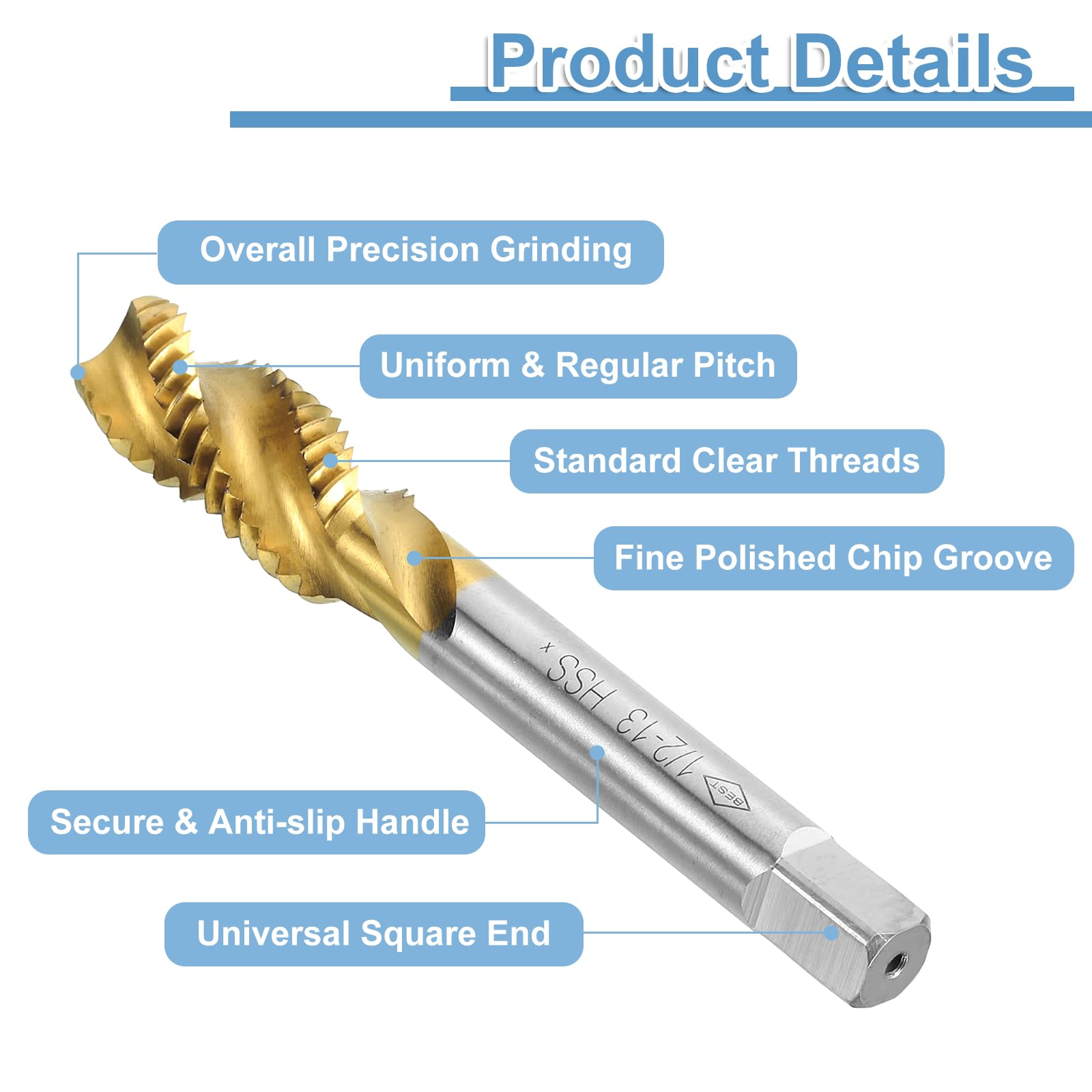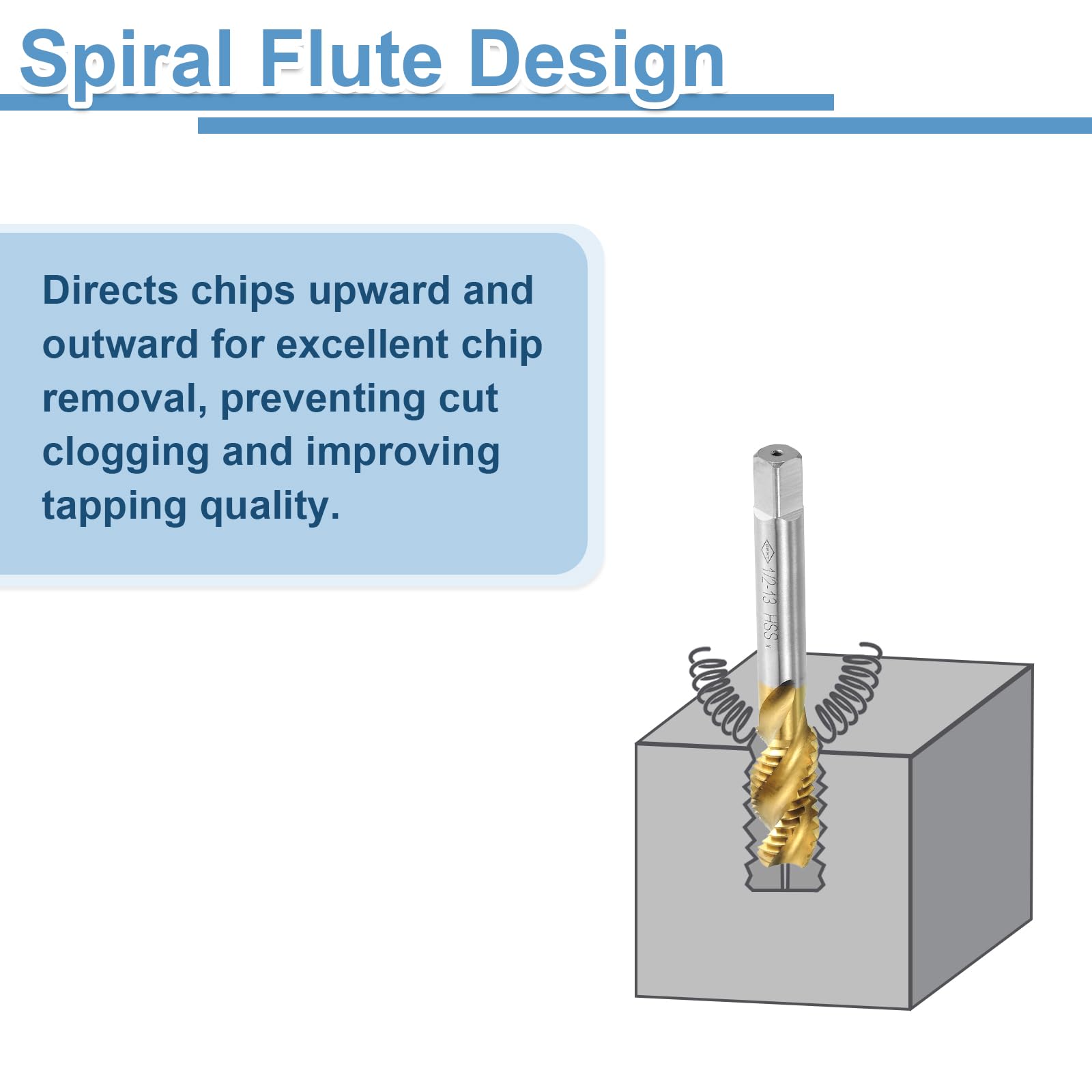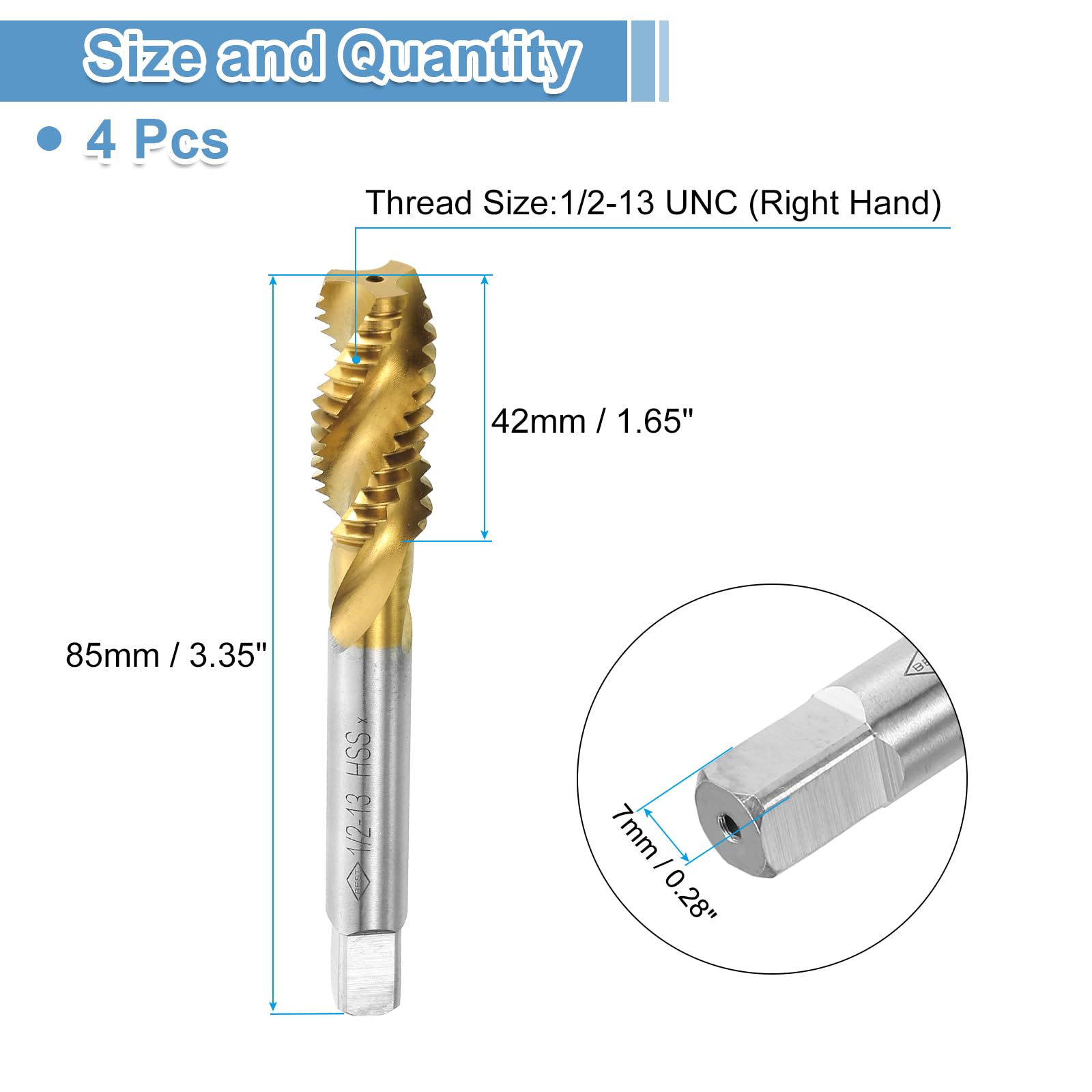 Spiral Flute Tap: Thread size: 1/2-13 UNC (right hand), accuracy: H2; thread length: 42mm / 1.65"; total length: 85mm / 3.35"; square shank width: 7mm / 0.28". Spiral flutes are fully ground to provide upward chip removal, with clear threads and sharp cutting edges.