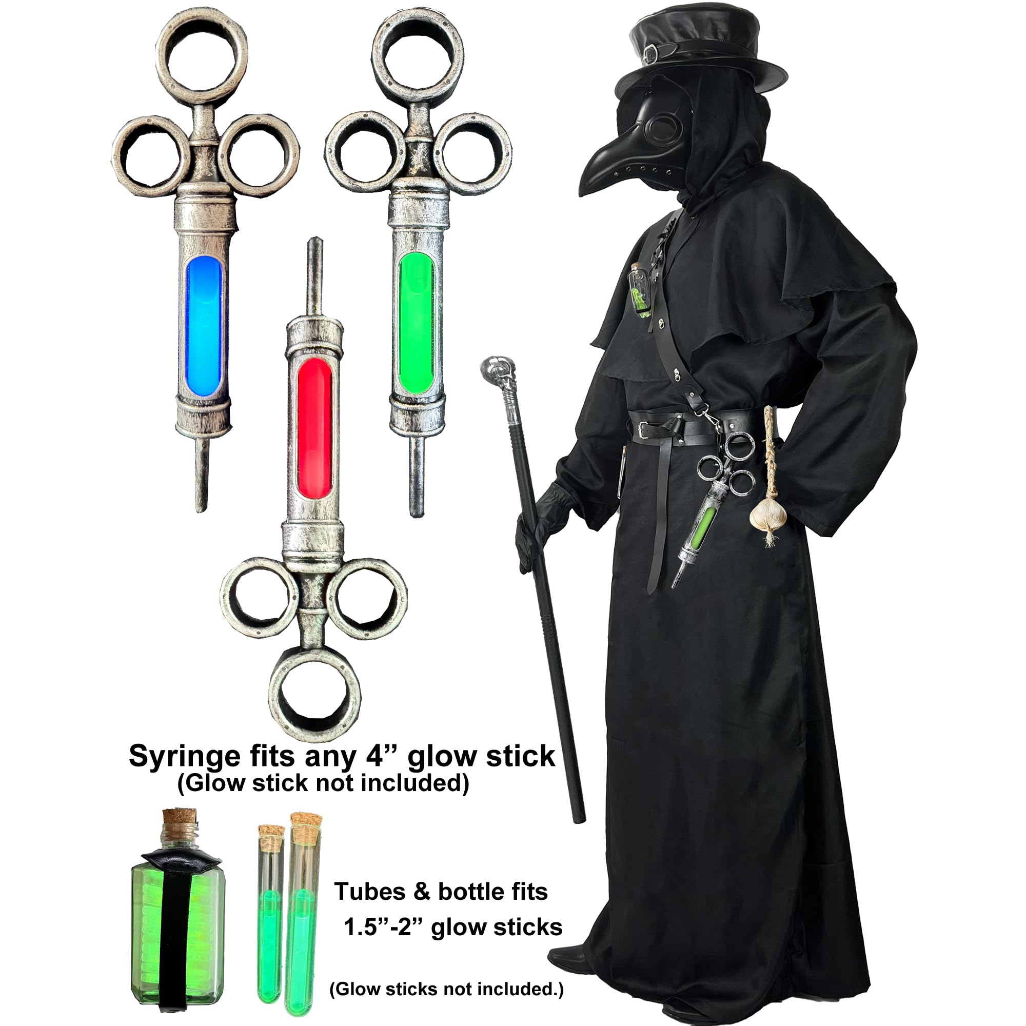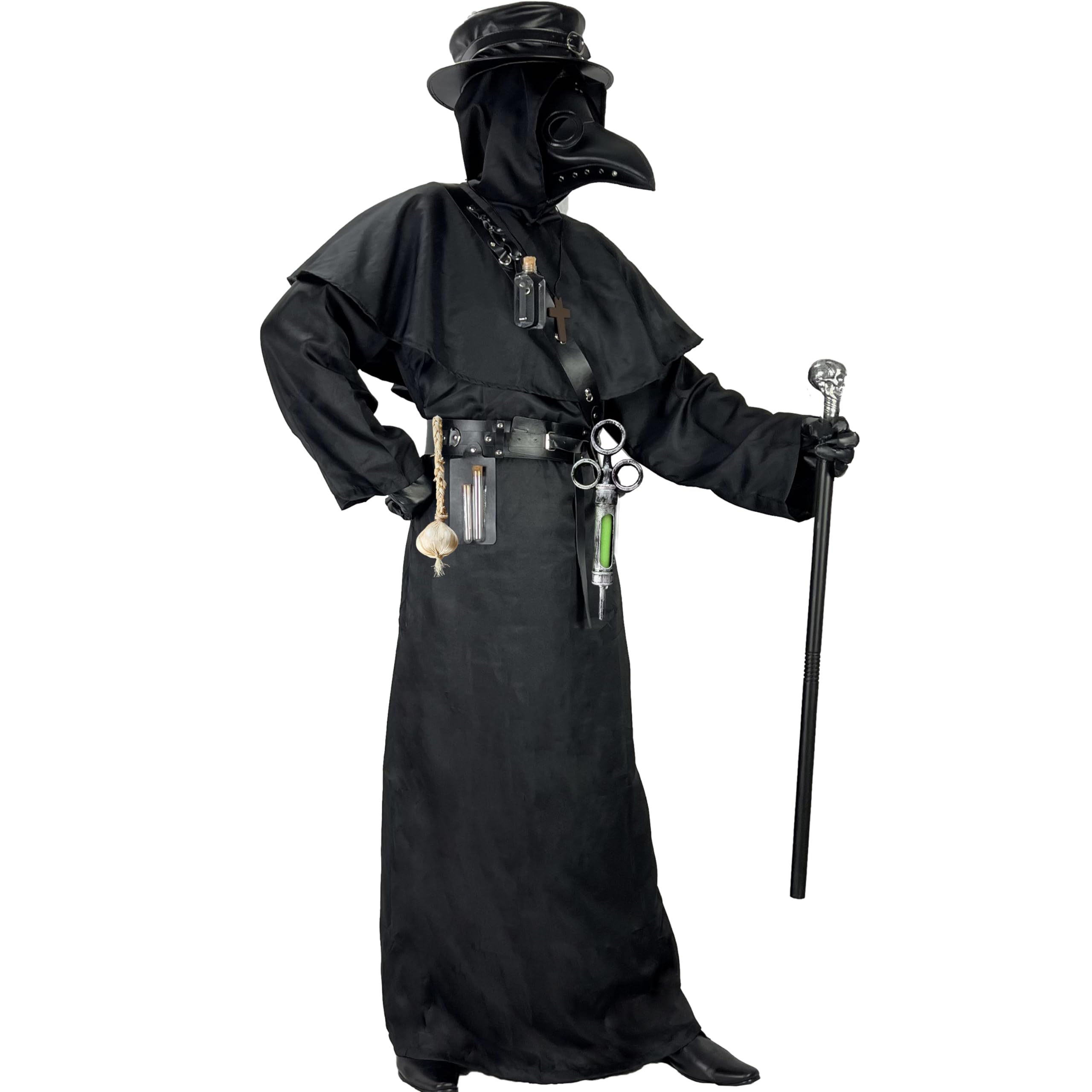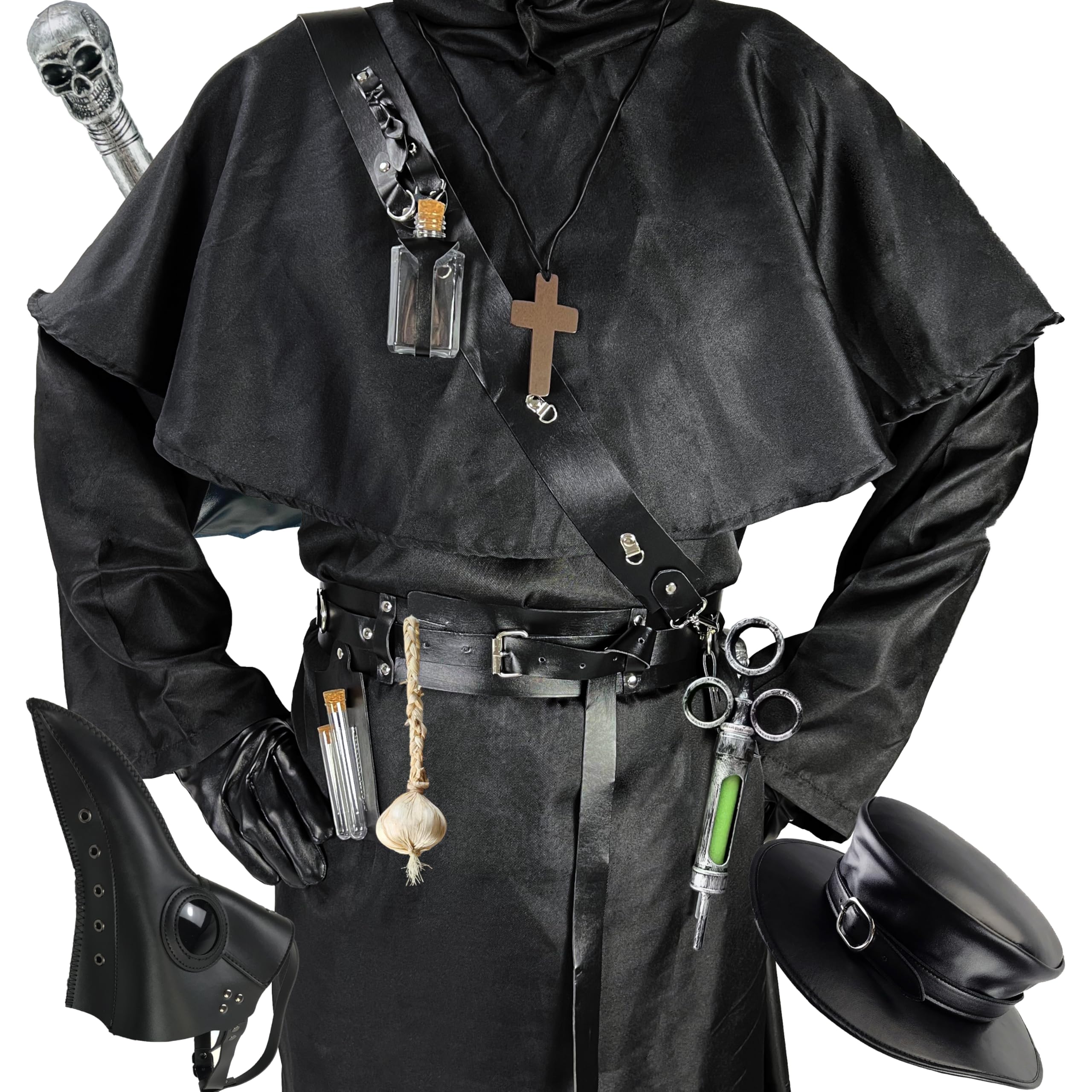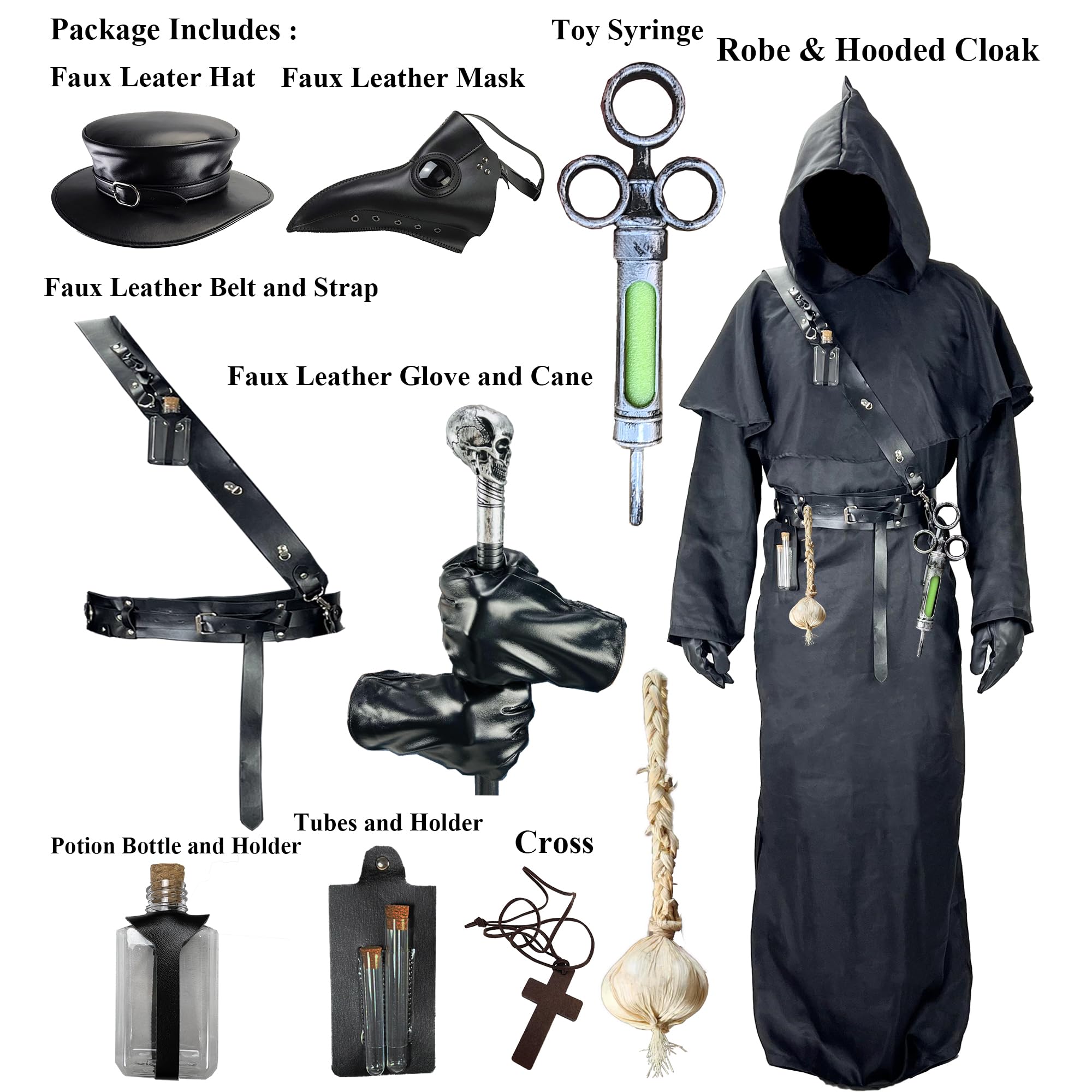 Package included : 1pc Faux Leather Mask , 1pc Faux Leather Hat, 1pc Robe, 1pc Hood Cloak, 1pc Walking Cane, 1set Gloves, 1pc Faux Leather Strap and Belt, 2pc Tubes and holder, 1pc ToySyringe and Holder, 1pc Potion bottle and Holder, 1pc Cross Necklace. Please also see size chart in Product Description.