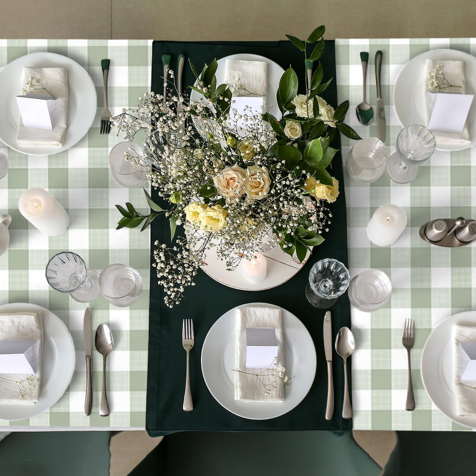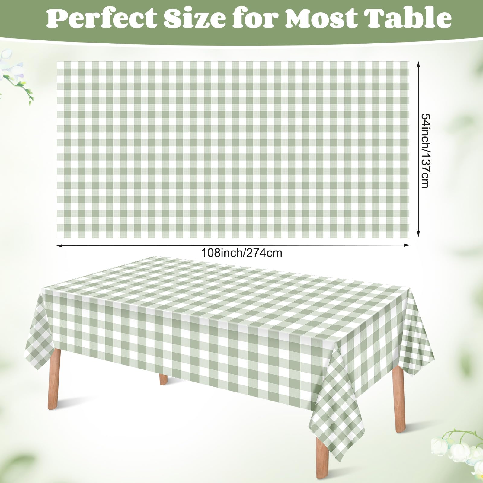 Proper Size to Use Convenient: each green gingham tablecloth measures about 54 x 108 inches/ 137 x 274 cm, which fits most dining tables; Representative pattern and large enough size make it not just a tablecloth, but also a home decorative background; You can even DIY handmade decorations just for birthdays, baby shower, weddings, picnics, bridal shower party
