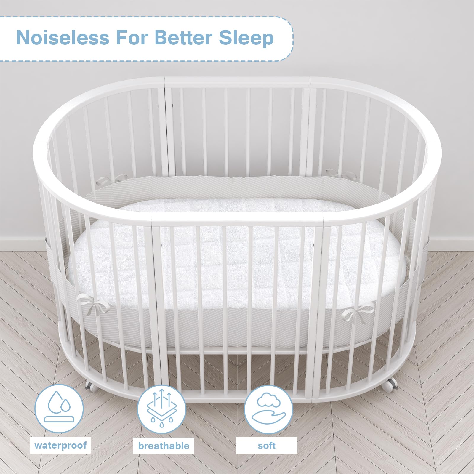 Waterproof and Noiseless: Ours bassinet mattress protector is made of Viscose Terry fabric with 100% waterproof TPU layer on the back to preventing mattress accident spills or frequent bedwetting in the night, Ours bassinet mattress protector ensures a noise-free sleep environment for your baby. It's crafted to eliminate the crinkling sounds often heard with plastic pads, maintaining a quiet setting for peaceful slumber.