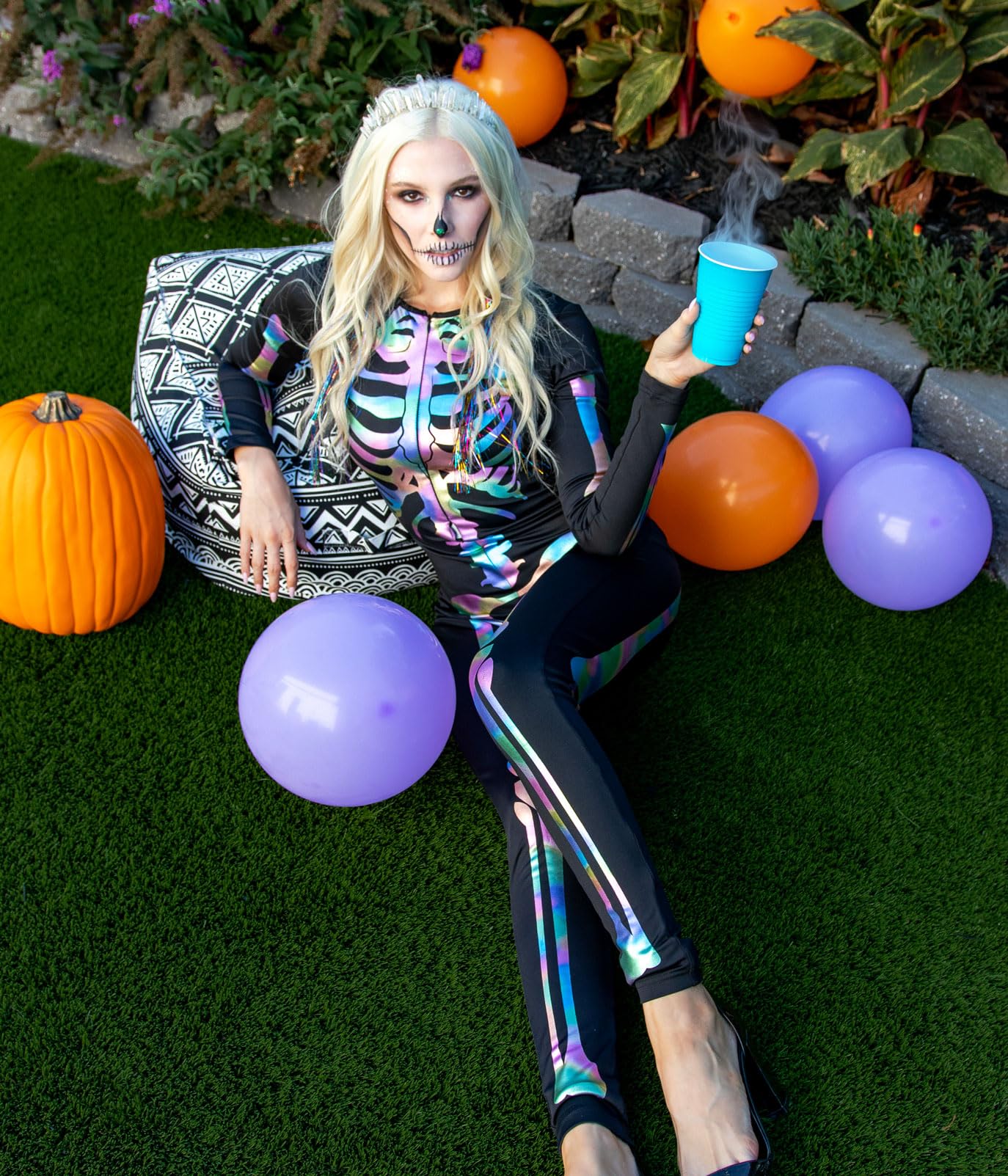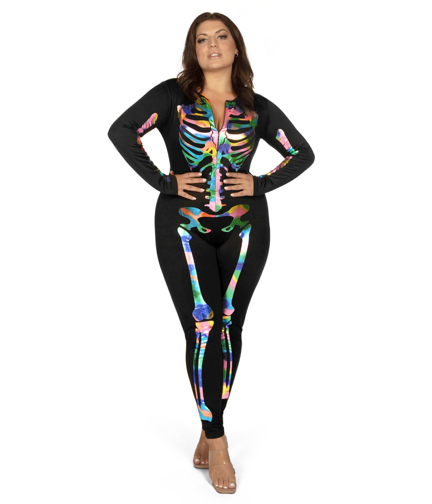 FRONT AND BACK PRINT Our womens iridescent skeleton bodysuit costume showcases a full front and back print that creates a bone-chillingly complete look, perfect for making an entrance at any Halloween bash!