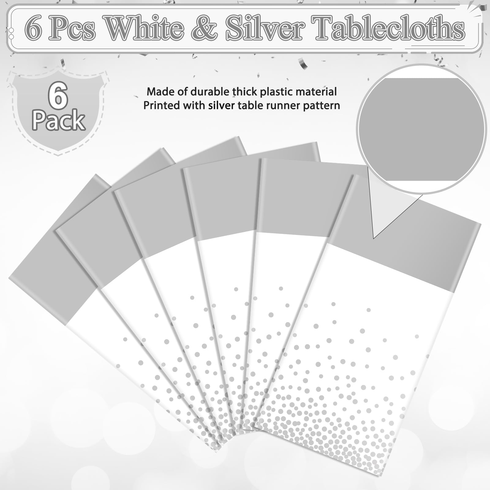 What will you receive: 6 pieces plastic white and silver party tablecloth,all over printed with silver dot on white background,the silver table runner in the middle is printed pattern,ideal for decorating your graduation birthday party supplies and decorations