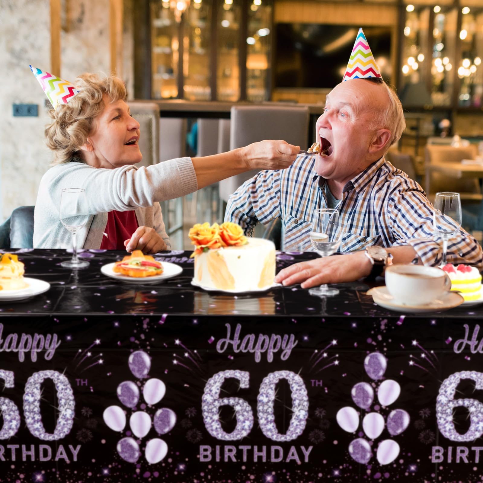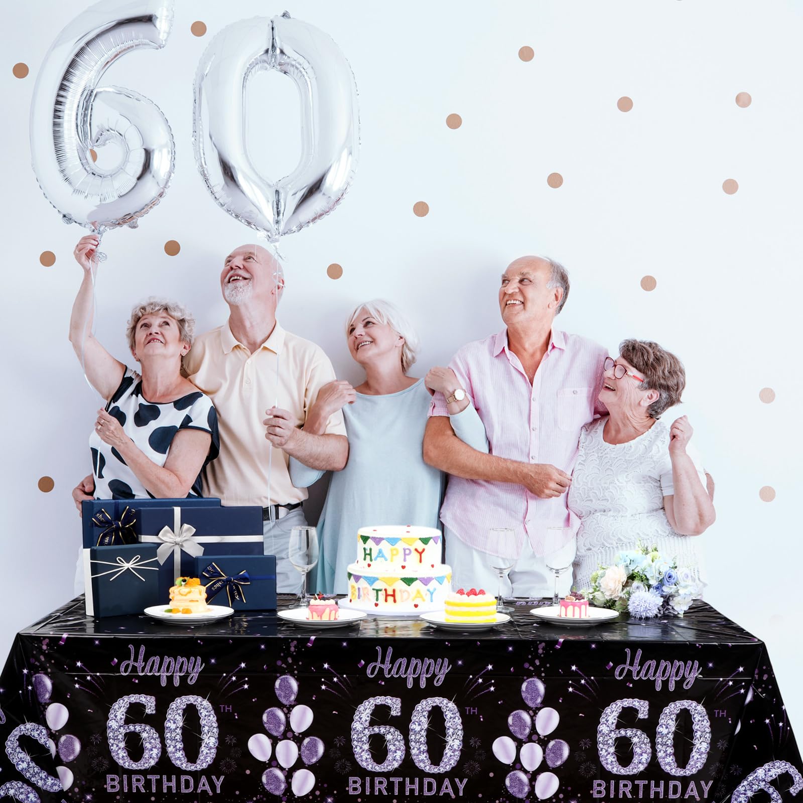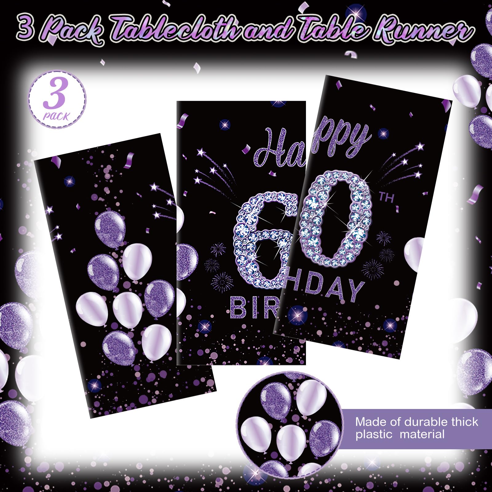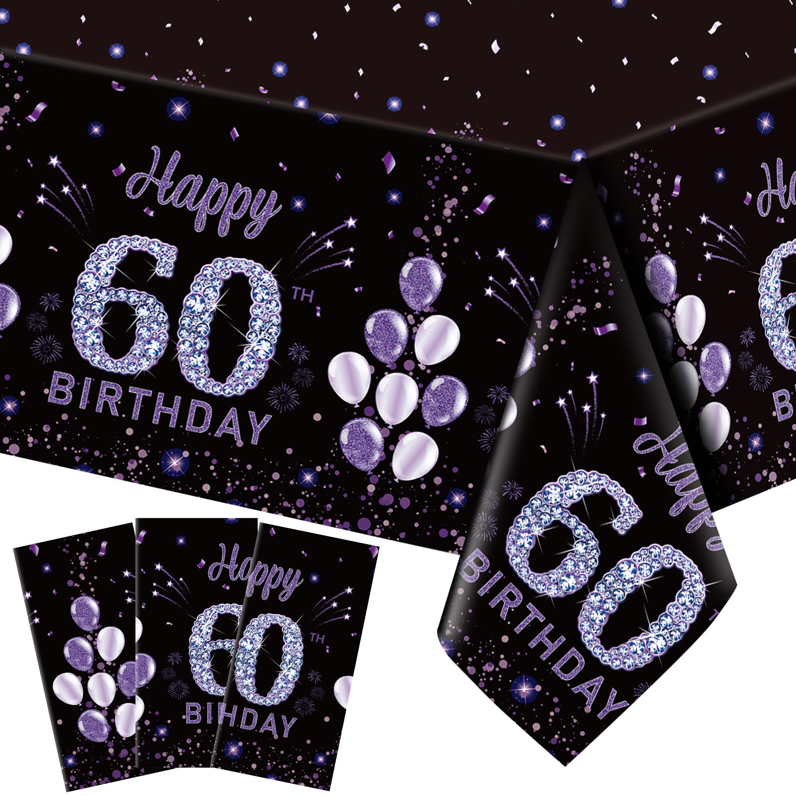 60Th Birthday Table Supplies: the package includes 3 pieces of 60th Birthday tablecloth for party, beautifully designed; The purple 60th birthday, balloon, and 60 Happy Birthday Letters patterns creates a wonderful holiday atmosphere through wonderful colors, adding joy to your party and leaving unforgettable memories for your guests