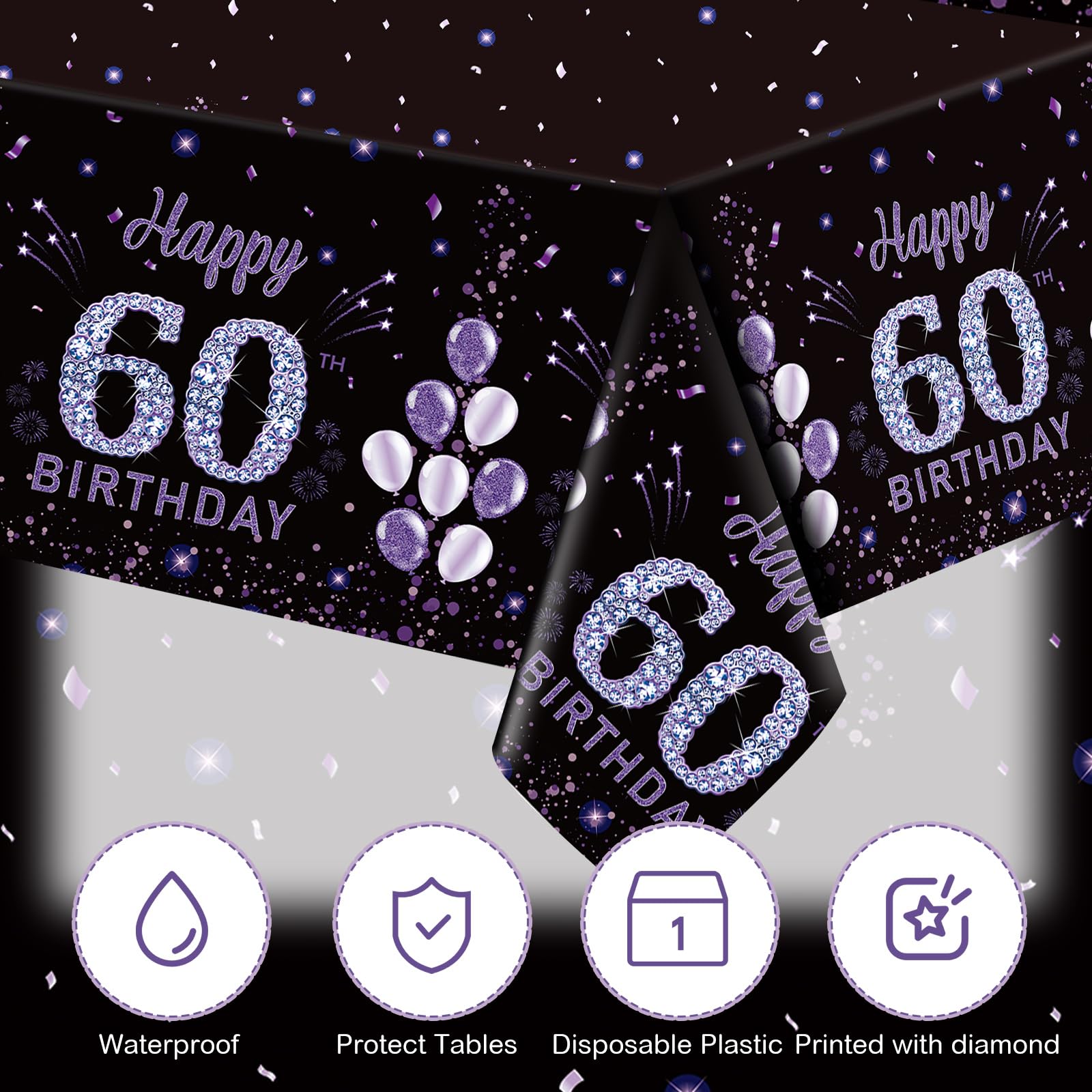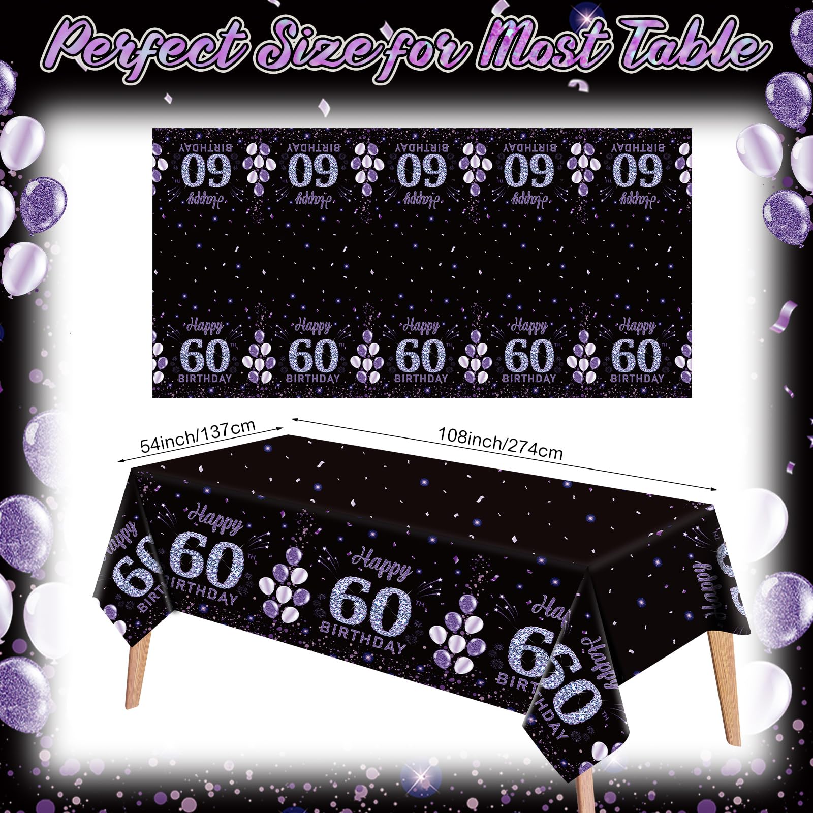 60Th Birthday Themed Pattern Design: the 60th Birthday Table Cover for parties are designed with beautiful patterns, such as purple balloon, “ 60 Happy Birthday” Letters; The classic colors will make you stand out and be your ideal Birthday party decoration accessory, making your party more attractive