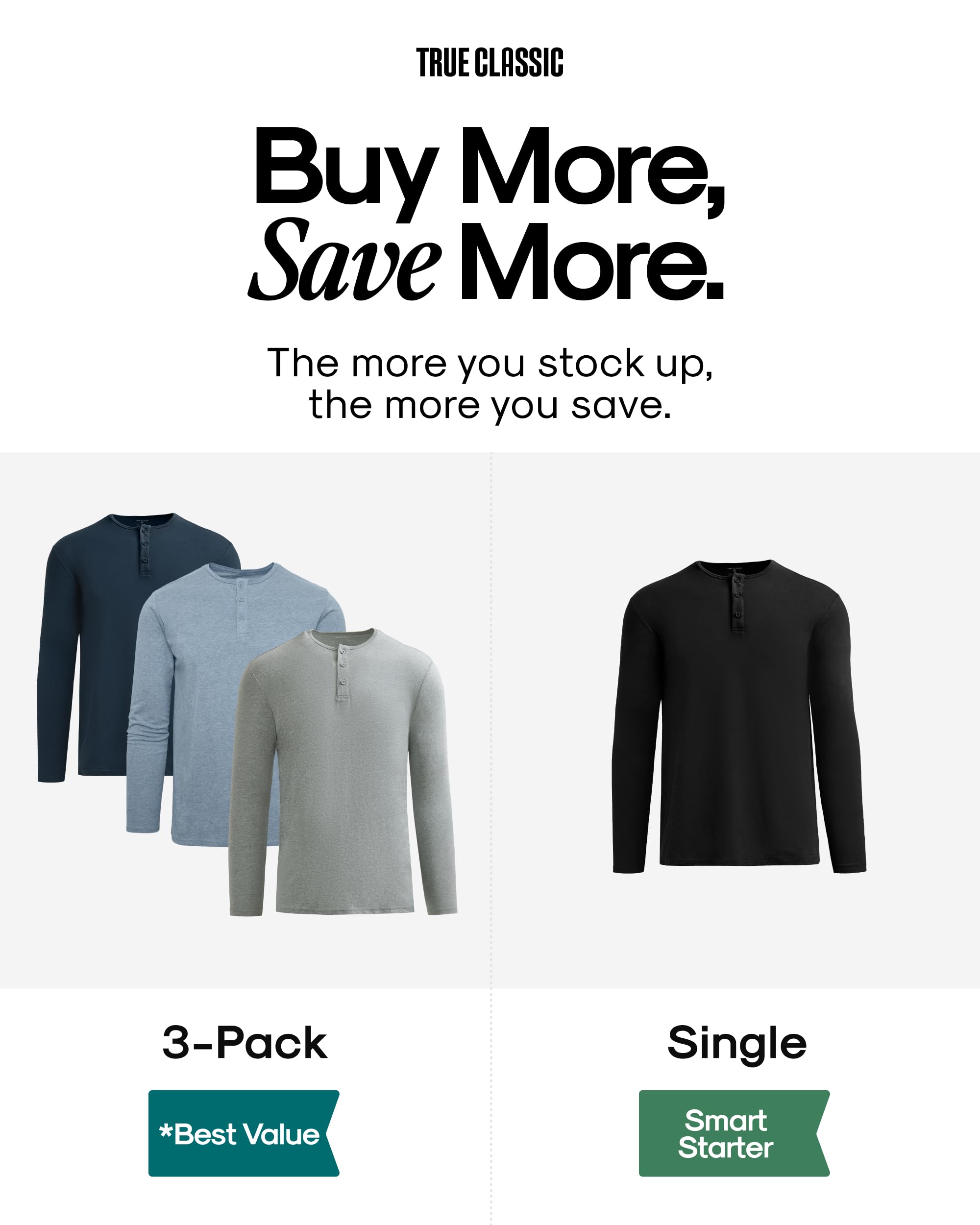 Description Meet the long sleeve men shirts lineup that fits perfect. The True Classic collection pairs a modern, athletic silhouette with soft, breathable fabrics that move easily and hold their shape. Our premium long sleeve crew and long sleeve Henley are crafted from a smooth 60/40 cotton-poly blend that layers effortlessly and stays comfortable all day. When the weather cools, reach for the waffle long sleeve crewβits brushed modal-cotton knit delivers extra warmth with the same easy stretch. Tag-free labels keep things itch-free, classic side seams maintain structure, and minimal shrinkage helps ensure that true-to-size fit wash after wash. Available in Sβ3XL and a range of versatile colors including the black long sleeve t shirt men love and the white long sleeve t shirt men need, each style is built for everyday wearβoffice, off-hours, and everything in between. Wash cold, dry low (up to 5% shrinkage), and youβre set. Slip on your favorite True Classic long sleeve and head out feeling comfortable, put-together, and ready for the day.