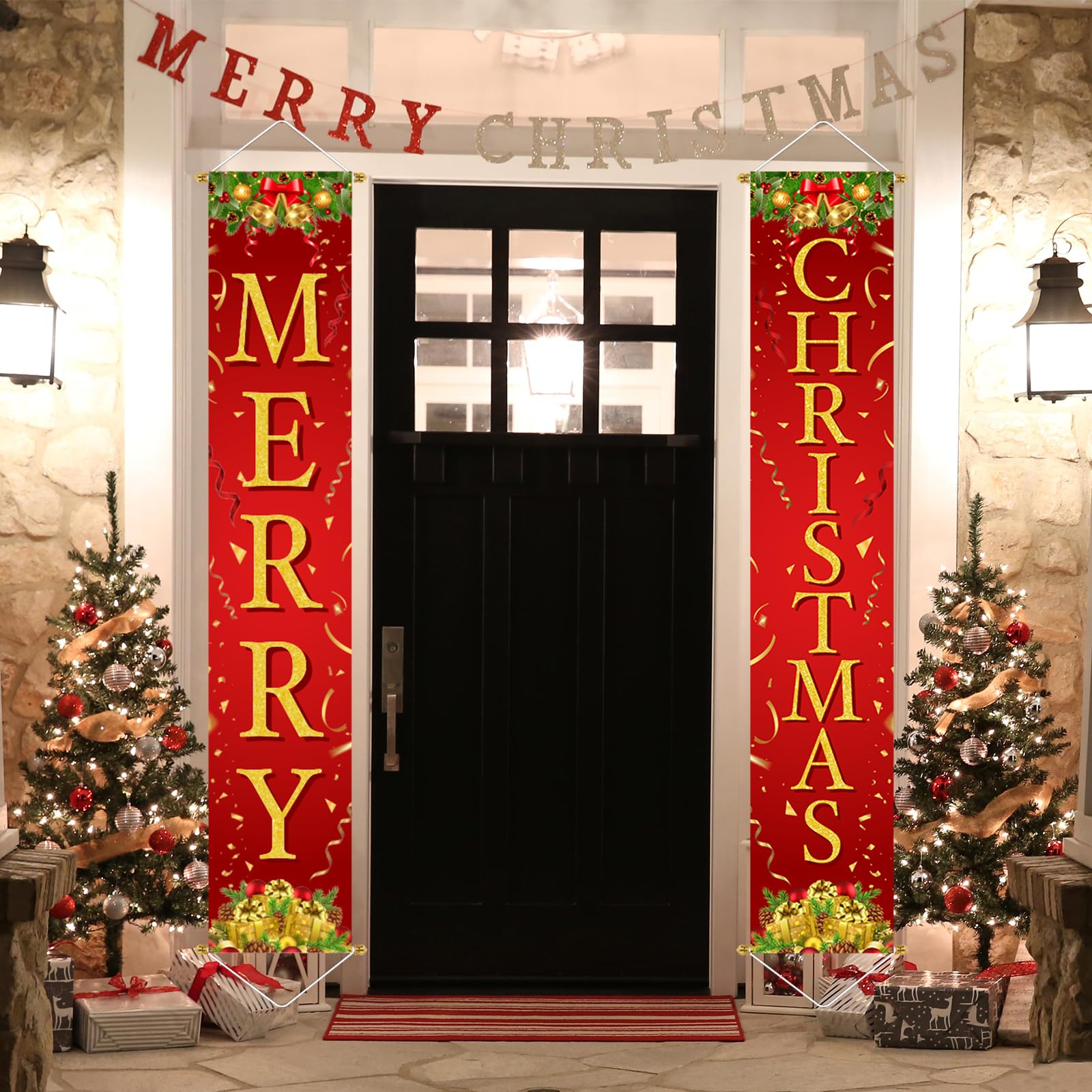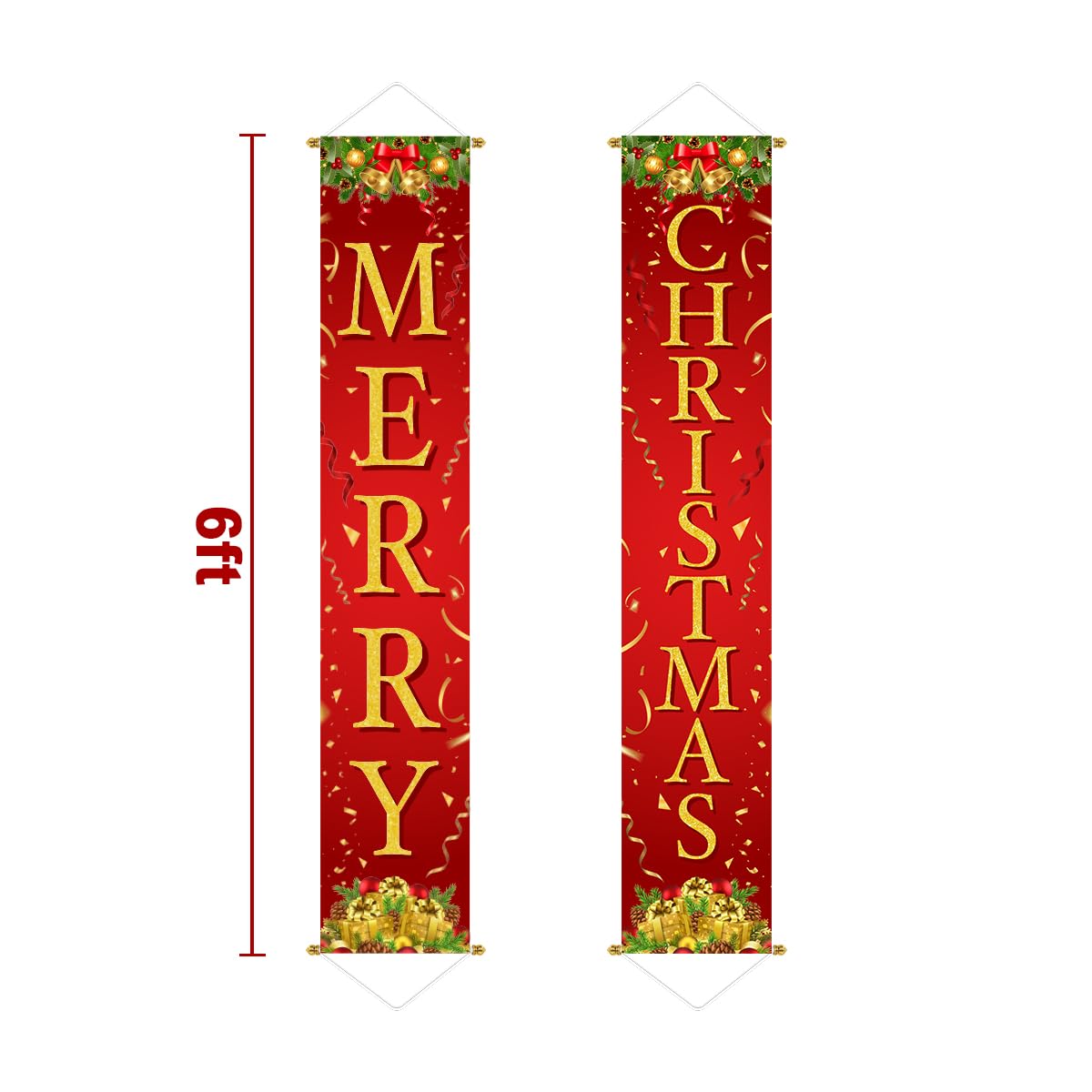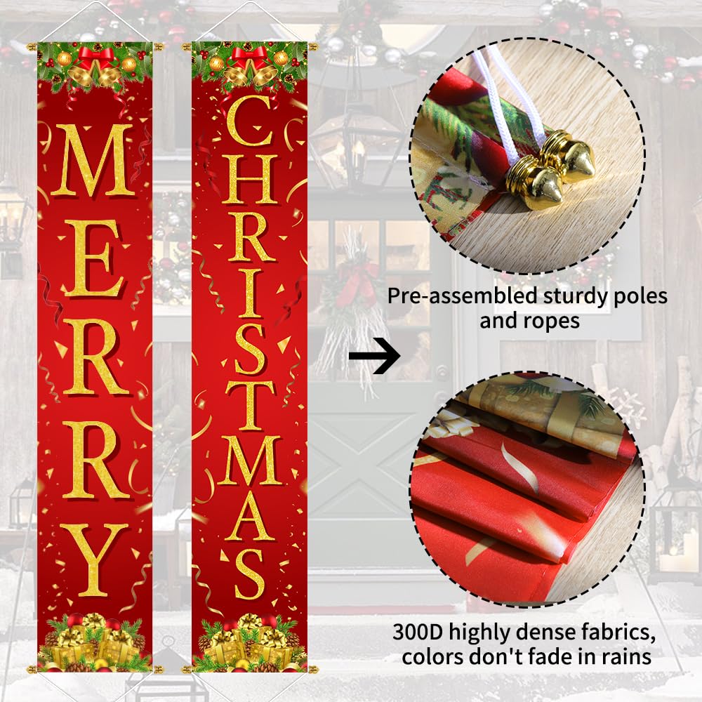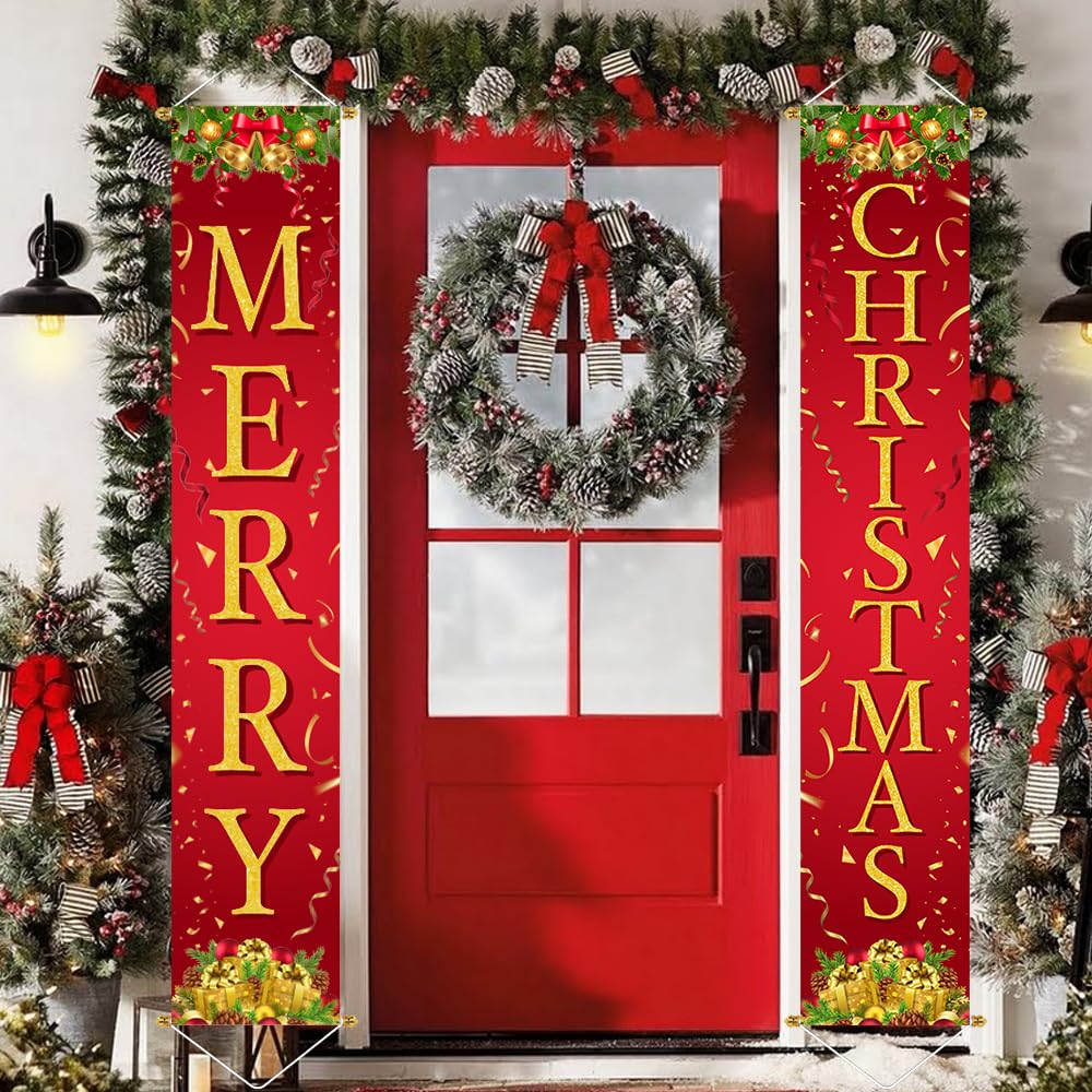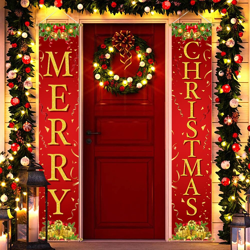 PACKAGE INCLUDES: 2 extra large Christmas front porch door banner. Both in the size of 71" x 13" (L x W). The pattern and letters are large enough to be seen from far away. Good size as Christmas decorations outside yard.