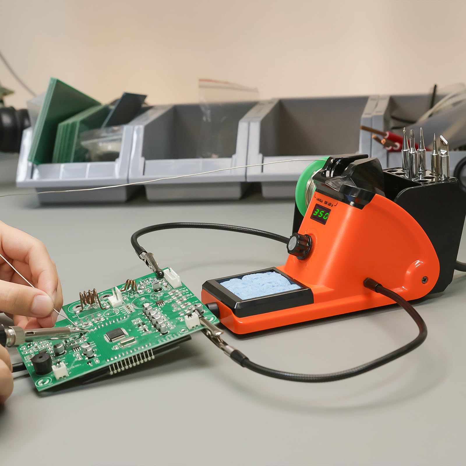 Optimal Space-saving Solution - This professional compact soldering station offers perfect combination of Soldering Station & Soldering Iron Stand. The user-centric designed mesh protector on the station's back is to prevent accidental contact with the soldering iron when it is in the holder. You can also store tips on the mesh if needed. Good option when more worktop space is required. Optimize space & Simplify your worktop with this great space saver!
