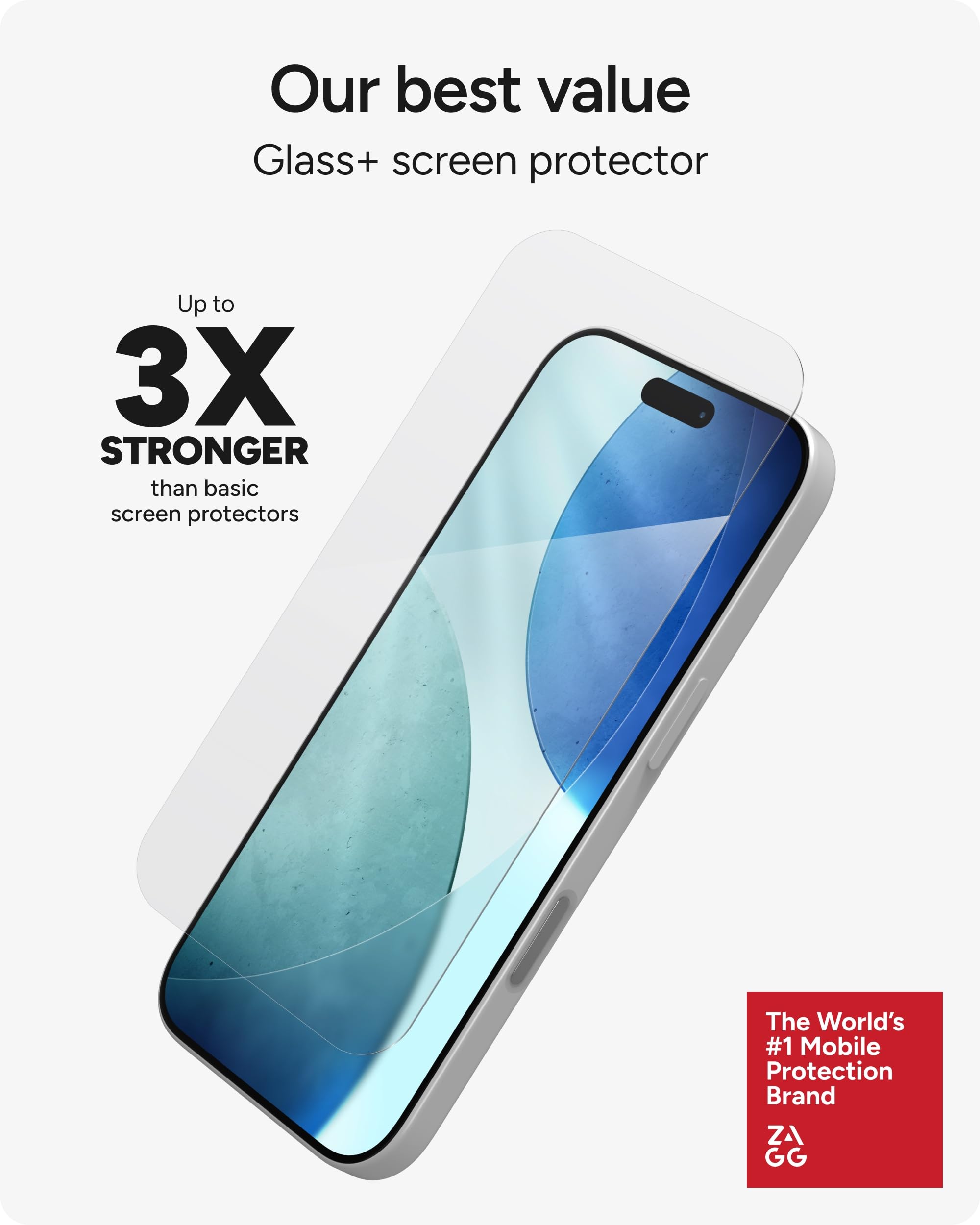 ZAGG Glass+ for Impact & Shatter Protection ZAGG Glass+ offers protection for your iPhone, providing 3X the strength of typical, basic glass screen protection. Designed to guard against everyday impact, scratches, and fingerprint smudges, helps protect your screen's look and feel from day one. The precision surface finishing process delivers top-tier scratch resistance, while the oil-resistant layer prevents fingerprint marks, smudges, and stains, and does not affect your phone's touch sensitivity. Its smooth, silky texture feels like your original screen, enhancing your phone experience without affecting touch response or clarity. ZAGG’s PerfectFit system ensures easy, two-step installation and is designed to work for you, right out of the box.