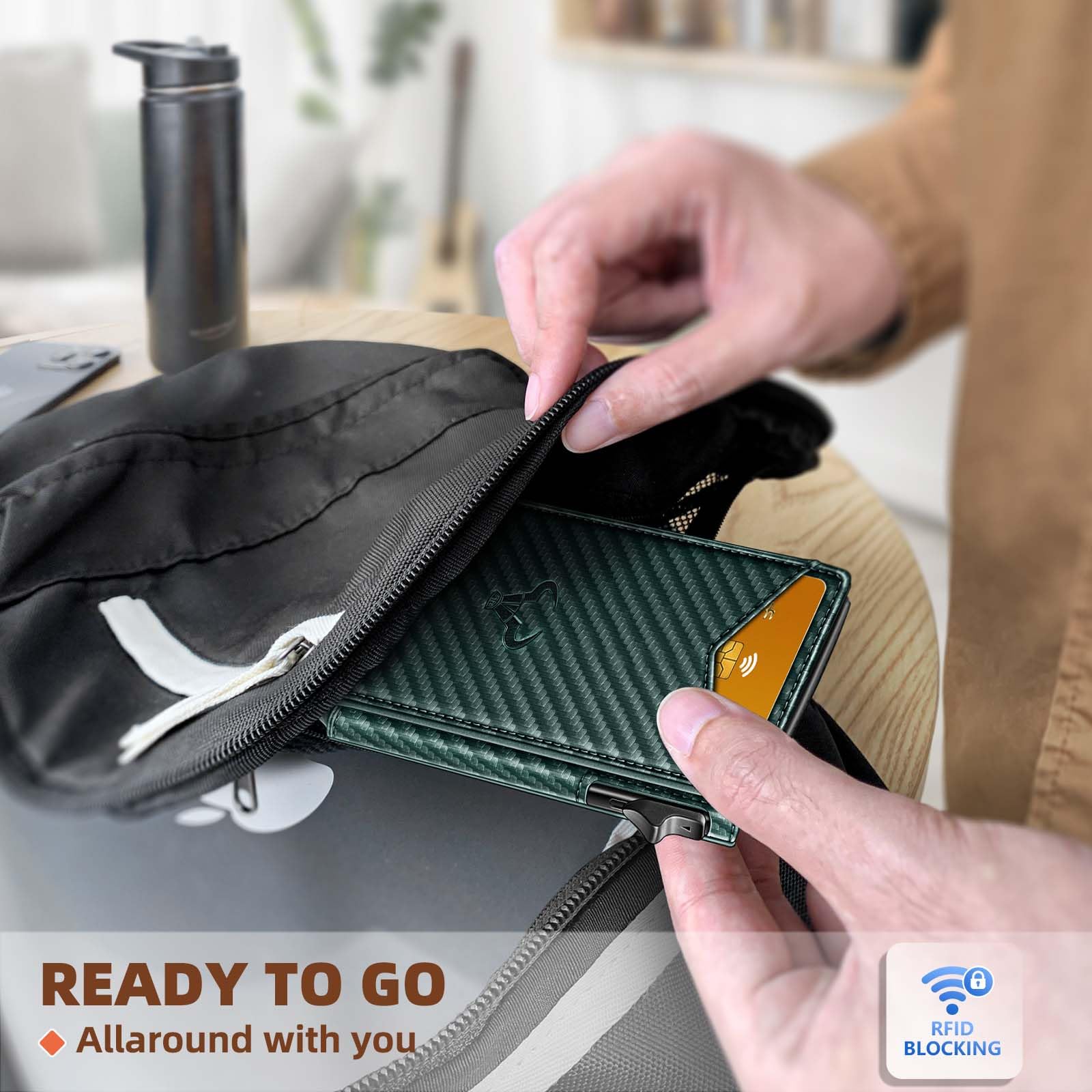 CAPACITY-Pop-up metal Case in flipping leather shell,9 card slots (including 1 ID window) and metal money clip for couple of bills;