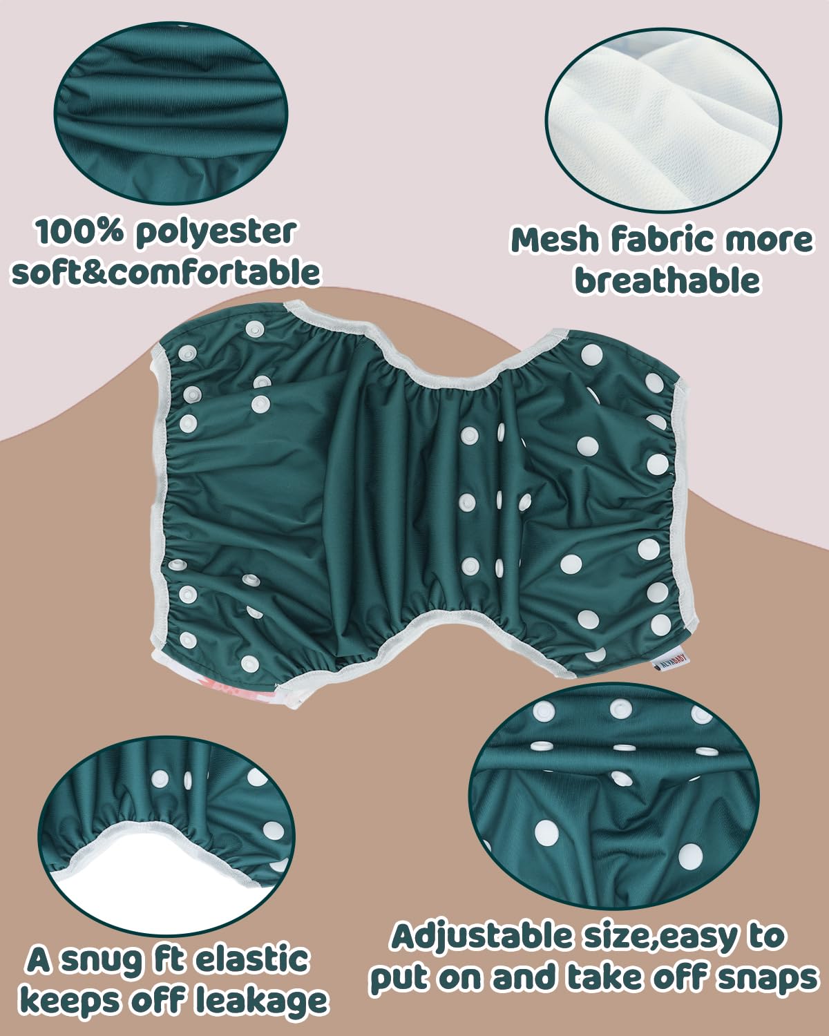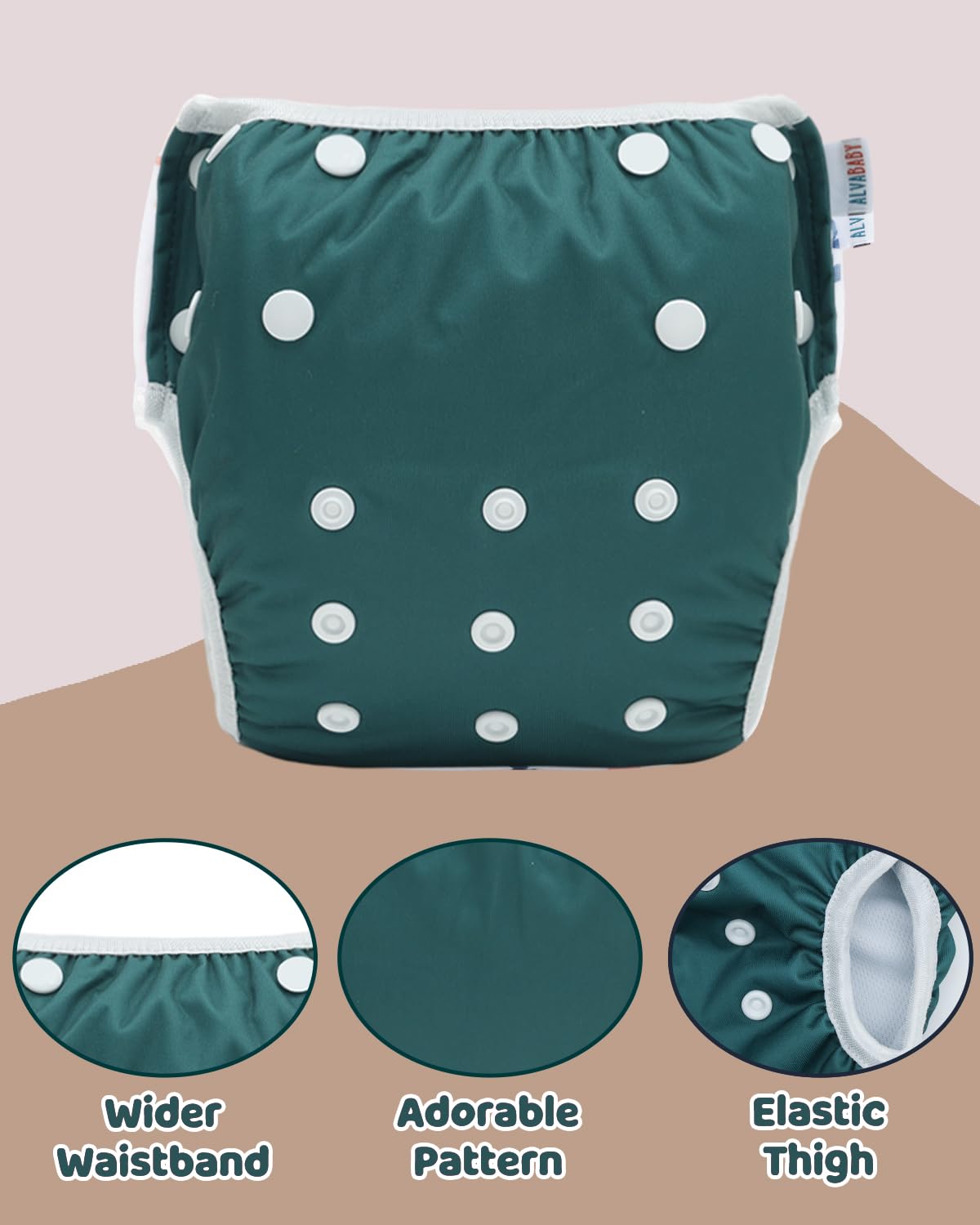 HIGH QUALITY, ADJUSTABLE, REUSABLE & WATERPROOF -ALVABABY swim diapers are made from waterproof 100% polyester PUL outer layer. Elastics waist and legs: Interior Polyester Elastics at the waist and leg openings with soft lycra bindings provides a secure, stretchy fit and easy on and off.