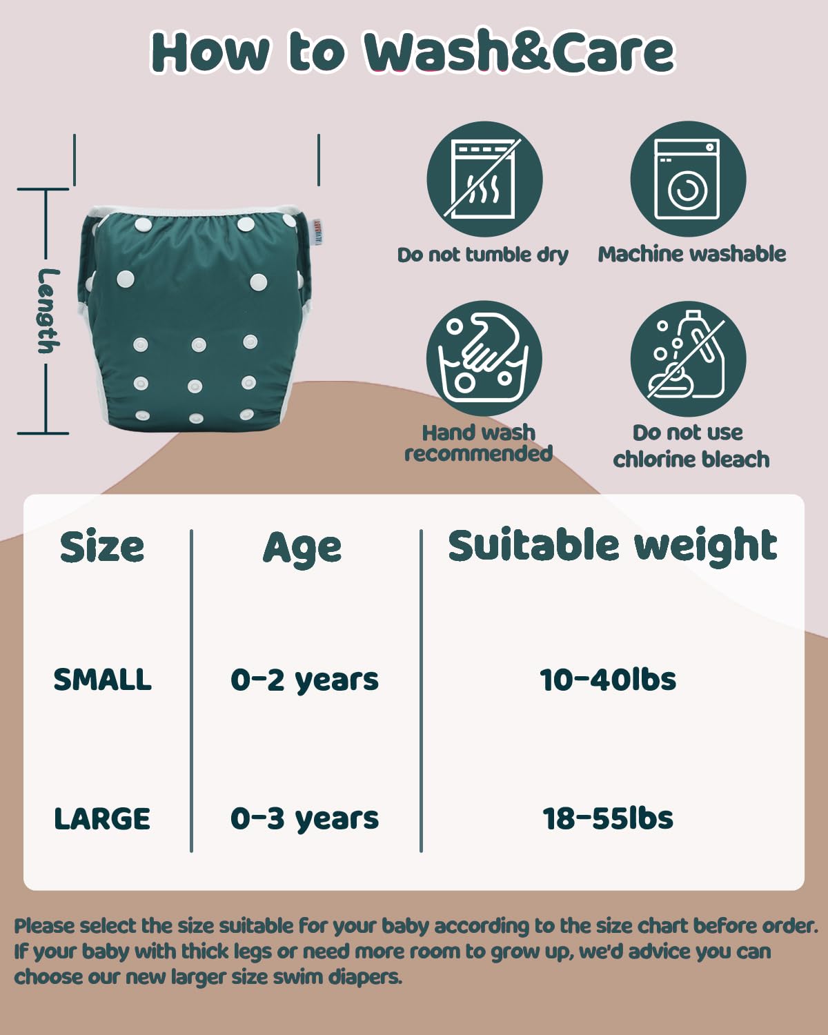 SINCERE SERVICE-If you have any problems with the product, please feel free to contact us, we’ll solve your issue ASAP. Please select the size suitable for your baby according to the size chart before order. If your baby with thick legs or need more room to grow up, we’d advice you can choose our new larger size swim diapers.