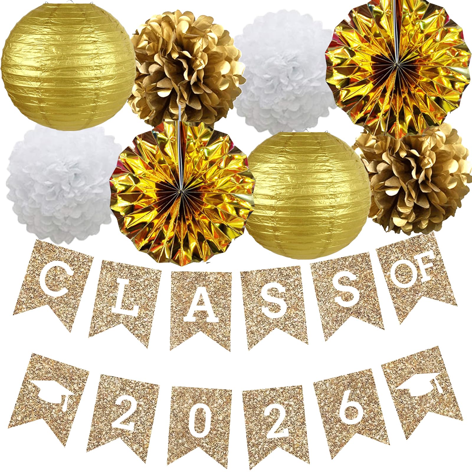 Quantity: 1 gold class of 2026 banner with 2 white grad caps, 2 gold pom poms flowers, 2 white pom poms flowers, 2 gold paper lanterns, 2 gold paper fan flowers