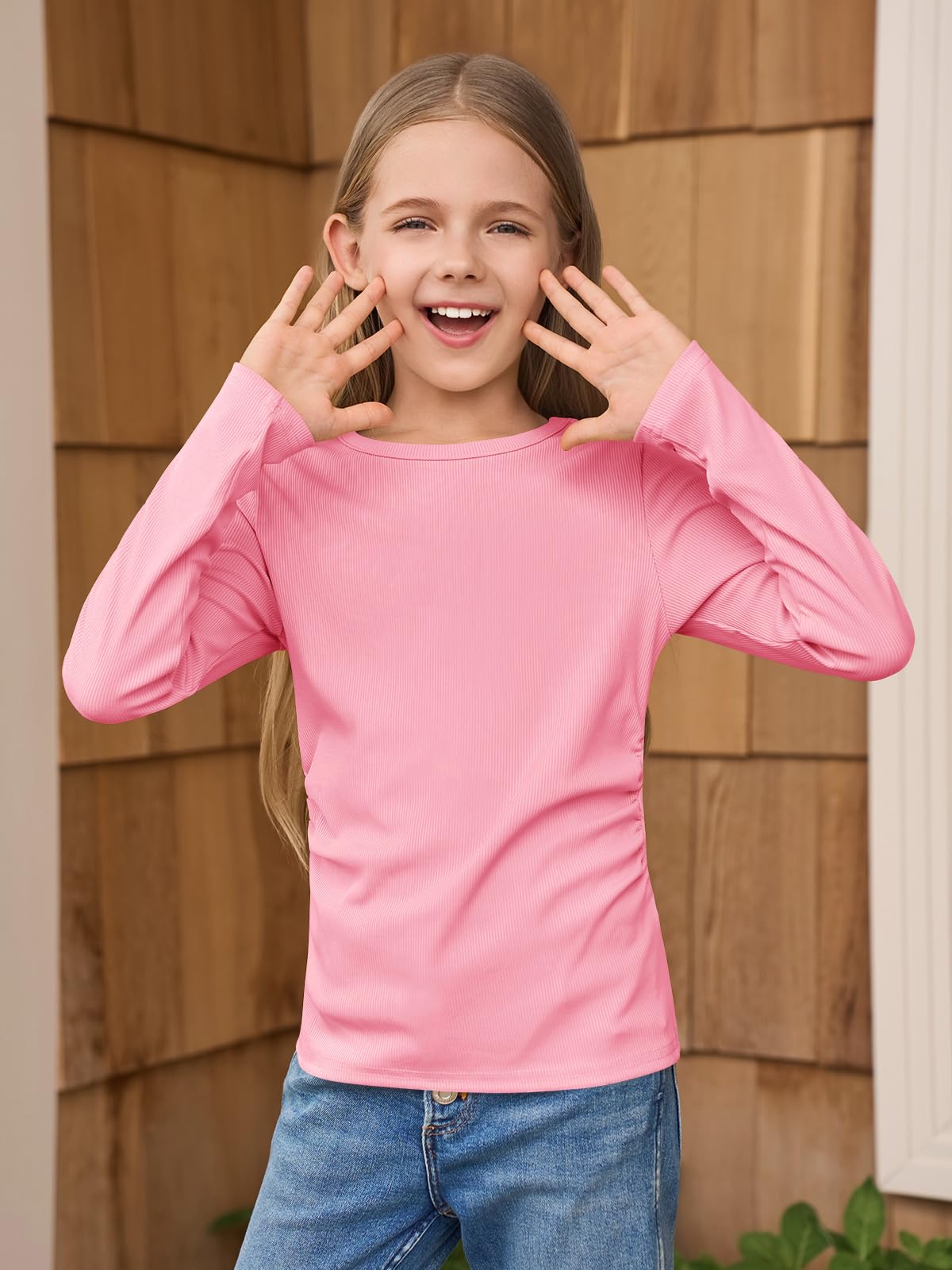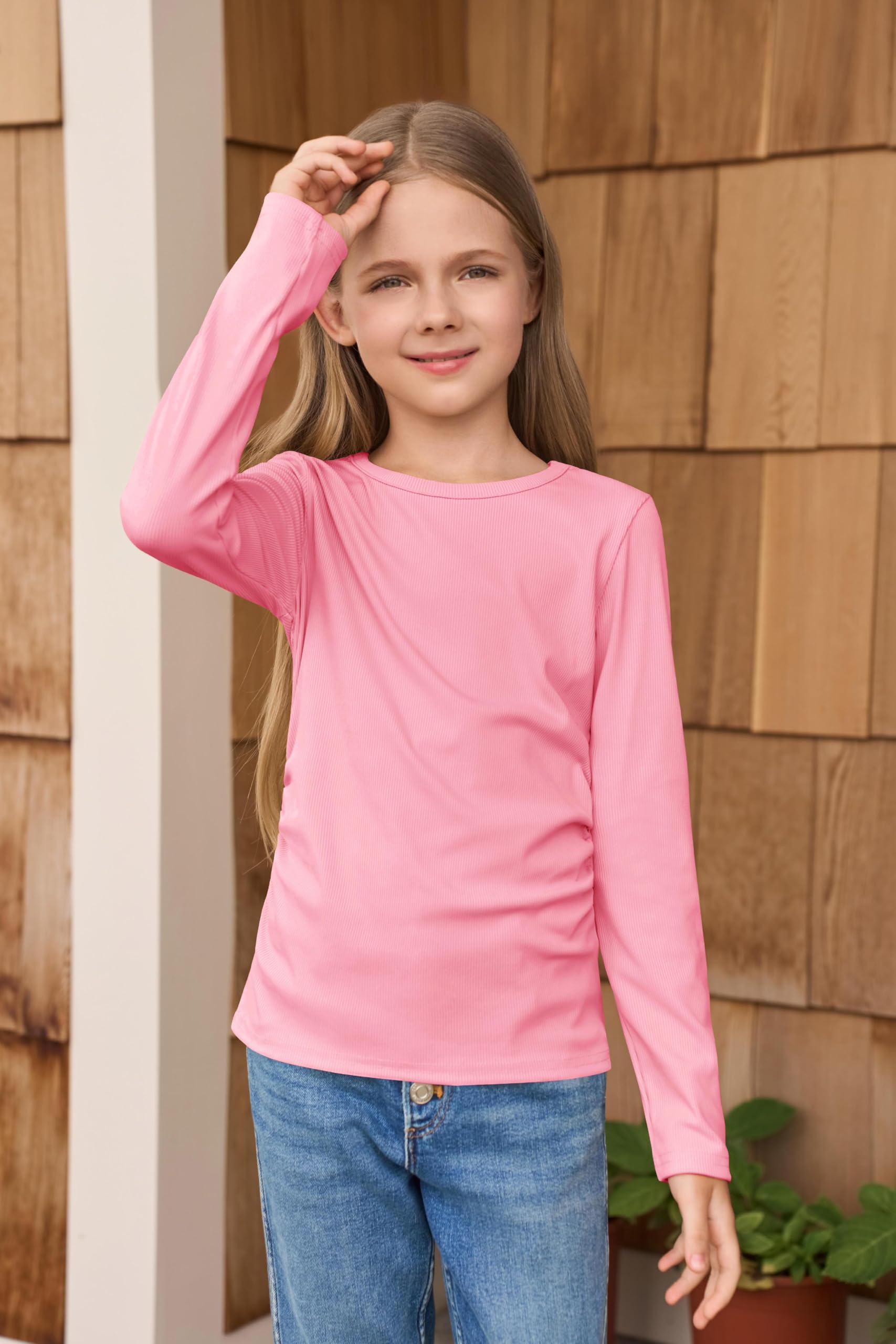 Features: Fitted Basic Tee for girls, long sleeve, round neck, ribbed knitted fabric, ruched detail two side, solid color, cute and fashionable look. Designed to delight girls aged 4-15!