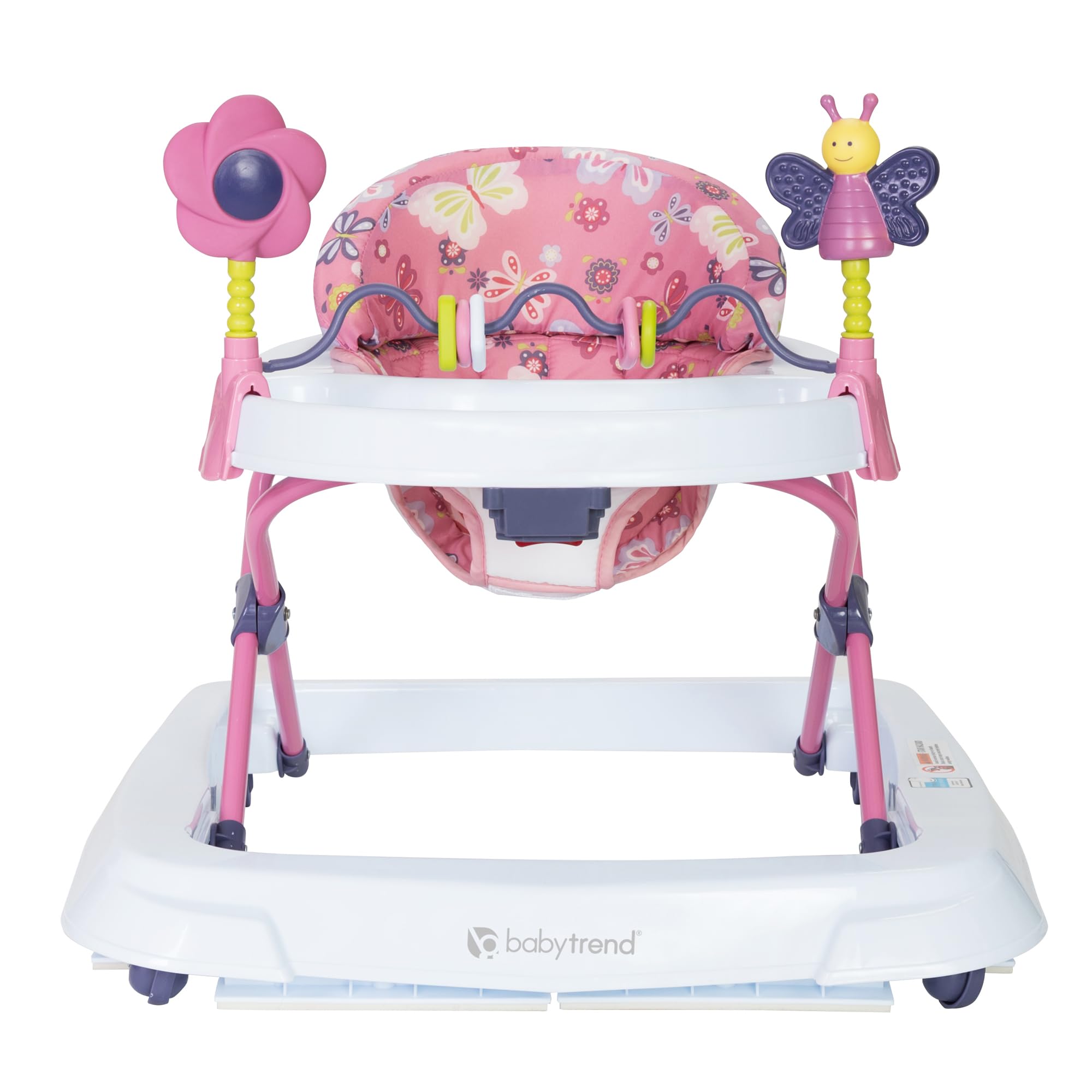 The Emily Baby Trend Walker is designed for comfort and with your baby's needs in mind. The walker is a breeze to set up, clean and fold, and it's easy and fun for your baby to use. Along with the multi-directional wheels that offer freedom of movement, the extra-wide base provides superior support and stability so your baby will enjoy playing and moving about. The Baby Trend walker has a large surround tray and removable toy bar. The Emily Baby Trend Walker also features a three-position height adjustable and high-back padded seat for added comfort. 0 to 12 Months, 12 to 24 Months. Do not machine wash.