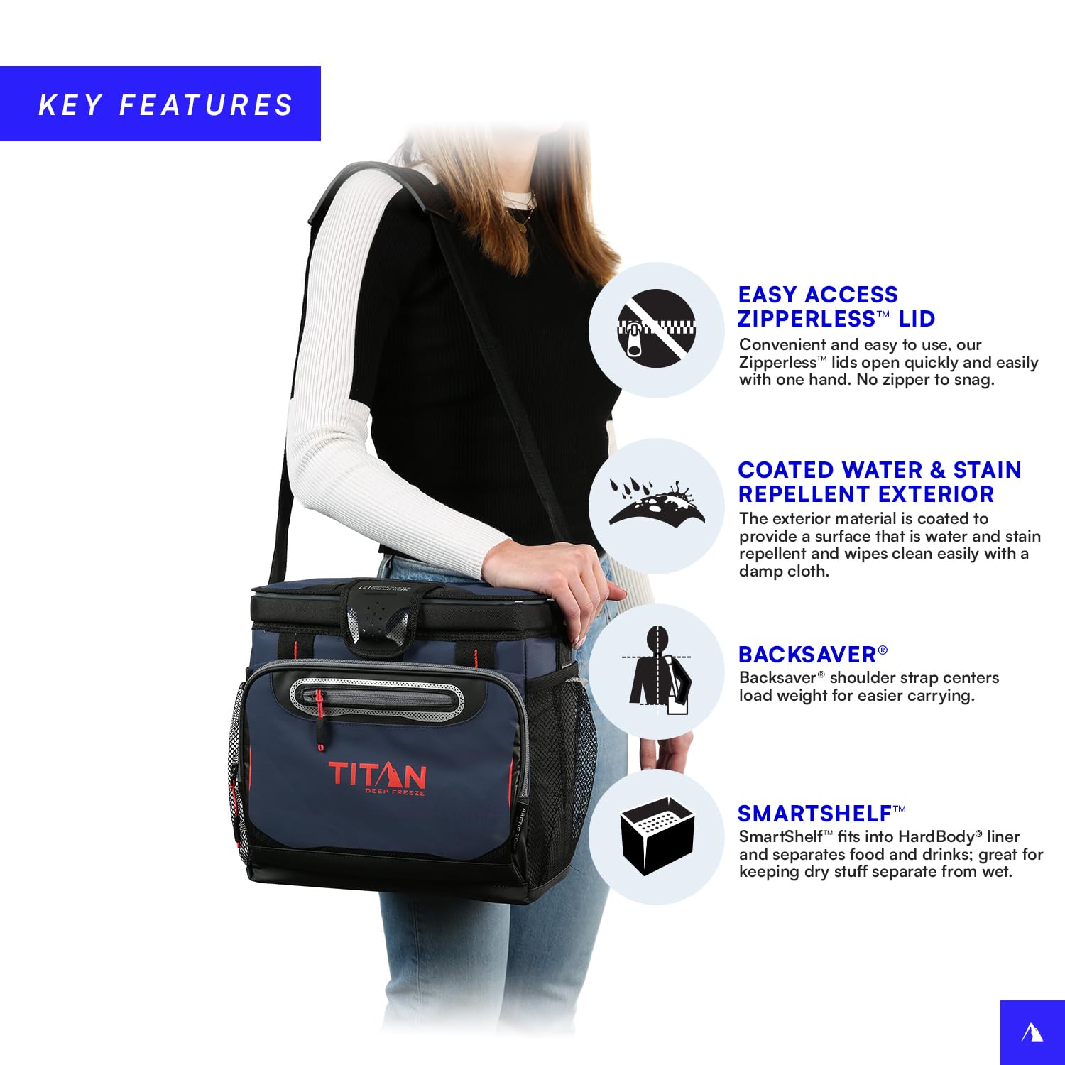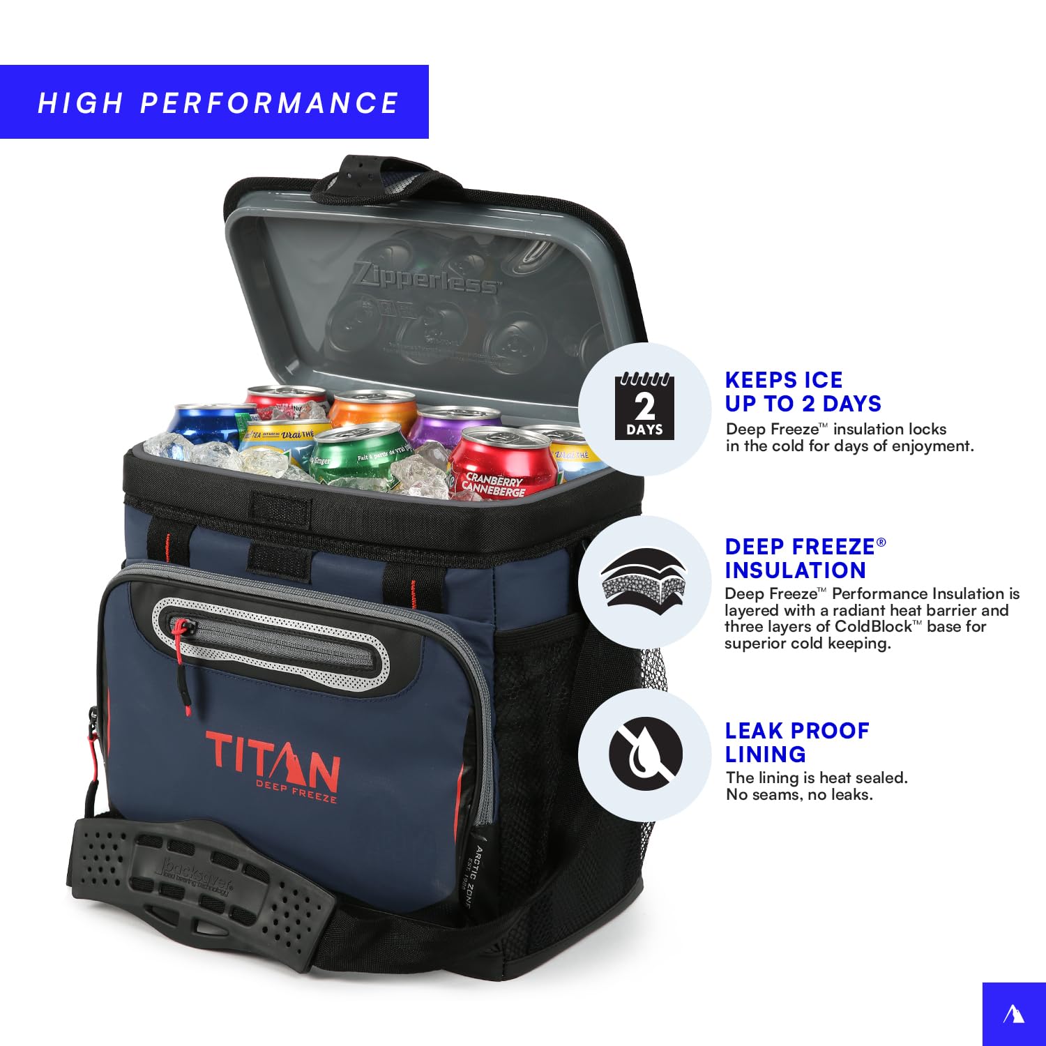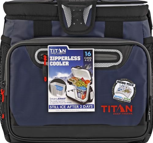 The Arctic Zone Titan Deep Freeze Zipperless Hardbody Cooler features Deep Freeze Insulation, Hardbody Liner, and SmartShelf and is perfect for storing ice for up to two days while keeping your favorite foods and beverages cold. Able to hold up to 16 cans, this cooler uses Deep Freeze High-Performance Insulation with a radiant heat barrier and a Zipperless lid for quick access to food and drinks. The removable Hardbody liner with SmartShelf allows you to separate soft and hard items so that soft items don't get crushed. If you need more space, the SmartShelf easily removes to provide one large compartment. Our Cooler features an adjustable Backsaver Shoulder Strap with a shoulder pad for comfort as well as tough, water-, and stain-resistant Rhino-Tech exterior material that is easy to clean. Designed for convenience and usability, the Arctic Zone Titan Deep Freeze Zipperless Hardbody Cooler is perfect for keeping food and drinks cold no matter where you go!