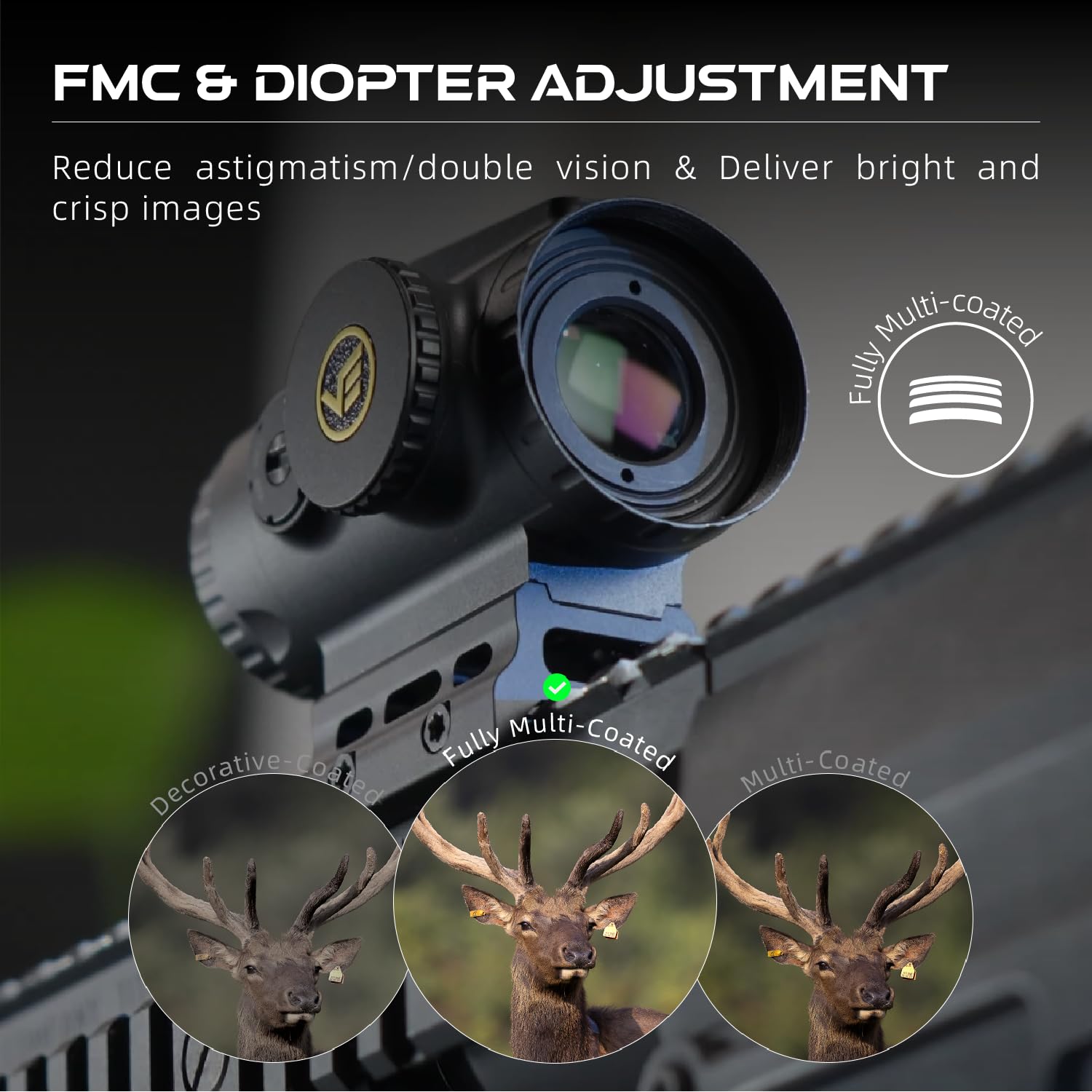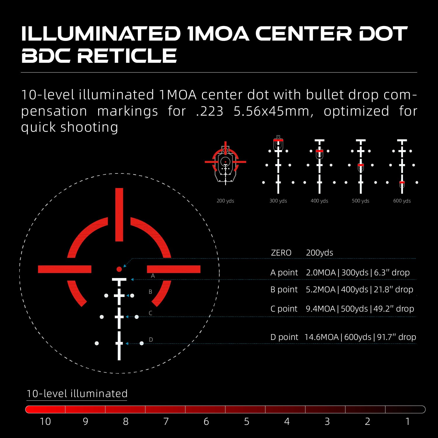 【Illuminated 1MOA Center Dot & BDC Reticle】: 10-level illuminated 1MOA center dot with bullet drop compensation markings for .223 5.56x45mm, optimized for quick shooting. Low-intensity settings are compatible with night vision, and the FMC coating ensures clear aiming, even without a battery