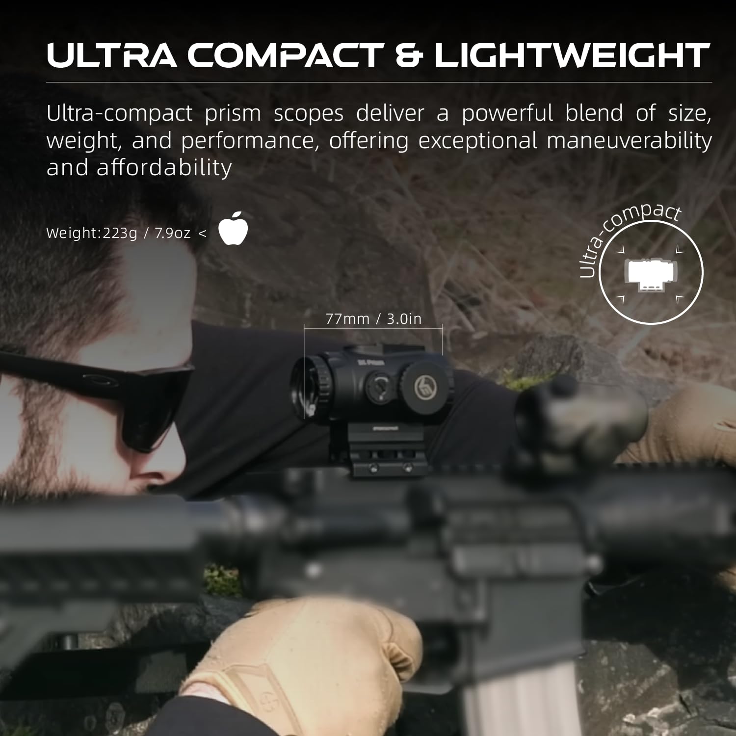 【Ultra-Compact & Durable】: Ultra Compact with expanded field of view,measuring just 77mm (3.0”) in length, with 223 g / 7.9 oz (Without Mount) this ultra-compact optic is built from 6061-T6 aluminum alloy, designed for .223 5.56x45mm cartridges, and rated IP67 water-resistant with impact protection up to 1000g
