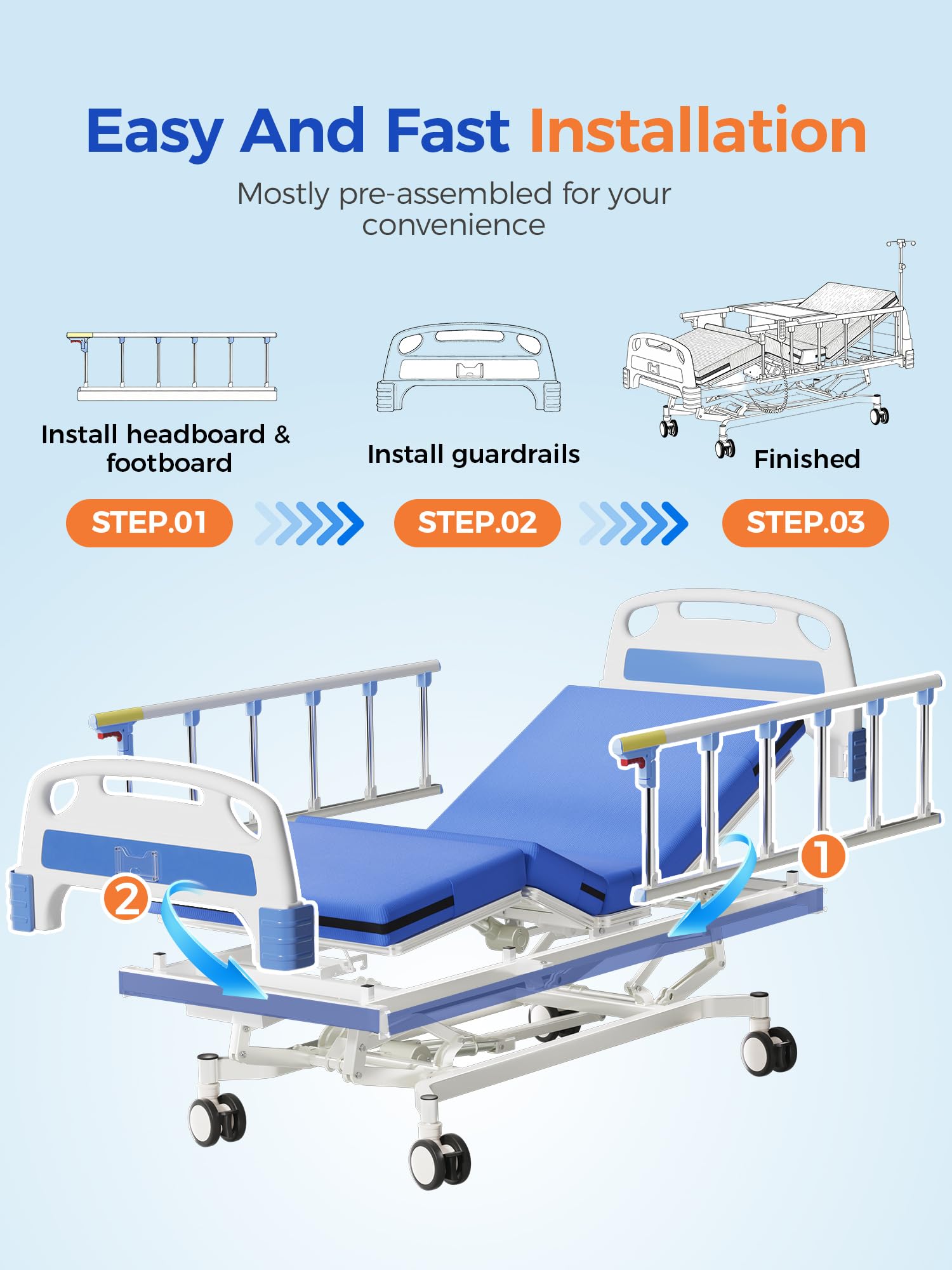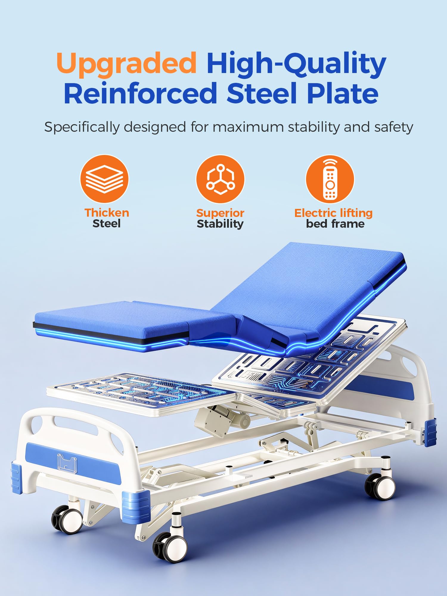 Reliable Comfort & Complete Functionality — Powered by three smooth and quiet motors, the bed offers effortless adjustment. It comes with lockable casters, a breathable high-density foam mattress, and a detachable dining table for everyday convenience