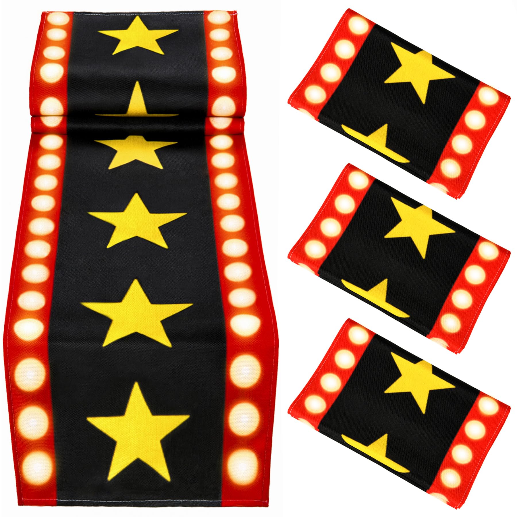 4 Pcs 13 x 72 Inch Movie Night Table Runner Red Movie Theme with Gold Star Design Movie Night Red Carpet Decoration for Movie Night Birthday Party Supplies(black) SIZE INFORMATION: the movie night table runner approx 13x 72 inches/33cm x 183 cm , The size is suitable for most party tables and can also be placed on the ground to be used as a party Carpet (be careful to prevent slipping) WIDELY DECORATION: Movie night party table runner can be decorated on the table, fireplace, on both sides of the door, on the floor and anywhere else you want to decorate Specifications: Material: leather,crystal diamonds,alloy Size: approx. 13x 72 inches/33cm x 183 cm Color: as shown in the picture Quantity:4 PCS Package includes: 4 Pcs 13 x 72 Inch Movie Night Table Runner Note: Please allow slight errors on size due to manual measurement. Please allow slight difference on color due to different monitor.