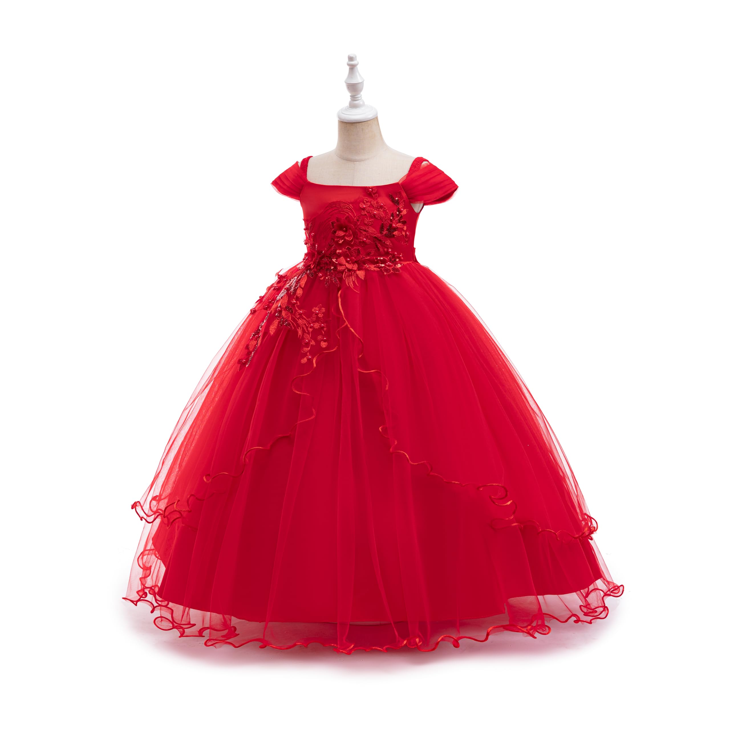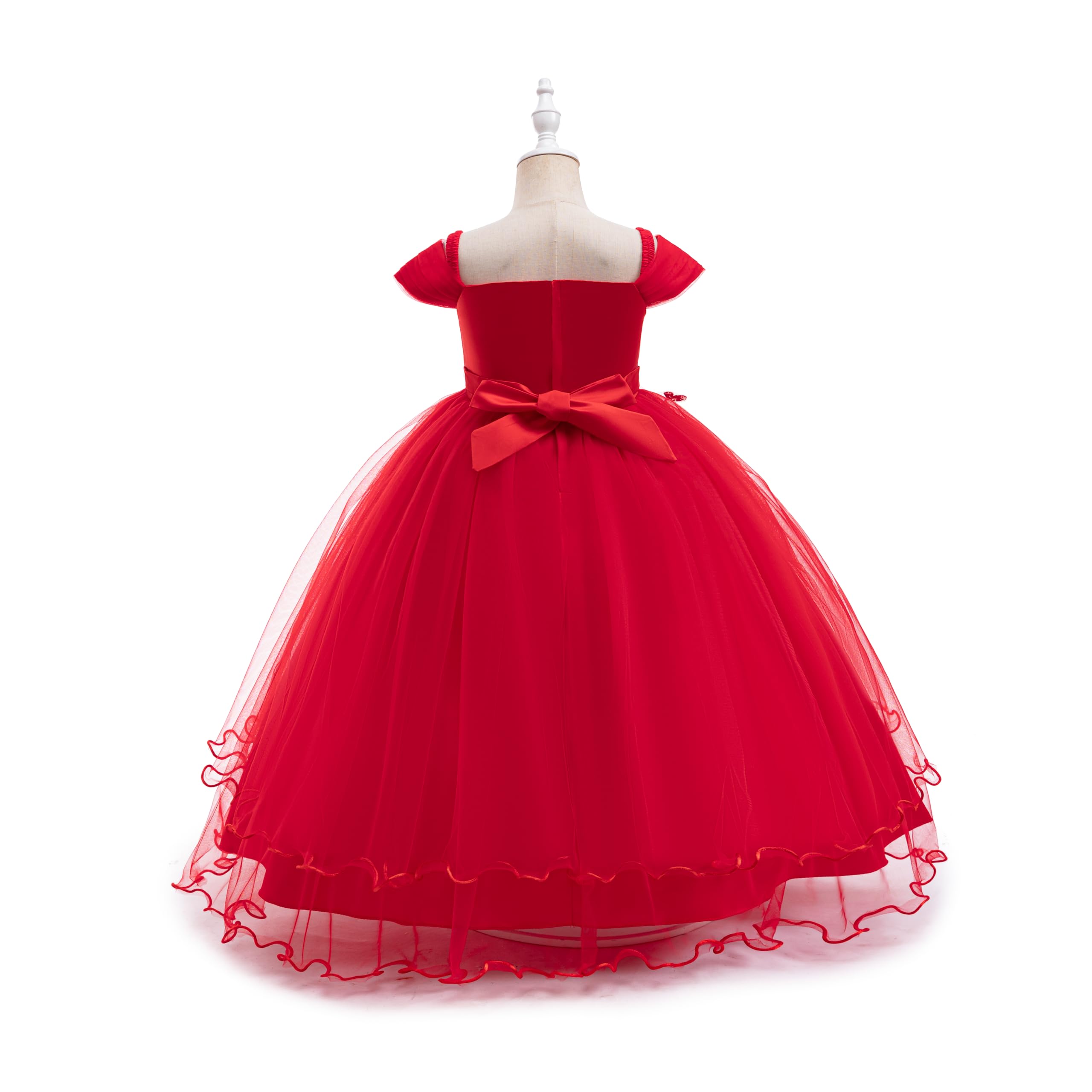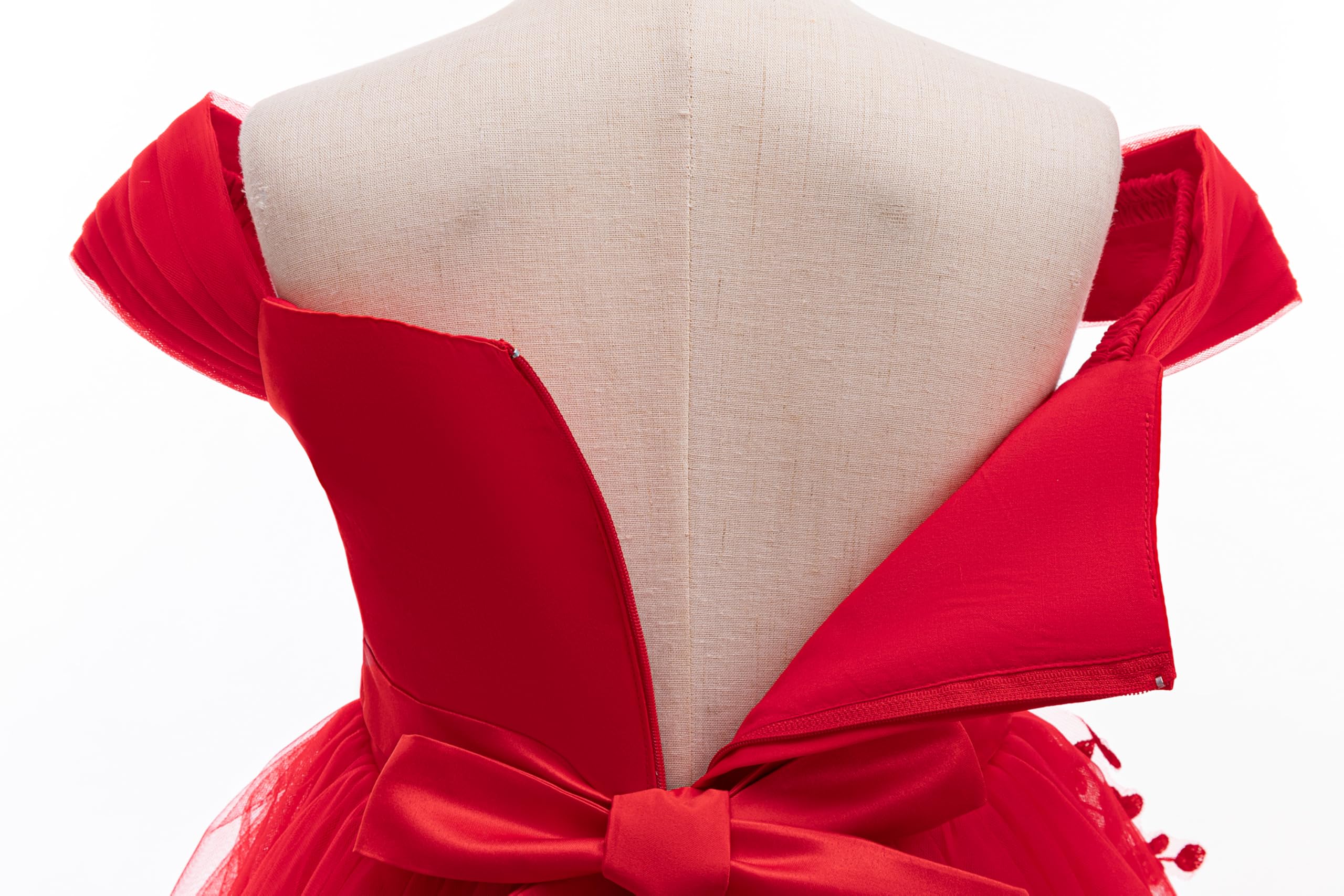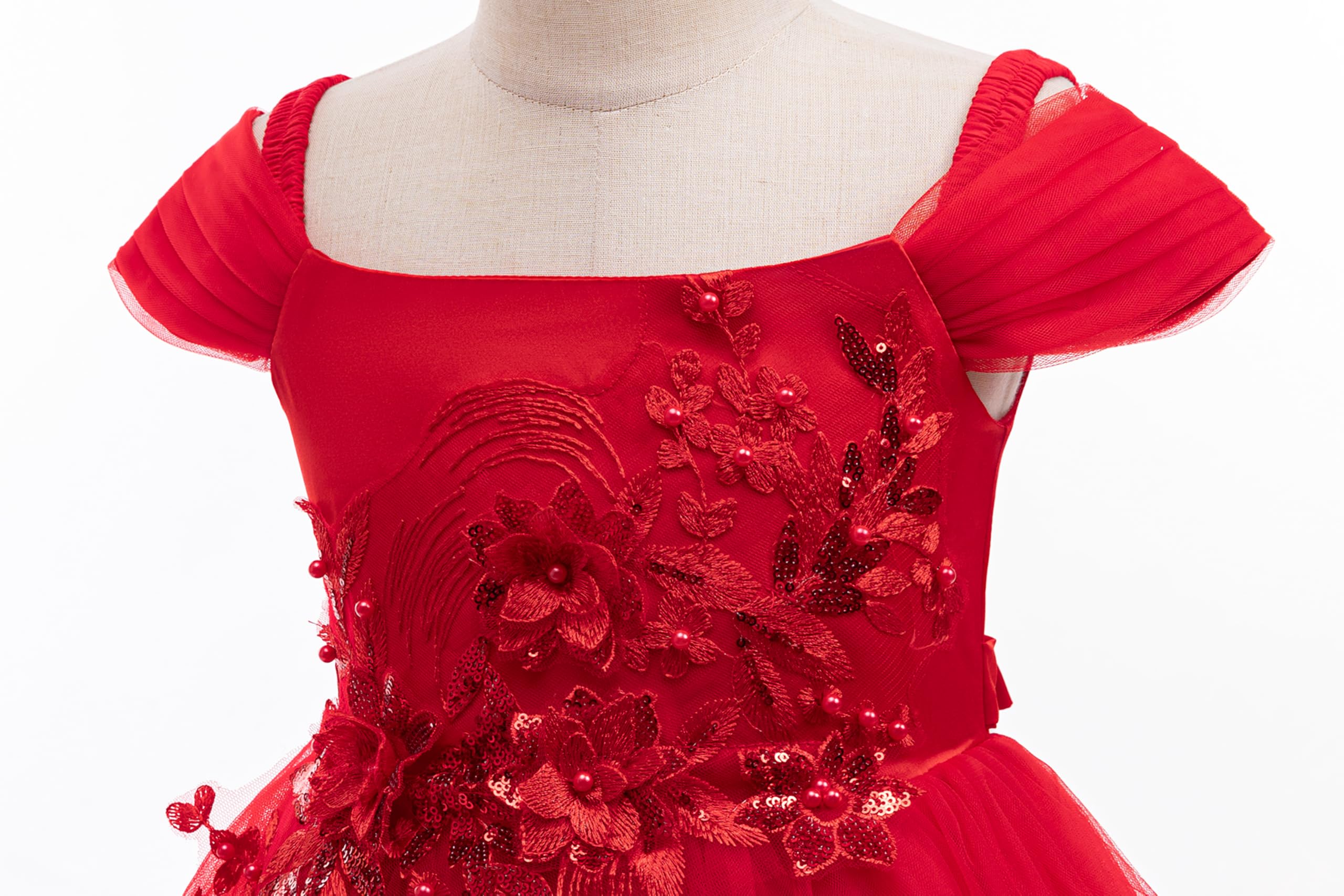Style: Weileenice bright red girls holiday party dress, elegant girls dress. 3D lace flowers, cold shoulder dress, ankle length, semi-fixed lace pieces, A-line maxi dress, hidden zip on the back, the sashes attached at the side seams can be tied a bowknot at the back. Classical elegant shoulder design, the shoulders have a fluffy tulle with elastic straps inside. Exquisite lace embroidery adorns the chest and waist, with delicate accents, multi-layer tulle make the dress more gorgeous