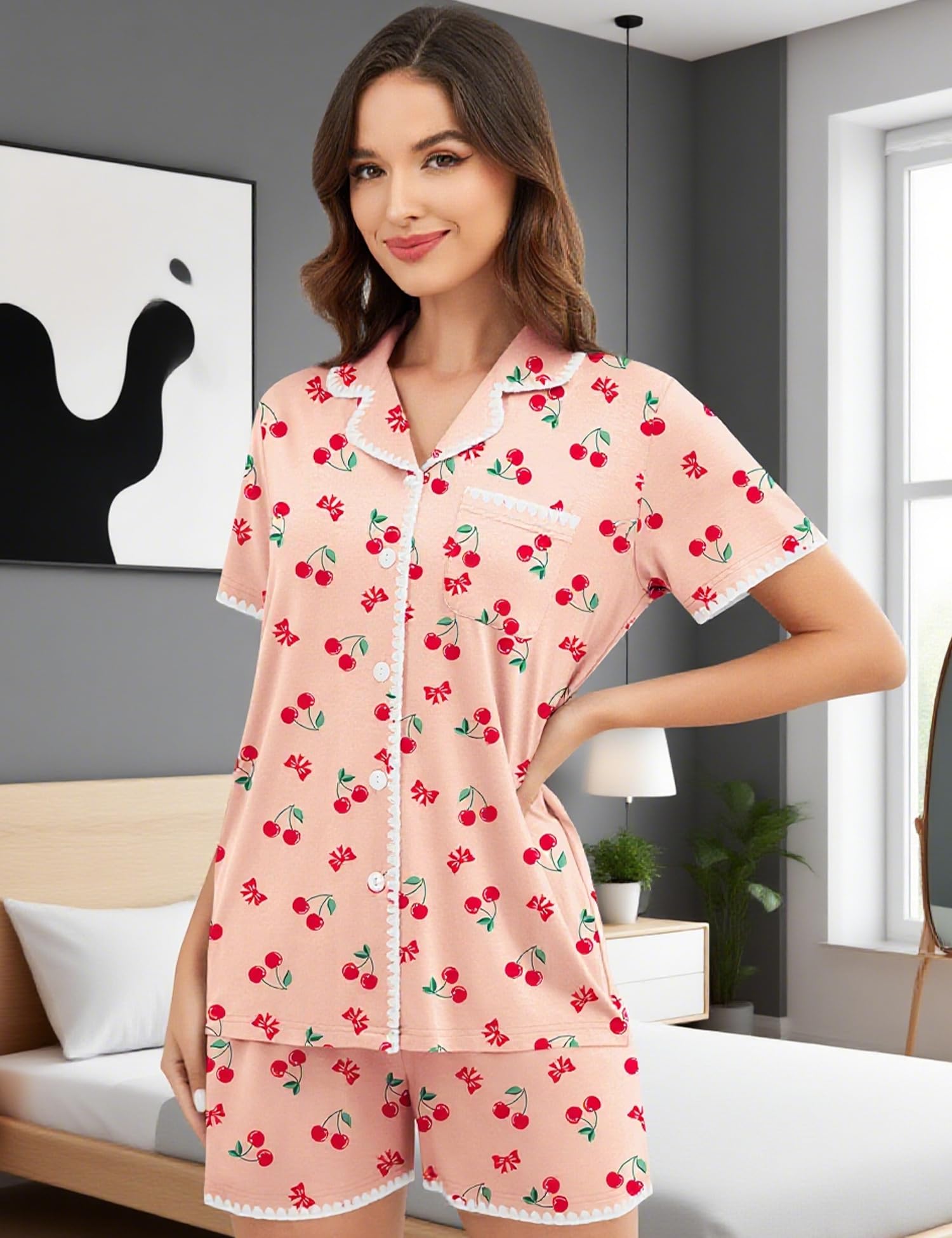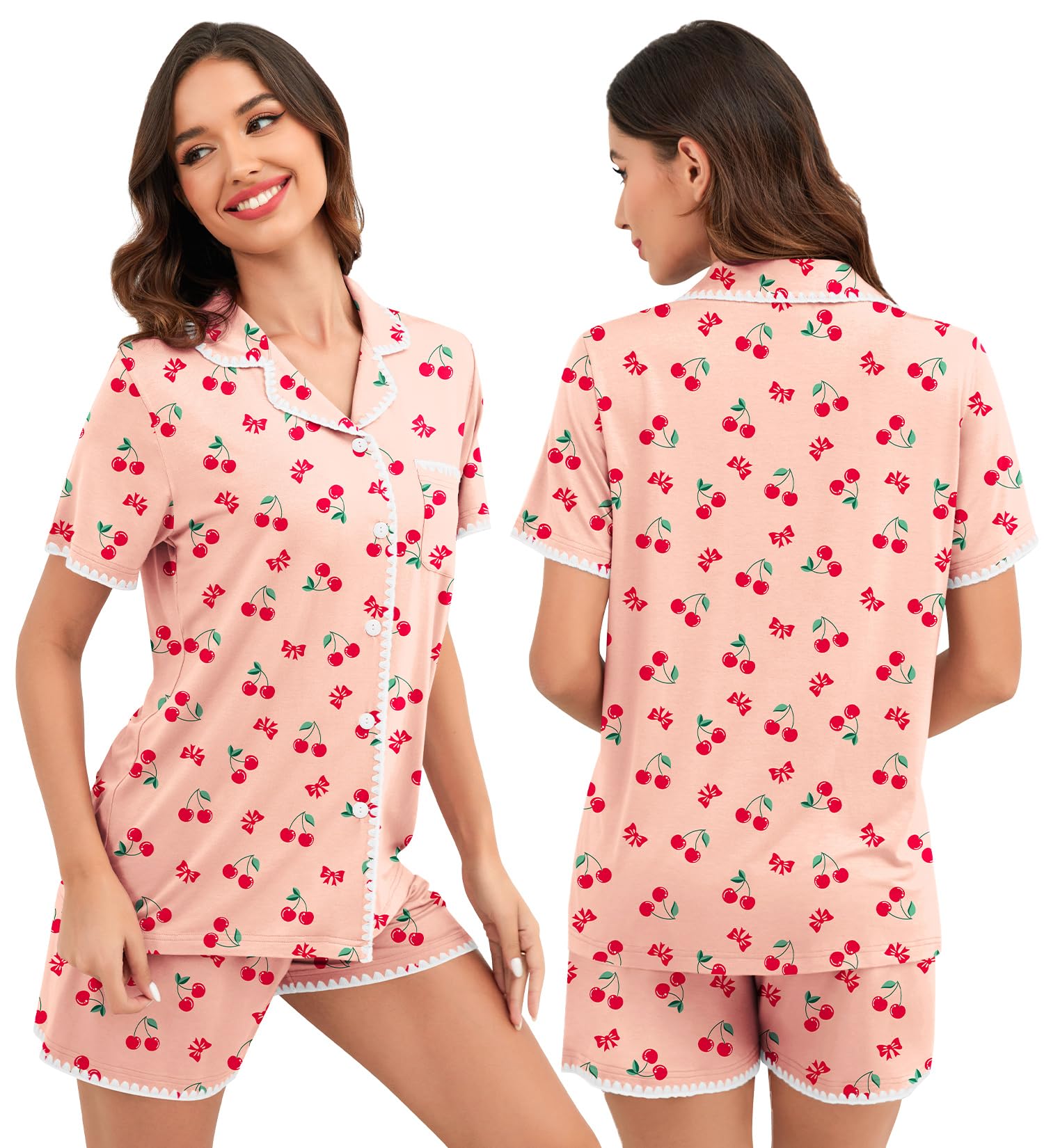 Pajama Tops: Short sleeve pajamas with notched collar, button front pajama shirt and convenient chest pocket for effortless style and convenience; To top it off, we added eye-catching hand-whipped piping on both the top and shorts for a cute, stylish look