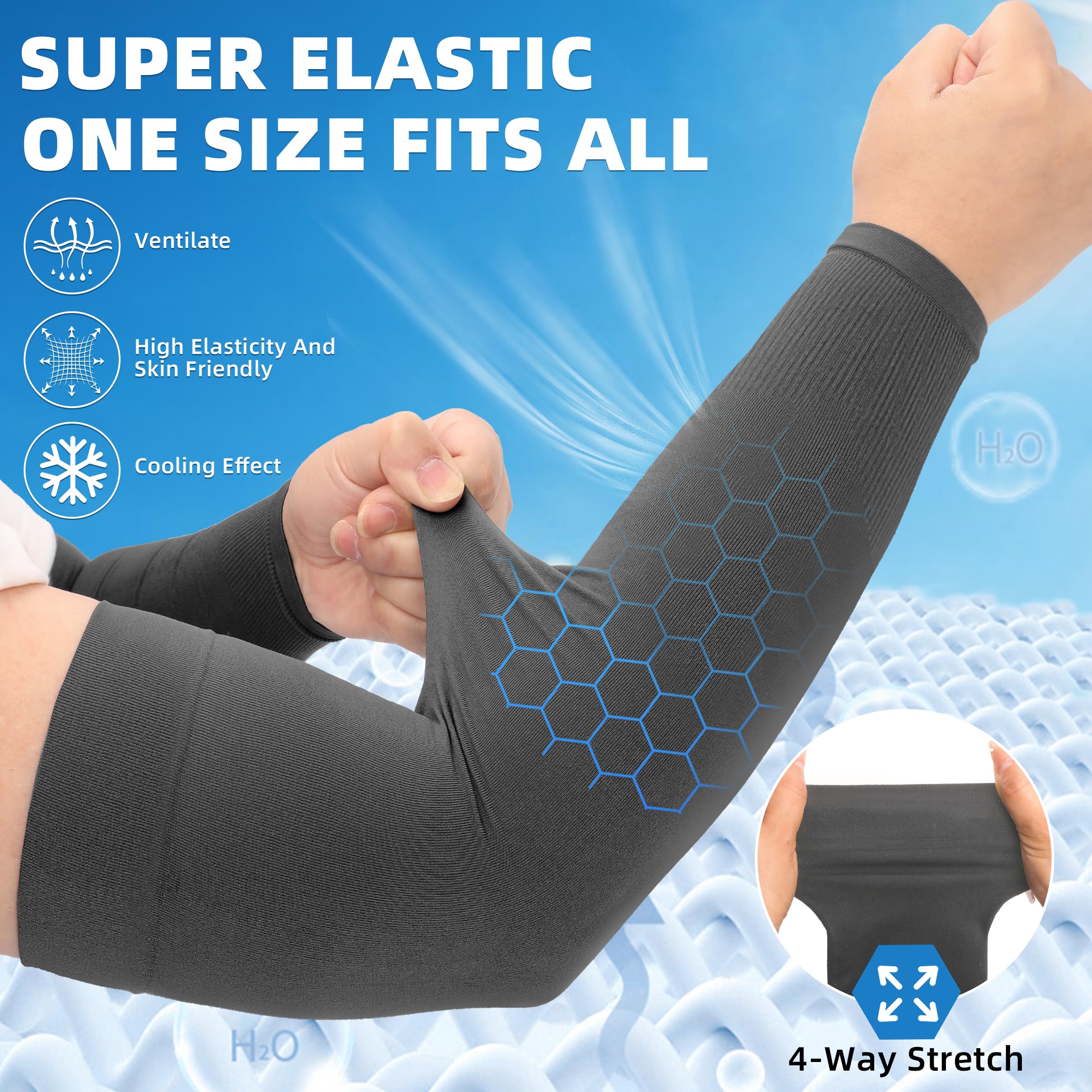 【Large Elastic Fit for Most】We broke the conventional cooling sleeves size and added elastic fibers, the length of the sun sleeves from 16.3 inches to 48 inches, and the width from 4 inches to 9.8 inches, can be stretched to the length you want, with high elasticity, it doesn't feel like it's strangling your arms when you wear it, and arm sleeves are more comfortable to wear. The arm sleeves circle of the upper arm has been designed to be widened to prevent slipping off during wearing.