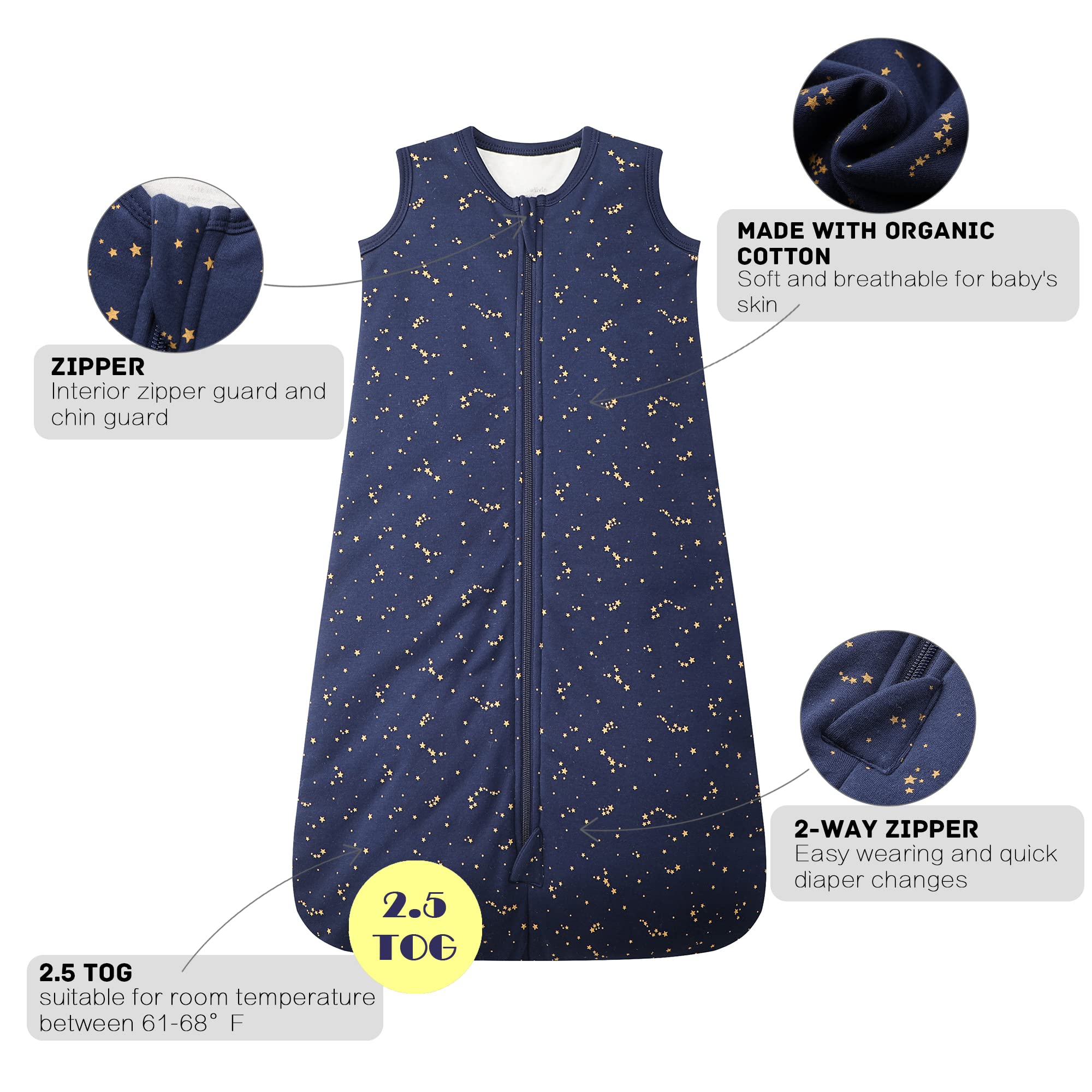 【Cozy and Comfortable】: Our baby sleep sack is designed to keep your little one cozy and comfortable in cool weather, with a 2.5 TOG rating that is ideal for room temperatures between 61-68°F. The sleeveless design helps reduce the risk of overheating, ensuring a sound and restful sleep for your baby.