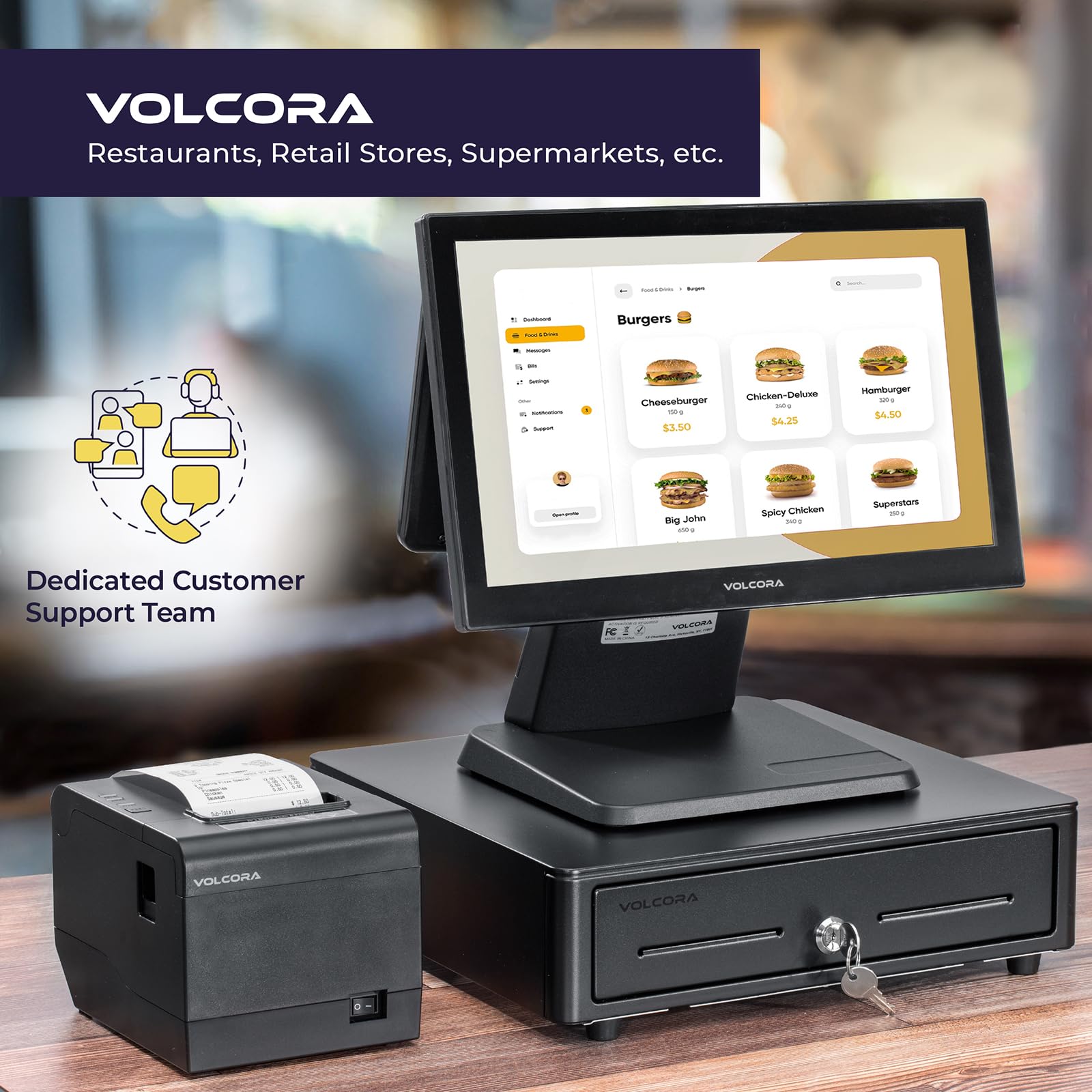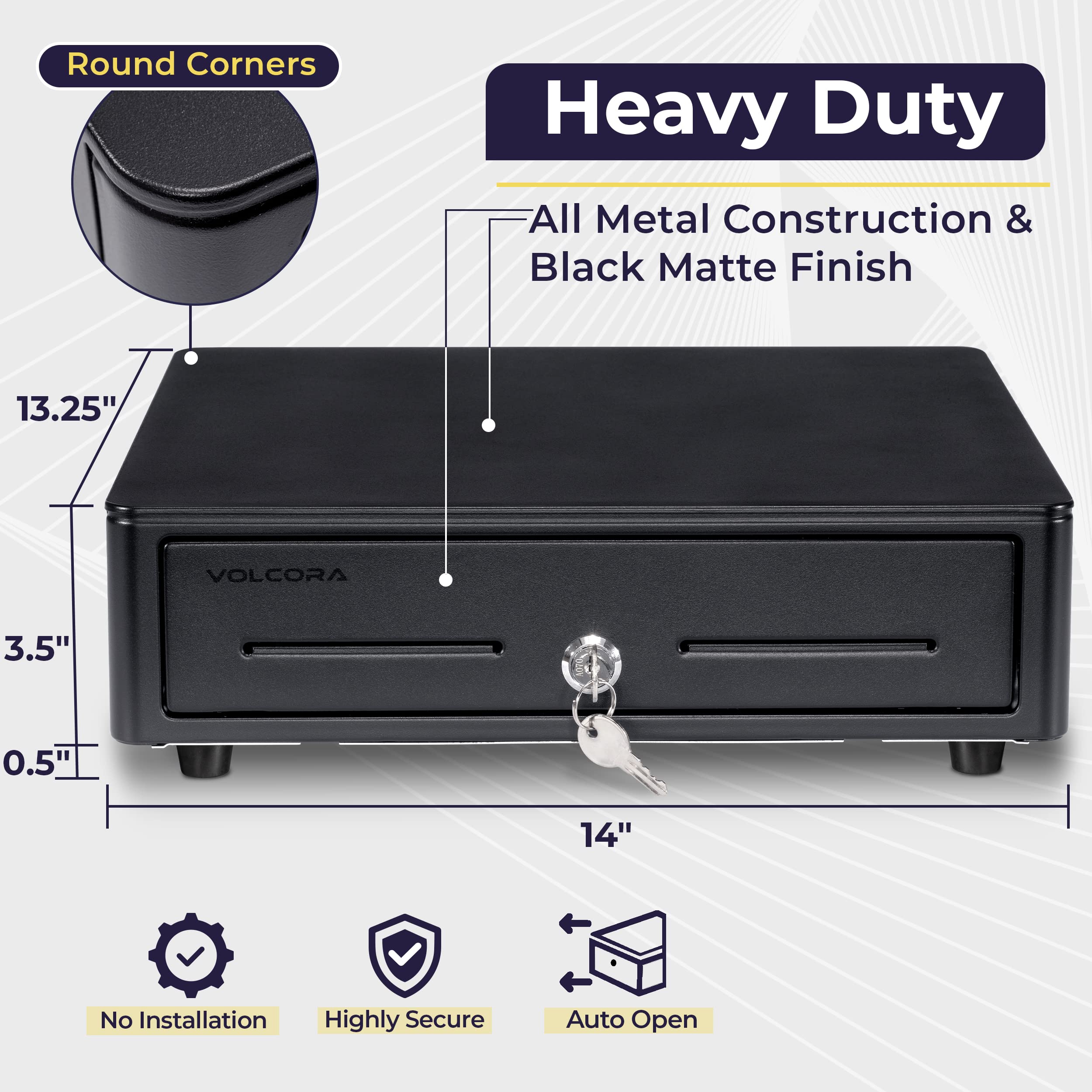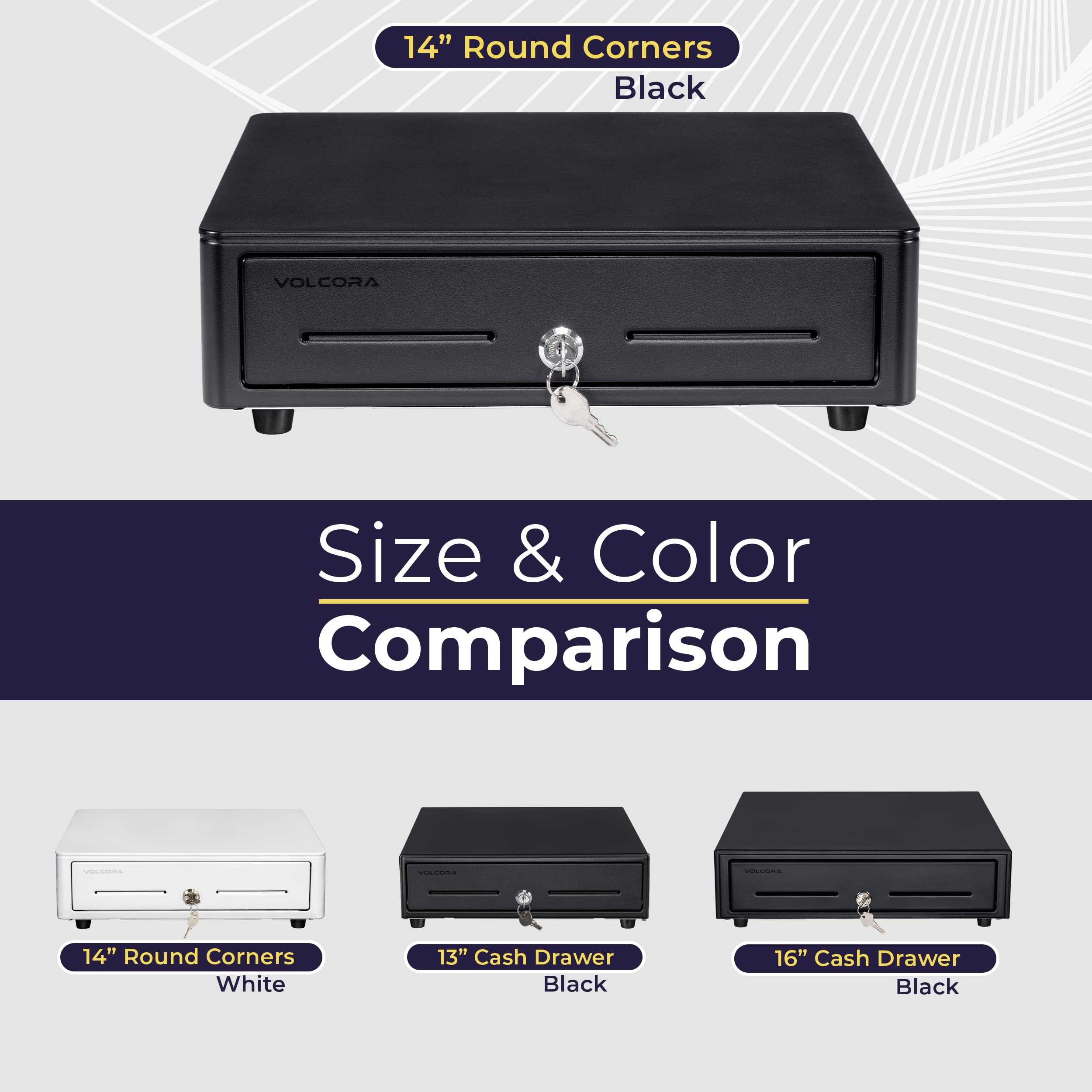 DURABLE POS CASH DRAWER: Volcora cash register drawer with round corners measures 14"x13.25"x4", Color: black, and Voltage: 24VDC. Our cash drawer has a heavy duty durable metal frame that is an ideal cash register for small businesses and even big establishments too.