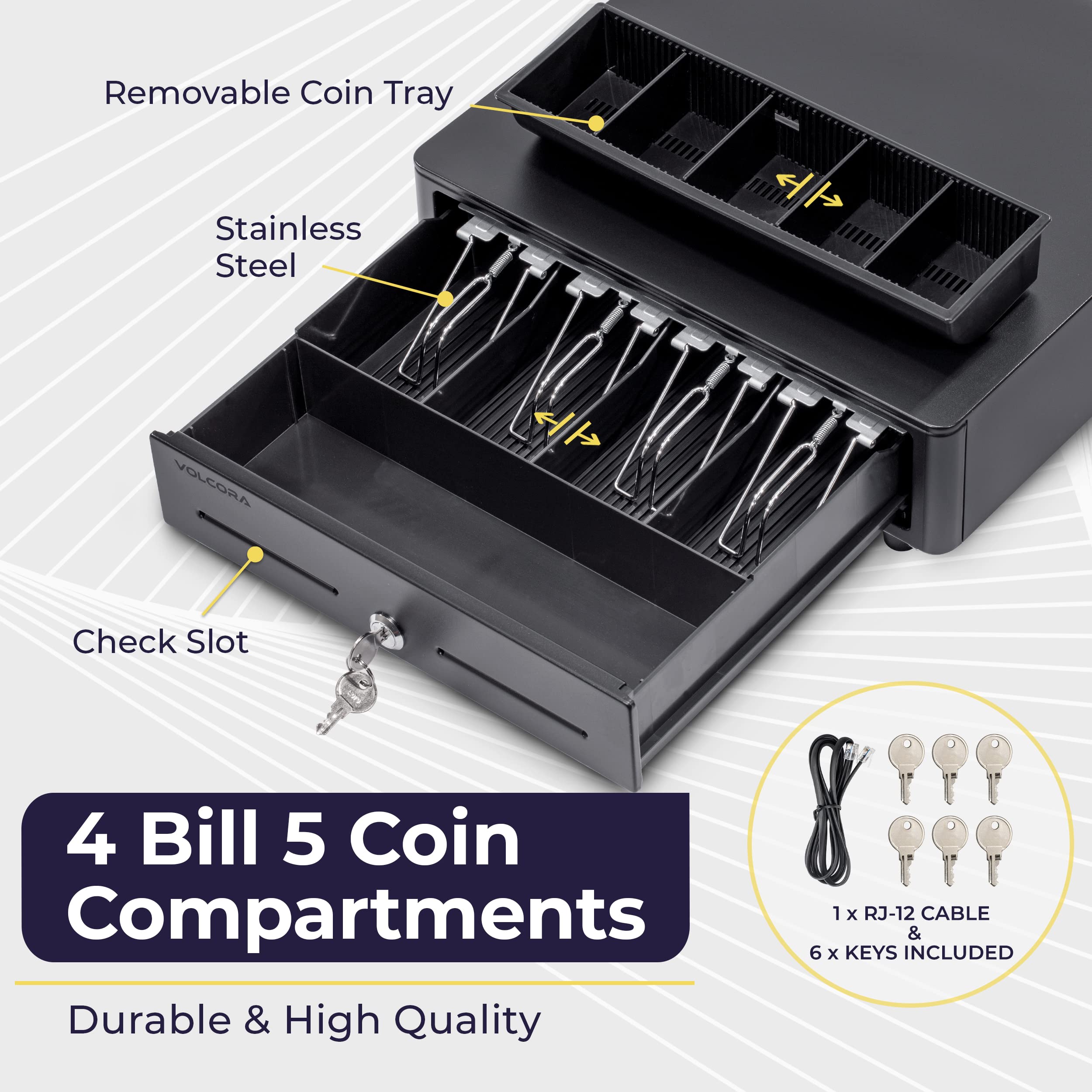 DURABLE AND RELIABLE CASH REGISTER DRAWER Cash drawers are one of the core components to every Point of Sale System. They may be the simplest part of your POS but making sure you have the right cash drawer is key. Volcora Cash Register Drawer is the perfect solution for applications that can be addressed with a heavy duty cashier drawer. It is designed for the most rugged environments. It is also a cost effective choice that doesn't sacrifice quality or dependability. Volcora Cash Register Drawer is competitively priced and includes features such as multifunction locks and drawer status reporting, found in more expensive cash drawers. PRODUCT FEATURES: Dimensions: Width: 14", Depth: 13.25" , Height: 3.5" (4" including removable rubber legs) Interface: driven by receipt printer via RJ11/RJ12 (Drawer Kick interface or DKD) 3 position Lock: 1-manual open, 2-auto open by printer/POS, 3-lock Design: Round Corners on all corners Color: Black No Bell Media Slots: Double Slot Type: 4 Bill / 5 Coin with removable coin compartment (not entire cash drawer tray) The package includes RJ11/RJ12 network cable to connect to your receipt / thermal printer. Total of 6 keys for backup. Ideal cash drawer for small businesses. Please take note that in order to work, the cash drawer should be connected to the printer first and not directly to POS. This cash drawer has no USB ports. OUR PROMISE: Volcora vouches for the quality of its products. If for any reason you are not satisfied with our offer, just let us know and we will make sure that you will walk away as a happy customer. Click "Add to Cart" now to get your CASH DRAWER WITH LOCK hassle-free!