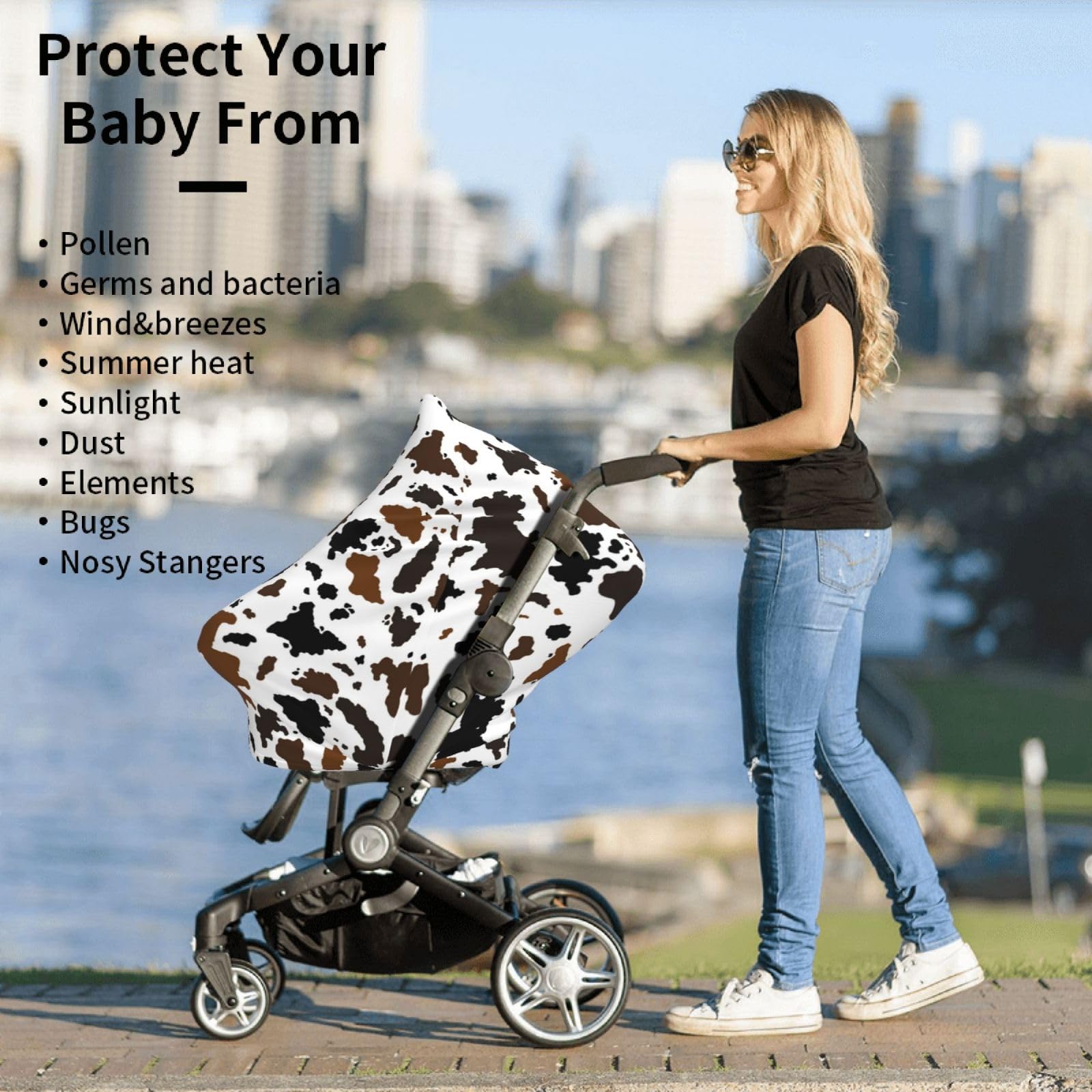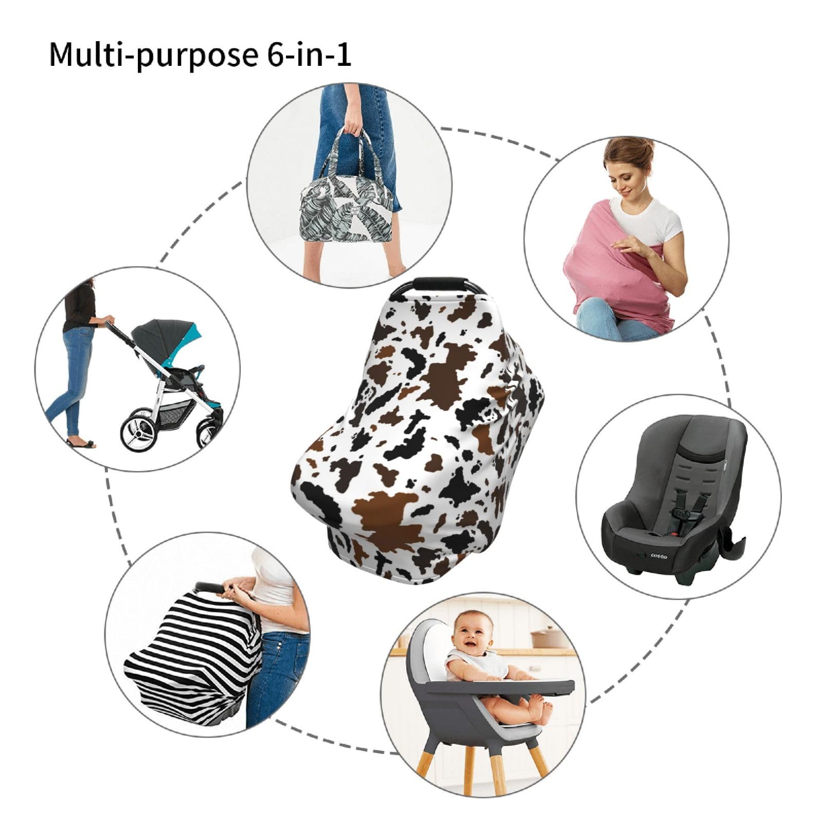 SOFT STRETCHY FABRIC: Our cow print car seat cover for baby features soft, breathable and stretchy premium quality fabric , It fit your baby car seat in just seconds (no need any zippers / snaps to clamp the carseat). Infinity tubular shape provides full coverage and enough space while nursing. Create a cooling, super soft and quite environment for your baby.