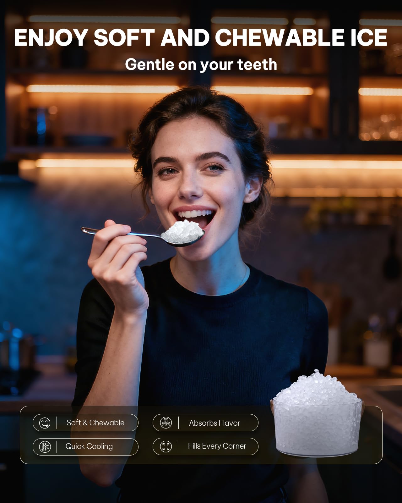 Rapid Pebble & Crushed Ice Production: Silonn pebble ice maker creates soft chewable ice cubes in 10 minutes and produces 44lbs/24h of crushed ice - ideal for smooth texture lovers. The upgraded compressor ensures continuous output for parties/offices without flavor dilution