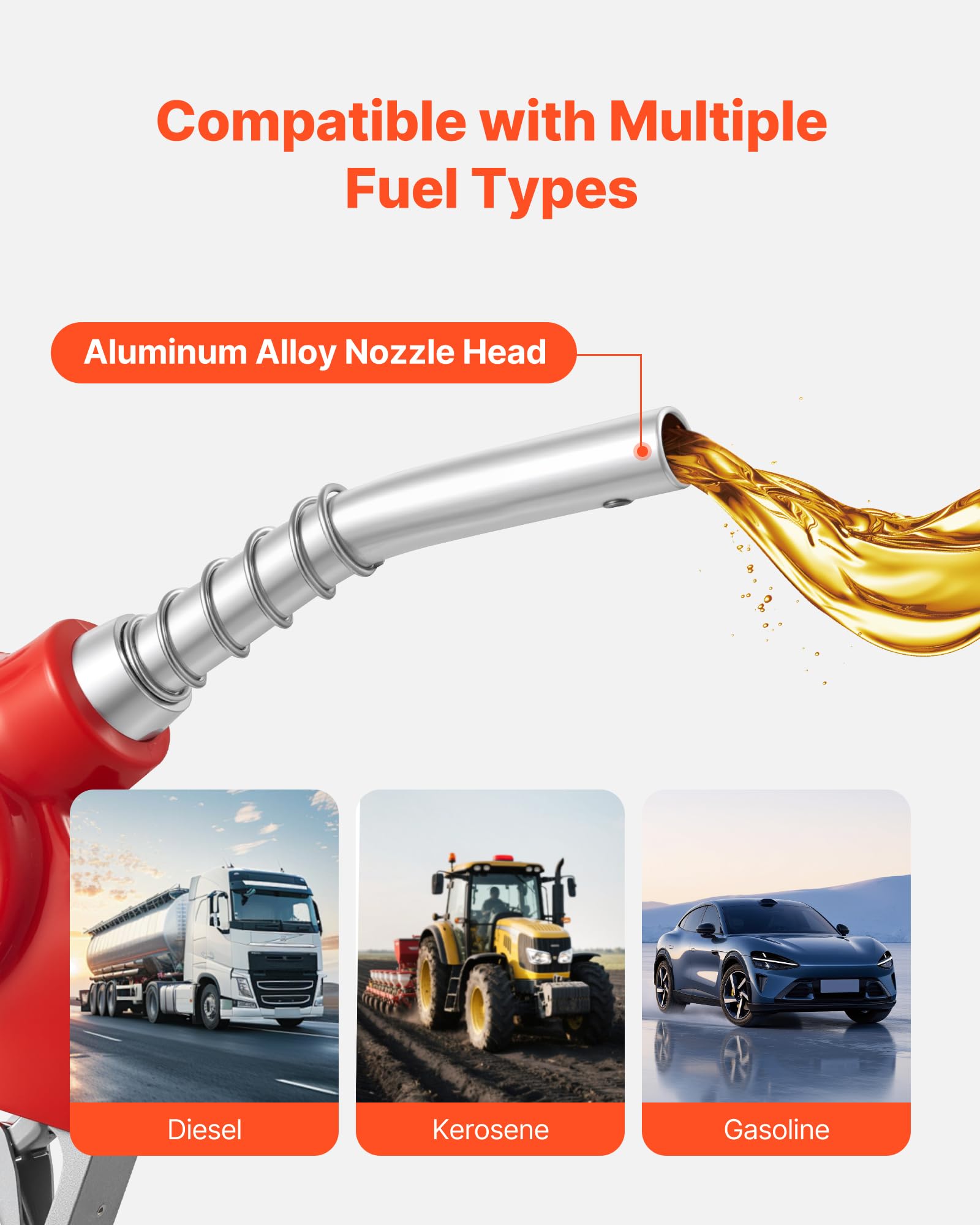 Automatic Shut-off: With a max flow rate of 12.6 GPM (Note: Reference only, linked to pump output), our gas nozzle delivers an efficient fueling process. It automatically shuts off when full and has a drip-free design to avoid leaks and waste