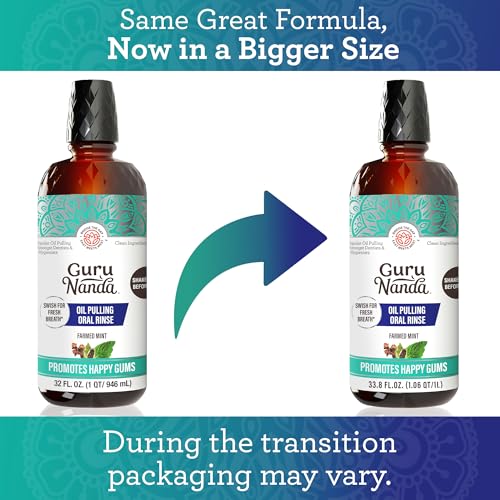 GuruNanda CocoMint Oil Pulling Mouthwash for Complete Oral Hygiene, 7 Essential Oils & Vitamins for Happy Teeth & Gums & Fresh Breath, Alcohol-Free, 33.8 Fl Oz/1L