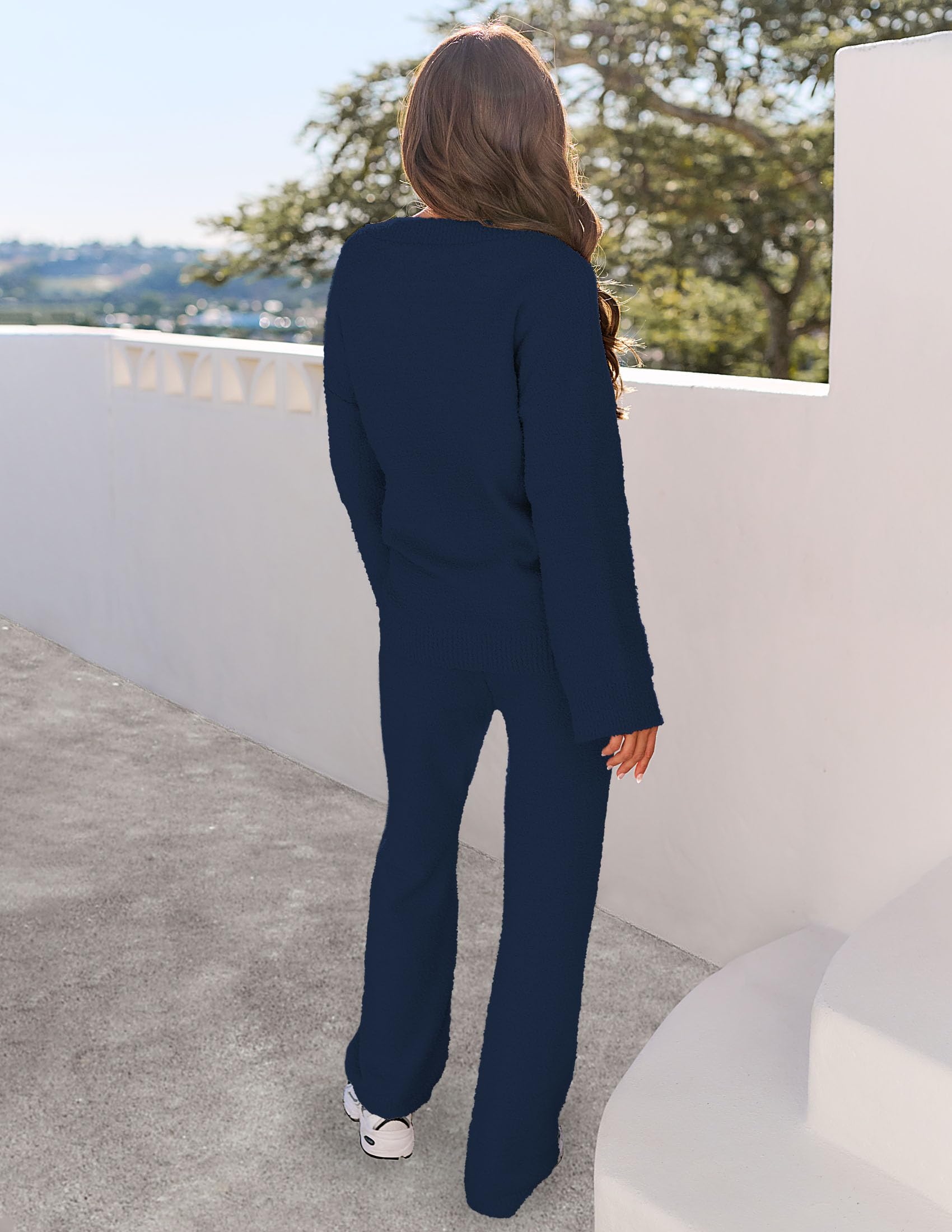 Feature: Fuzzy fleece fabric, long sleeve, v-neck, drop shoulder, high waist with adjustable drawstring, elastic waistband, soft plush set, loose sweater top, and wide-leg pants