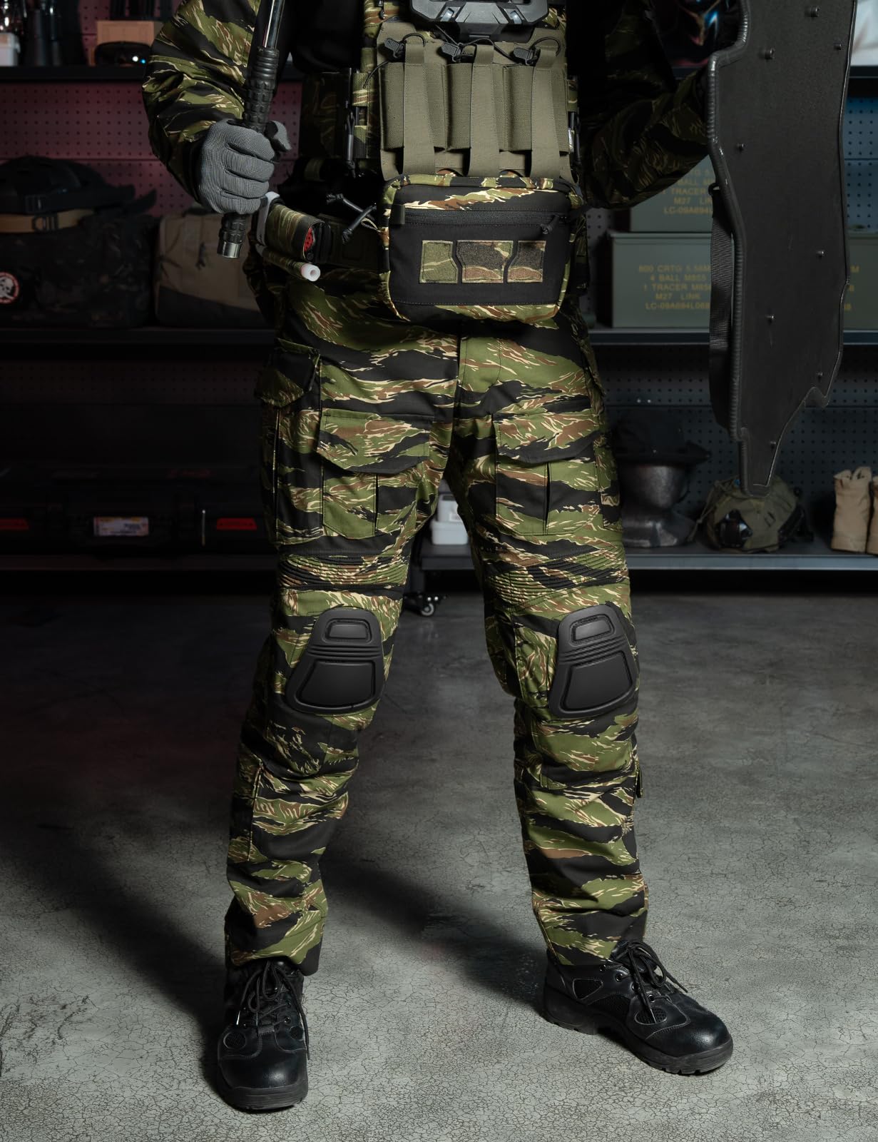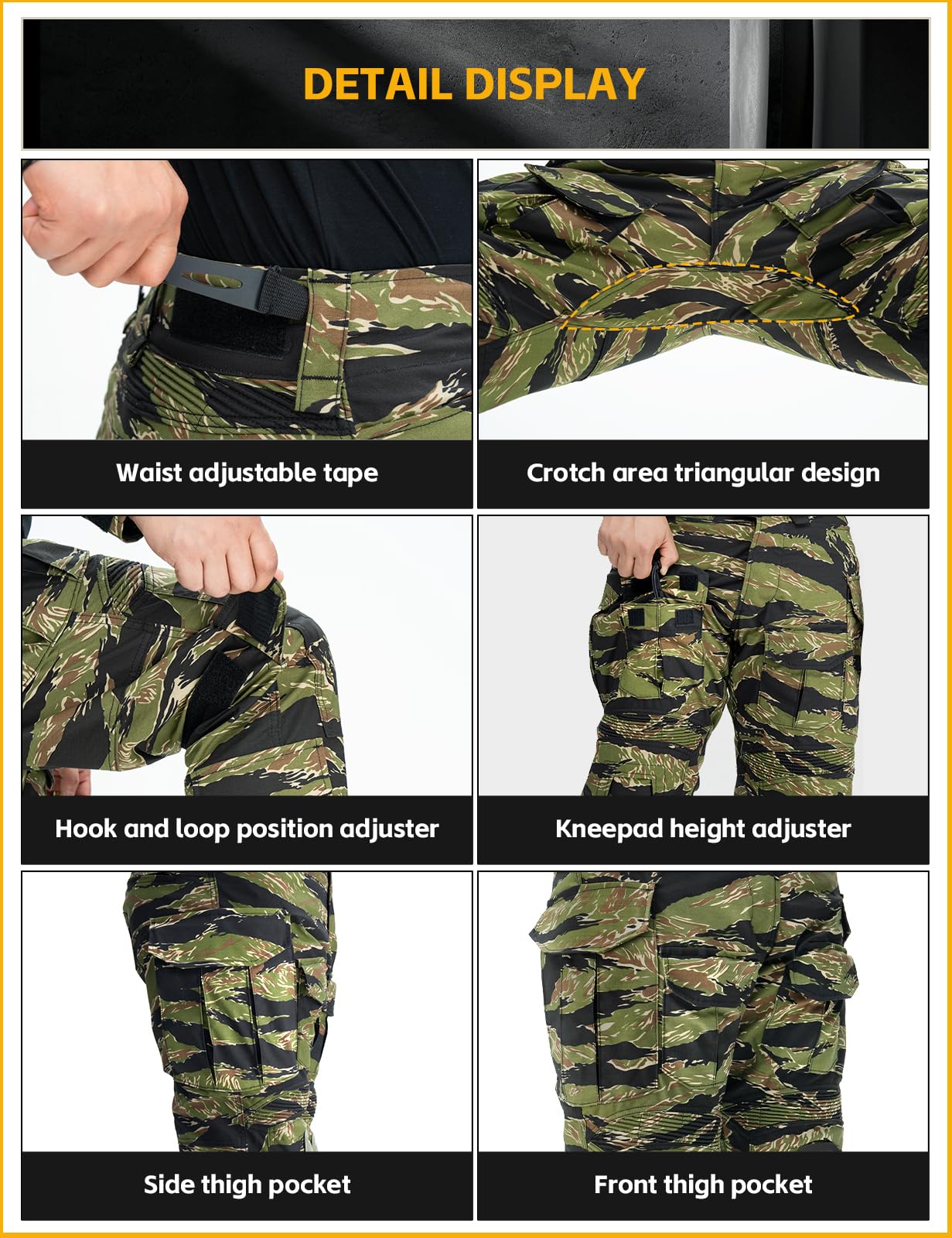 A PROFESSIONAL ARMY COMBAT PANTS: a) Come with a set of removable combat knee pads, when not using knee pads, just install the Built-in flap covers kneecap. b) Unique low-profile waist adjust system and knee pad height adjust system makes it very functional. And also with size adjustment at the back of waist, knee and ankle position.