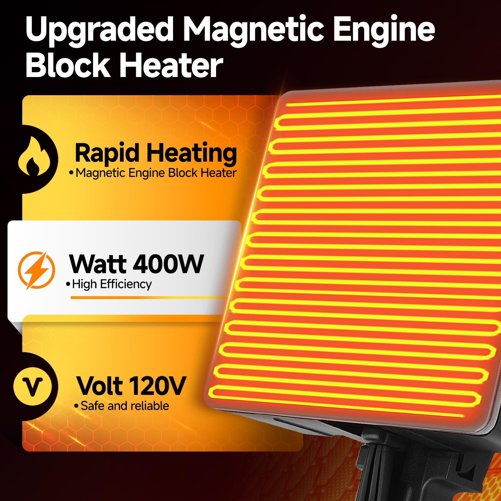 【Broad Application Scope】: The magnetic heater is an excellent option for heating engine blocks of all sizes—be they large or compact—across an extensive variety of vehicles and machinery. This list includes tractors, snowmobiles, motorcycles, snow blowers, generators, and agricultural equipment, in addition to oil pans, transmissions, and hydraulic systems. Furthermore, it proves ideal for machinery maintenance and repair tasks.