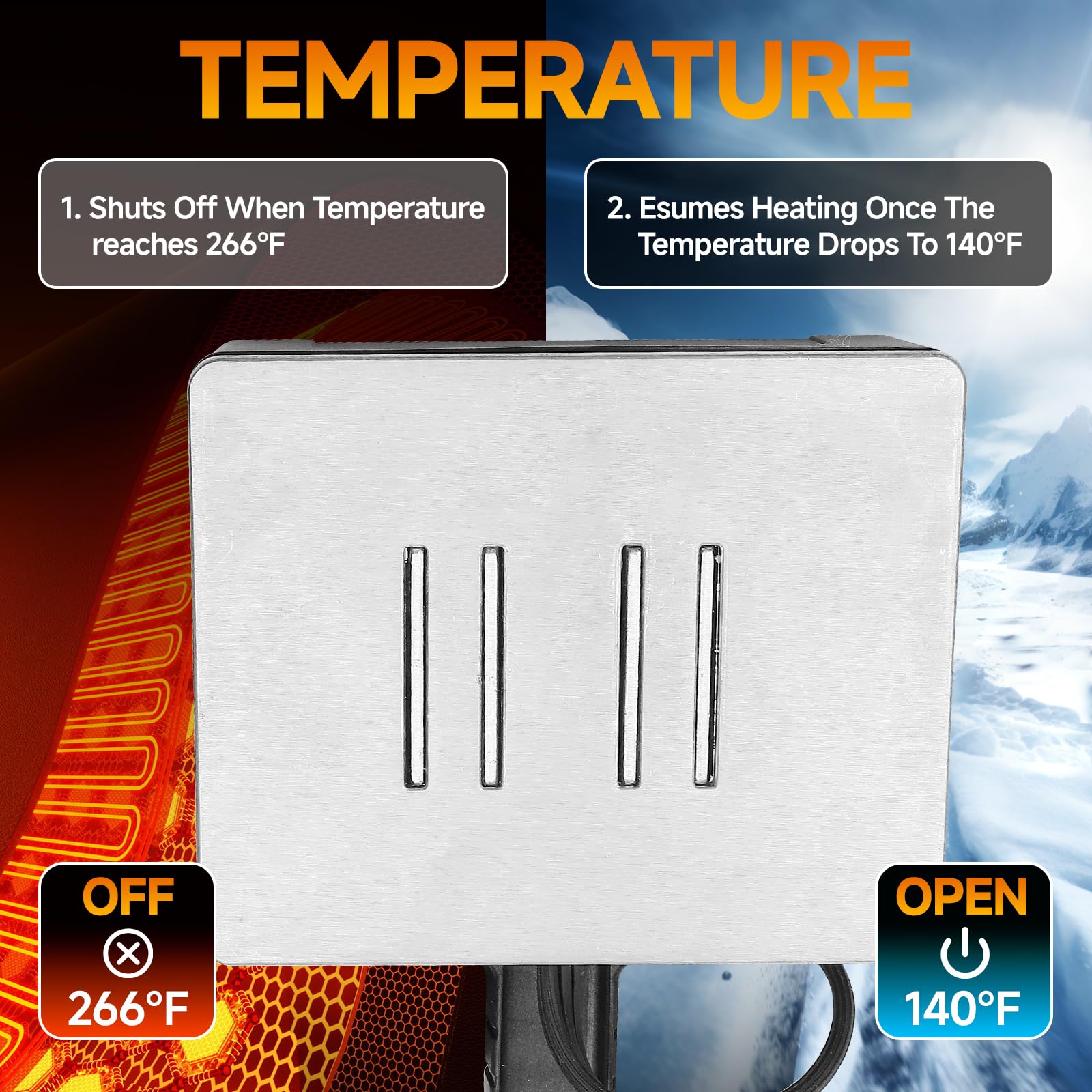 【Smart Temperature Regulation】Equipped with a built-in thermostat, the magnetic heater provides reliable overheating protection through intelligent operation. It automatically powers off when the temperature reaches 266℉ and resumes heating once the temperature drops to 140℉, ensuring safer and more dependable performance throughout its use.
