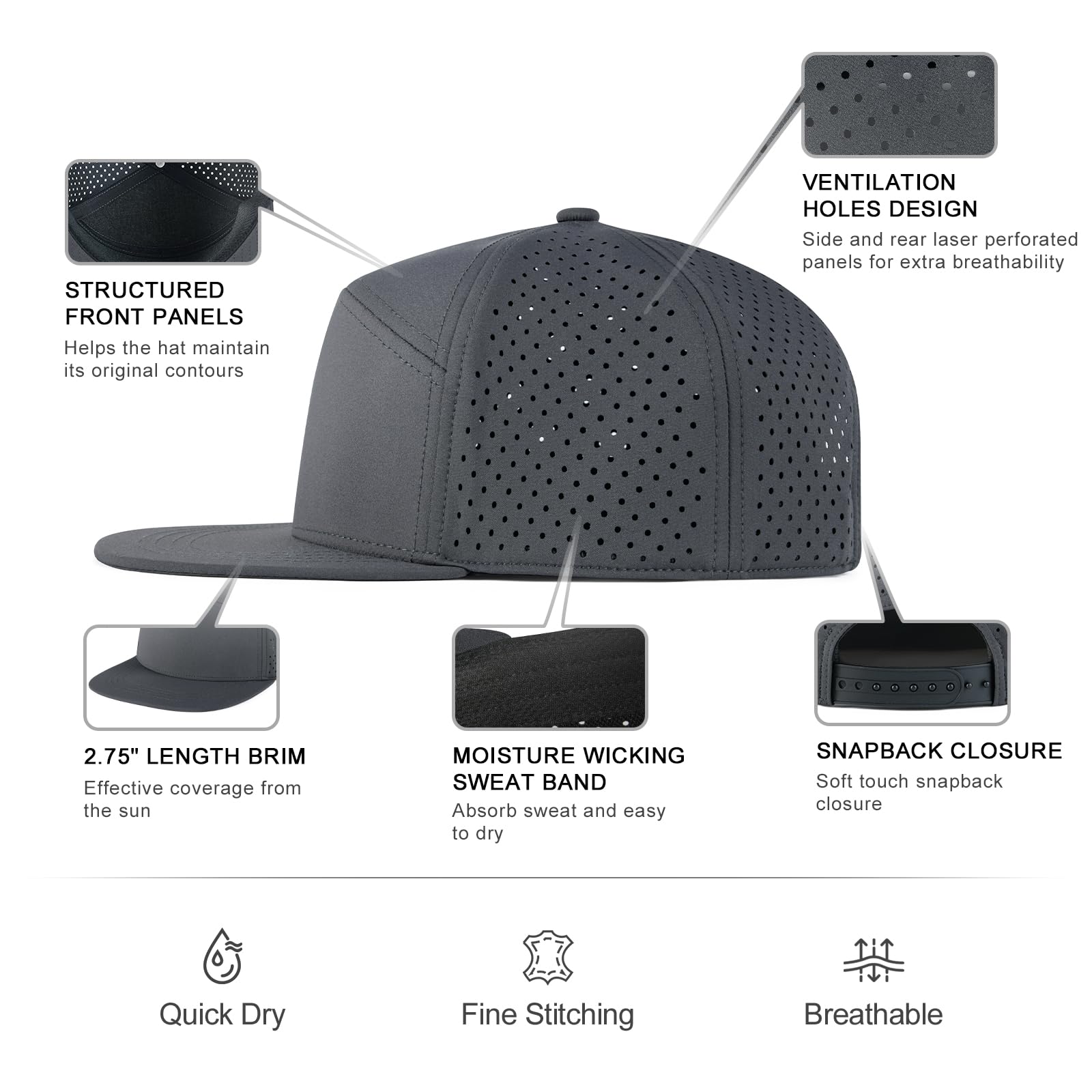 High Performance: Flat brim to keep out of the sun, structured front panels and mid crown to maintain shape; Laser cut holes ensures your head breathable, classic adjustable snapback closure to let your head fit better