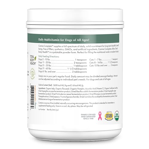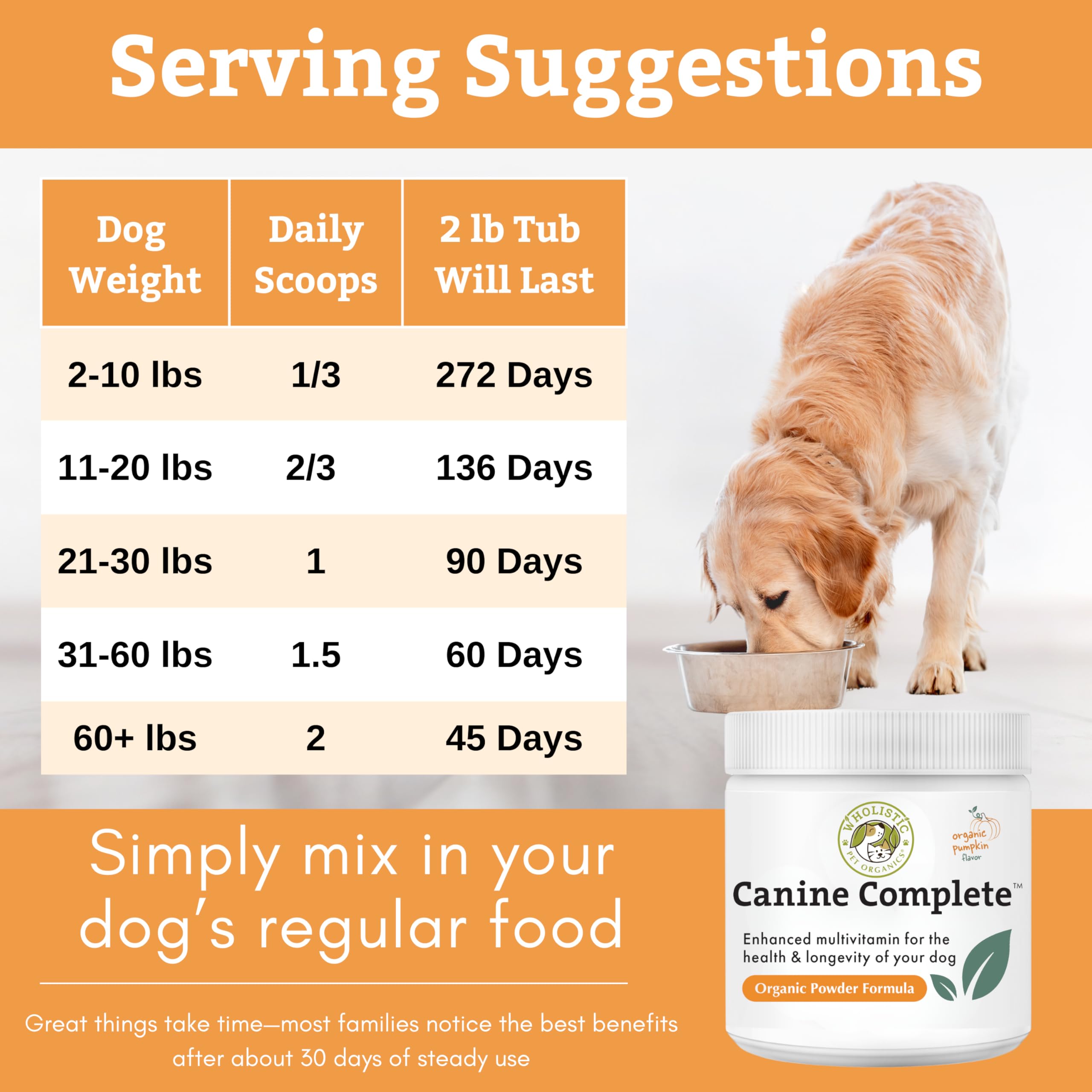 Advanced Dog Multivitamin with Pumpkin: Your pets health is our top priority, Canine Complete features a unique blend of organic vitamins for dogs, including probiotics and pumpkin for digestive health. Our easy to use additive fills the nutrition voids in modern pet foods.