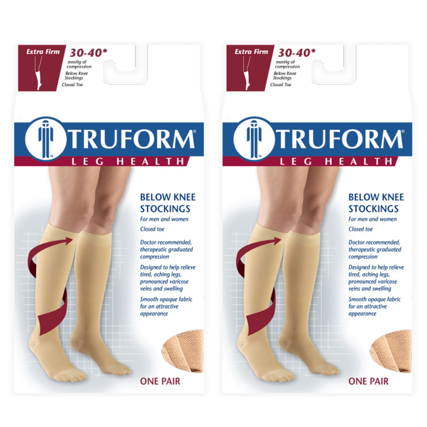 Truform 8845 was created to help relieve conditions associated with poor circulation. Graduated compression technology delivers a compressive action to the leg that is greatest at the ankle, then gradually decreases toward the heart. The 30-40 mmHg very firm compression level is great for post surgery and severe edema, varicose veins, spider veins, hypotension, post thrombotic syndrome (PTS), post sclerotherapy, and more. Truform therapeutic medical stockings feature classic styling and a smooth knit fabric that helps conceal unsightly conditions. The closed toe offers a more natural stocking feel. Color options are basic neutrals for all-occasion wear. Truform stockings, socks and pantyhose feature Graduated Compression Technology, which delivers a compressive action to the leg that is greatest at the ankle, then gradually decreases toward the heart. Graduated compression provides two primary benefits: it helps reduce and prevent swelling for the wearer, and the compression action help to prevent the slowing of blood flow so it can flow more quickly up the leg back toward the heart. Truform graduated compression support hosiery helps maintain positive circulation and leg health. We take the extra time and effort necessary to insure a therapeutically effective, comfortable fit. The combination of state-of-the-art materials and equipment, plus knitting "know-how" sets Truform apart from the crowd to make your legs look and feel great.