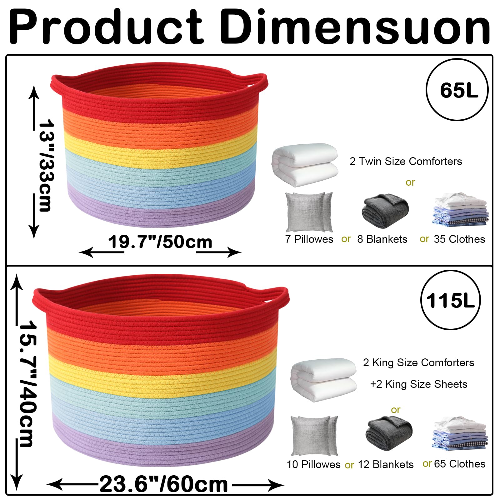 【115L Extra Large Capacity】This 23.6"L x 23.6"W x 15.7"H basket is perfect for storing throw blankets, pillow, cushions, clothes, towels,toys and stuffed animals.It can also add a nice style to your living room, bedroom, laundry room, nursery or any room